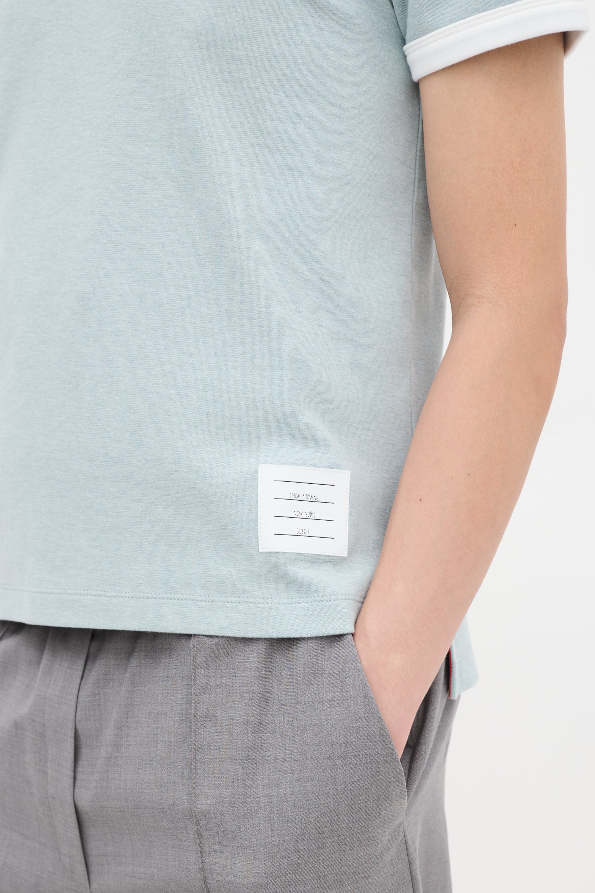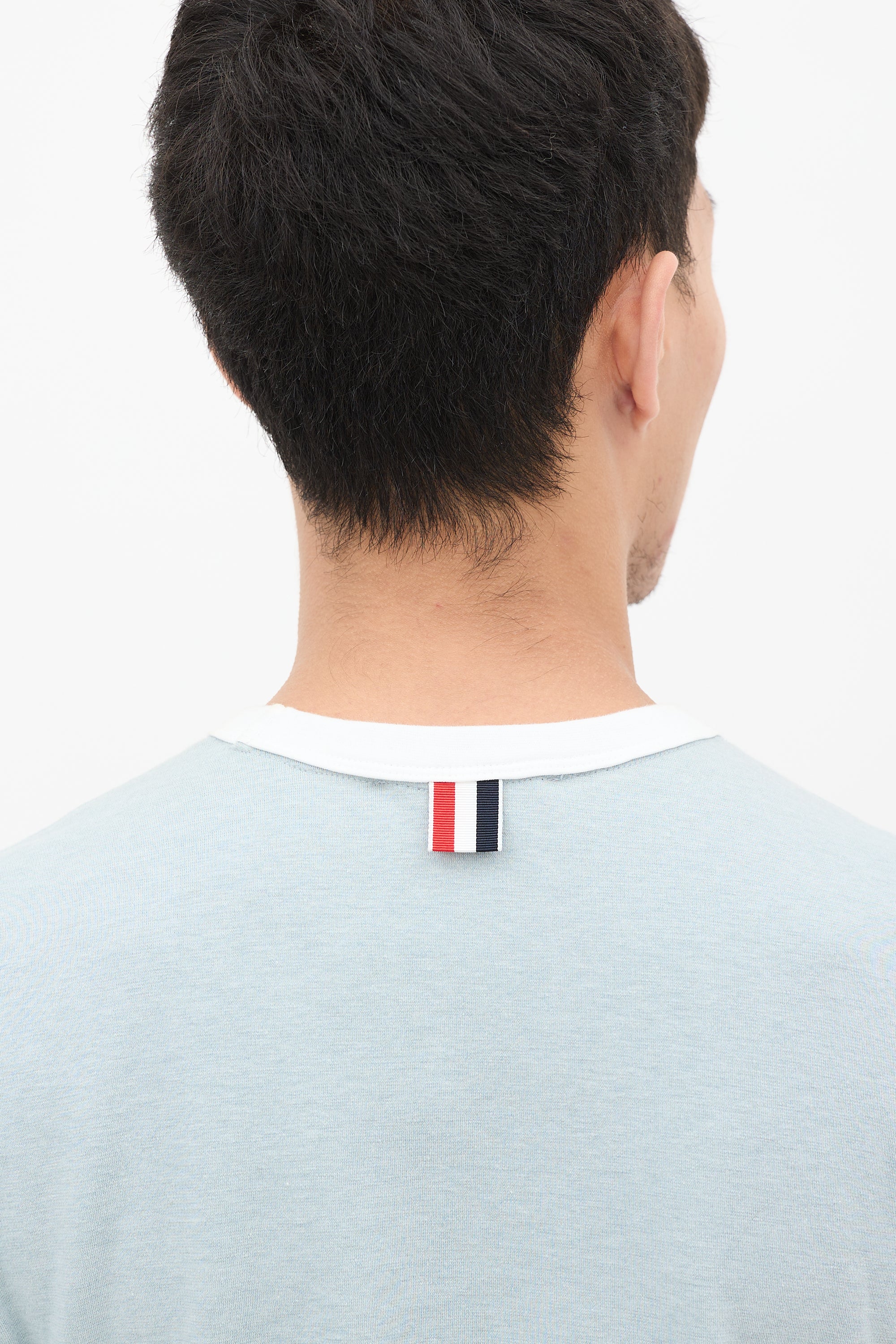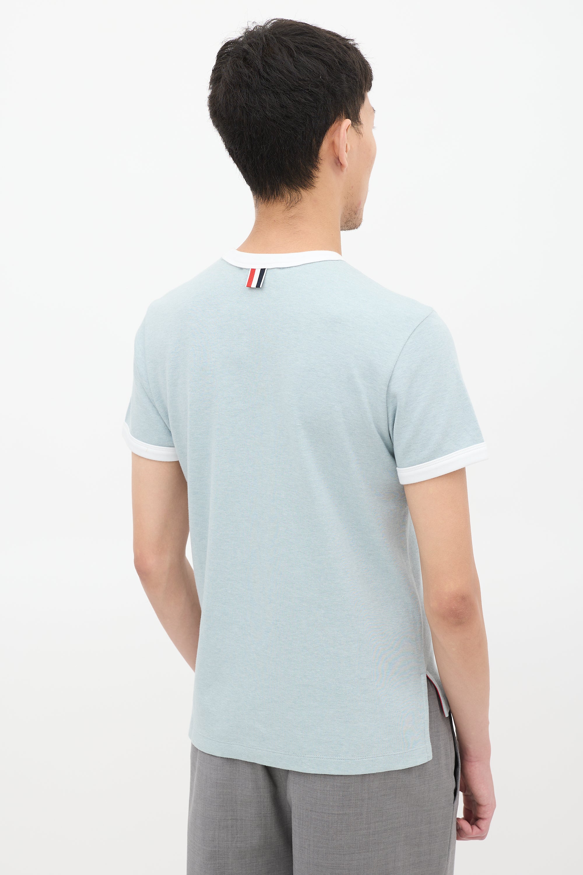 Pre-owned Thom Browne light blue ringer T-shirt featuring a round neck, signature tricolour grosgrain ribbon detail at back neck, white label at front left hem, split sides, high low hem, short sleeves, and white contrast trim at neck and cuffs. Sample.