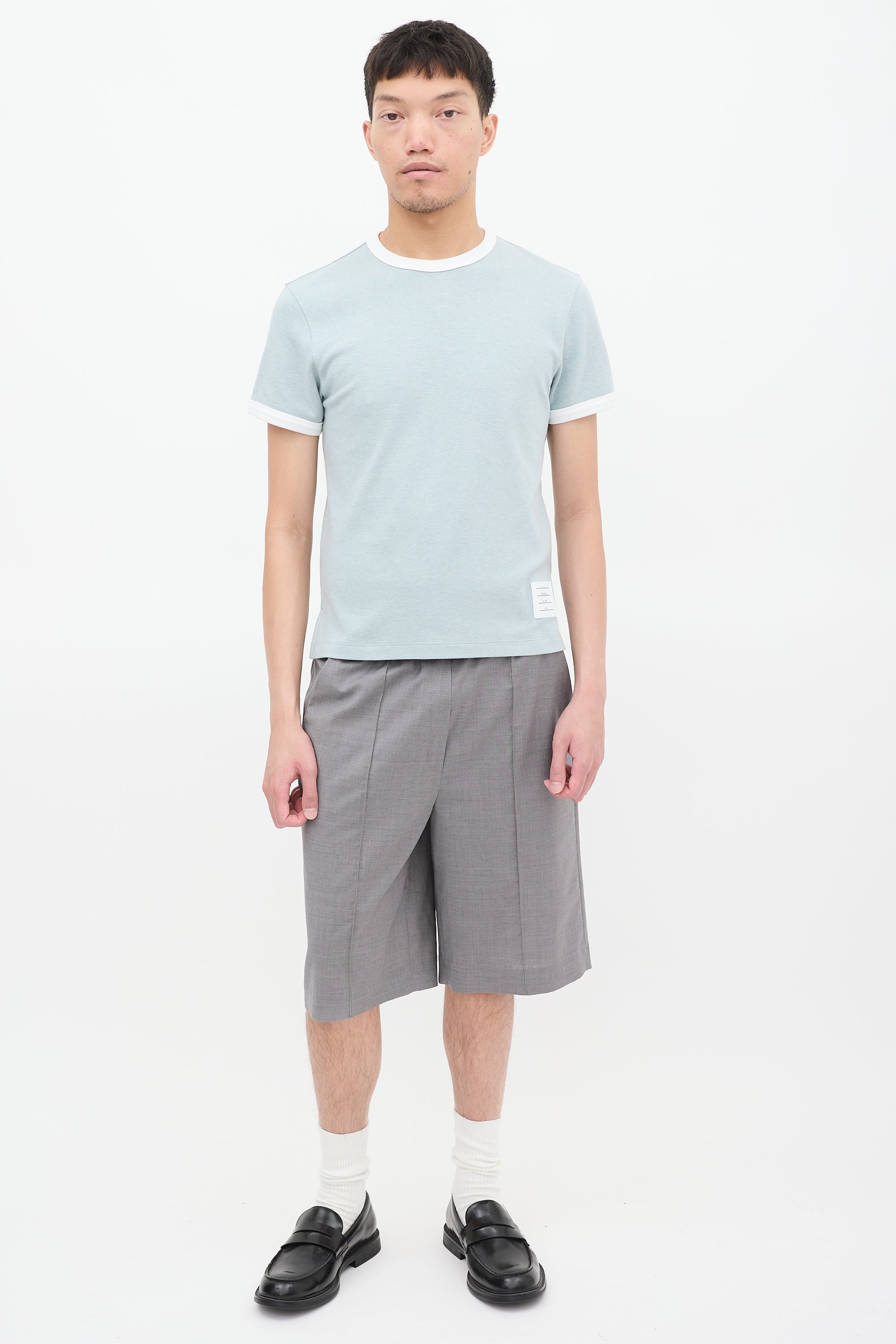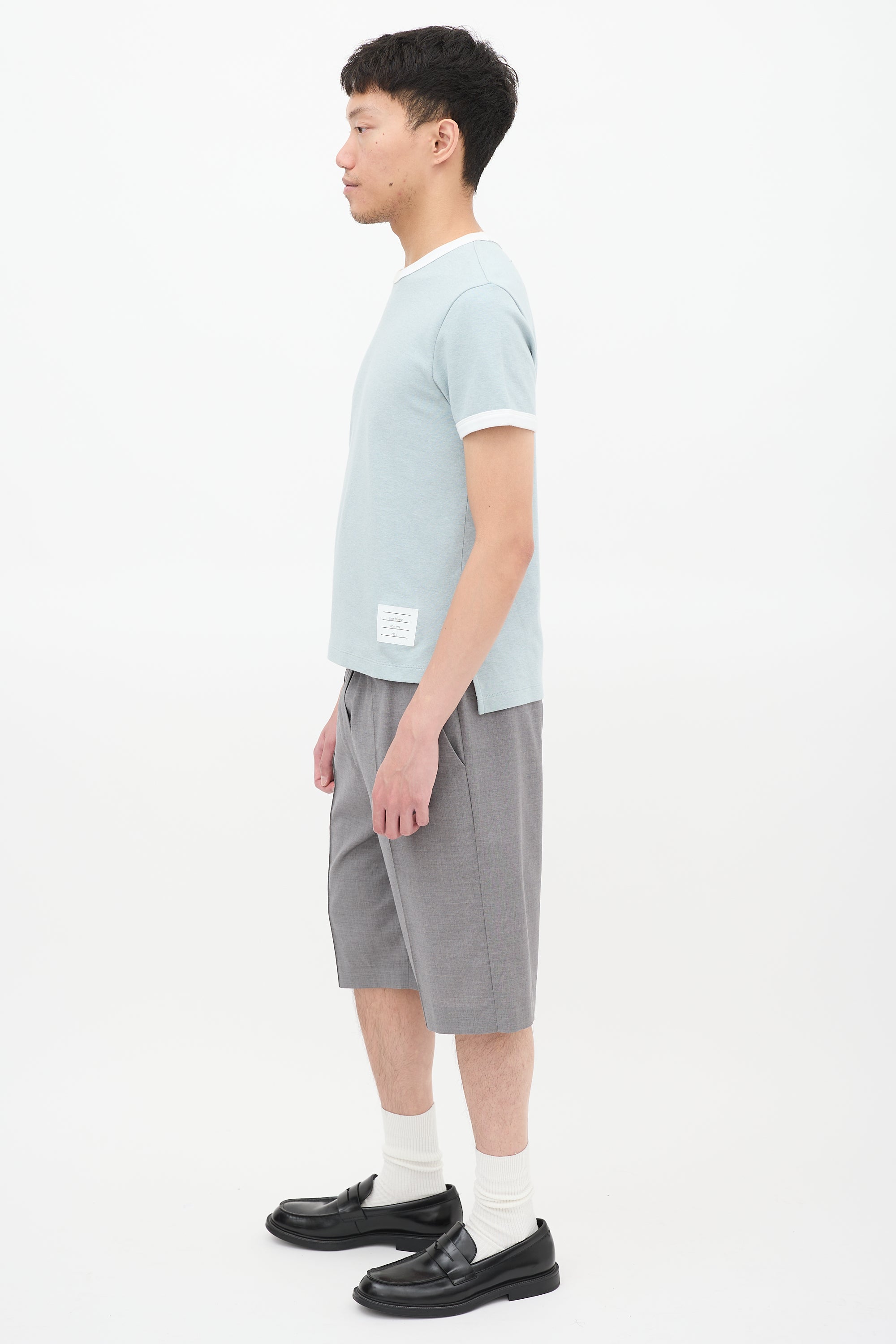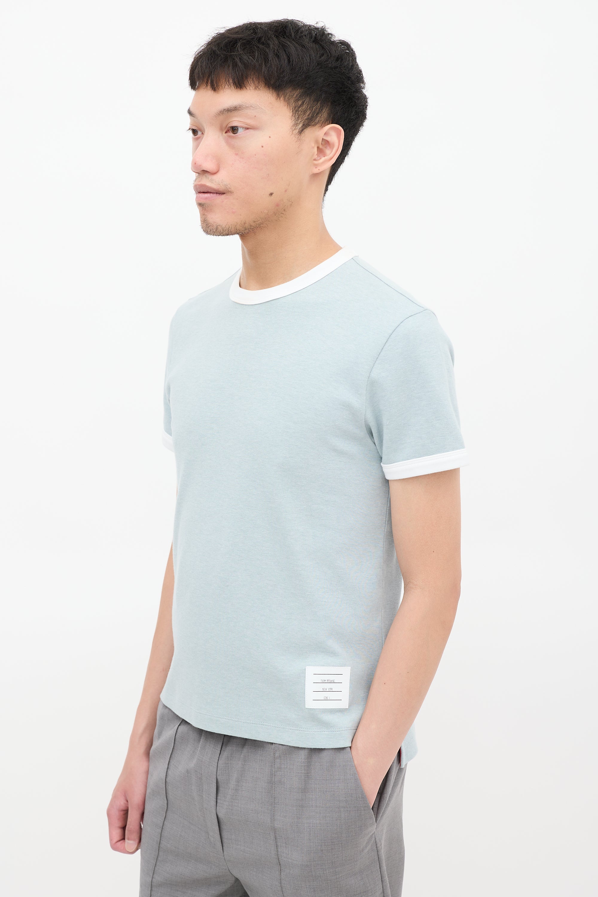 Pre-owned Thom Browne light blue ringer T-shirt featuring a round neck, signature tricolour grosgrain ribbon detail at back neck, white label at front left hem, split sides, high low hem, short sleeves, and white contrast trim at neck and cuffs. Sample.