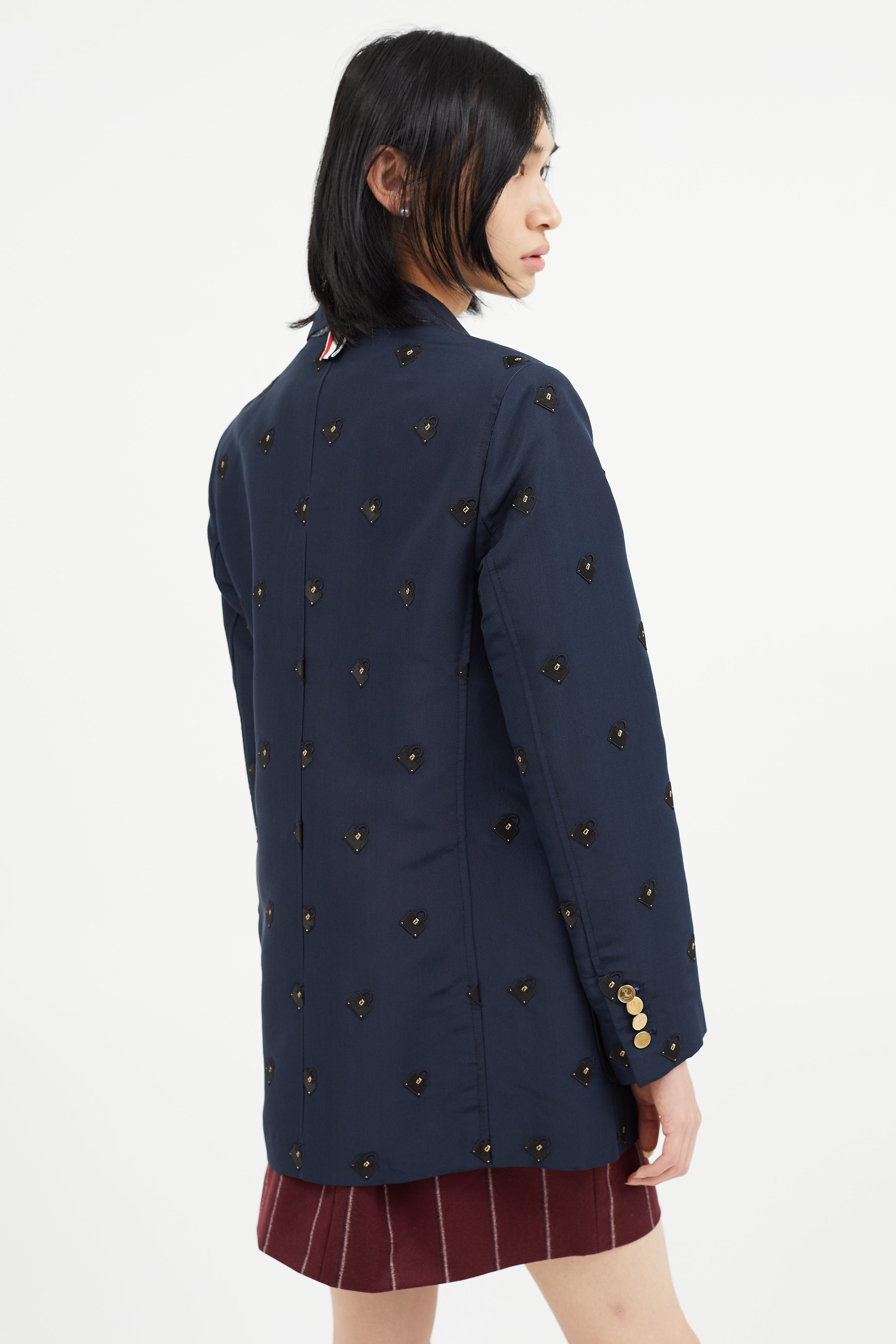 Pre-owned Thom Browne navy blazer featuring black embroidered bags throughout, notch lapel, gold tone double breasted buttons, buttoned cuffs, and three patch pockets. Lined.