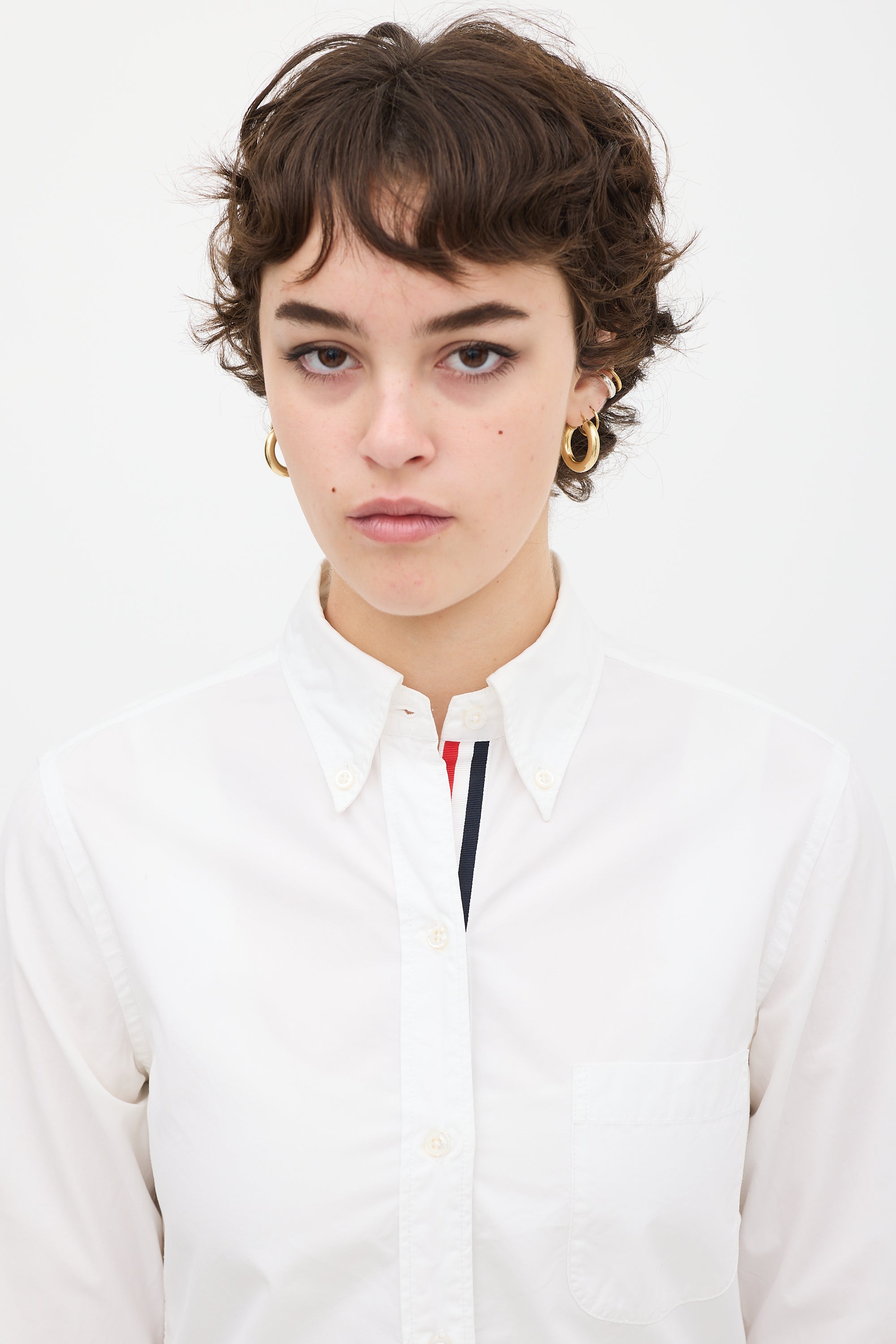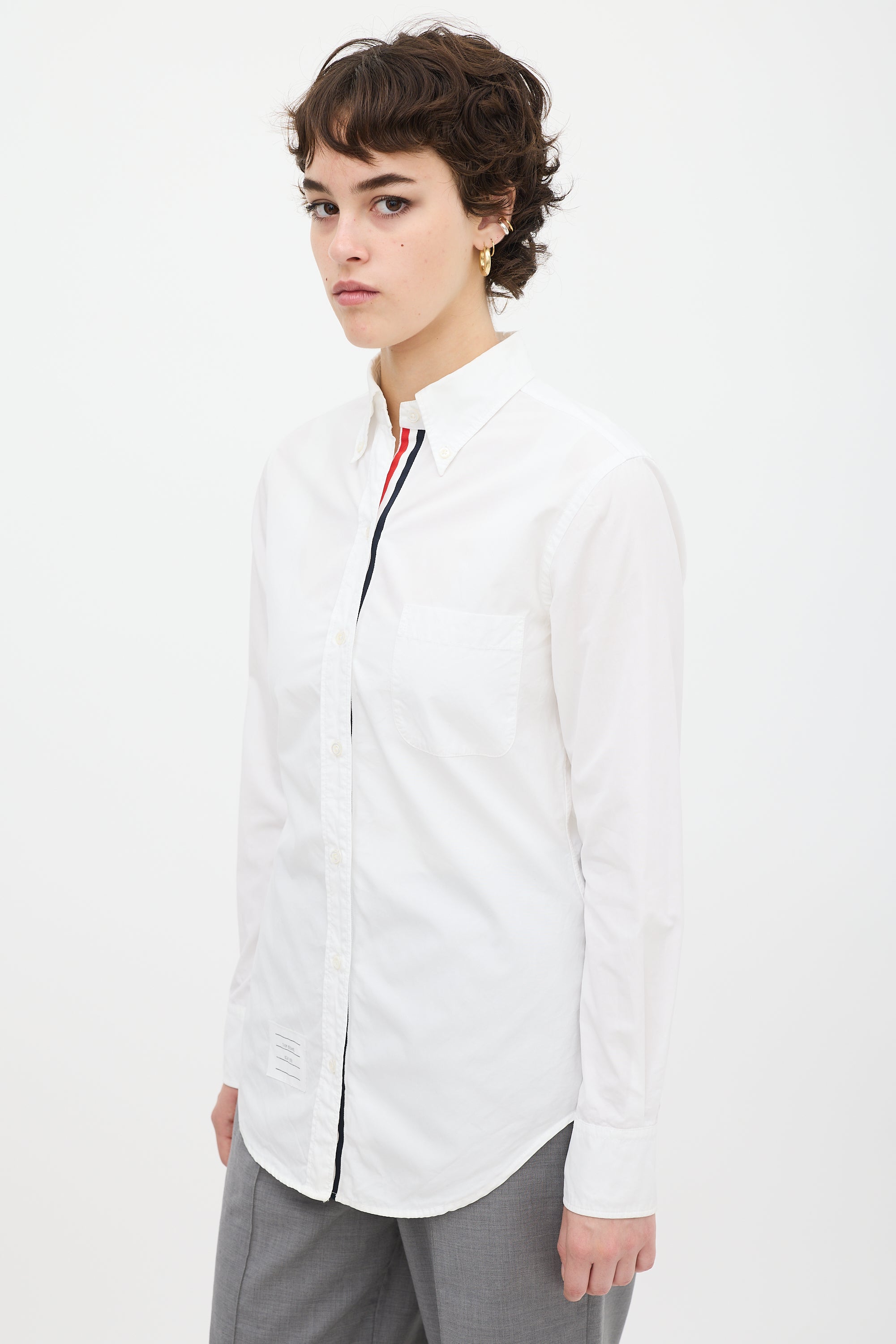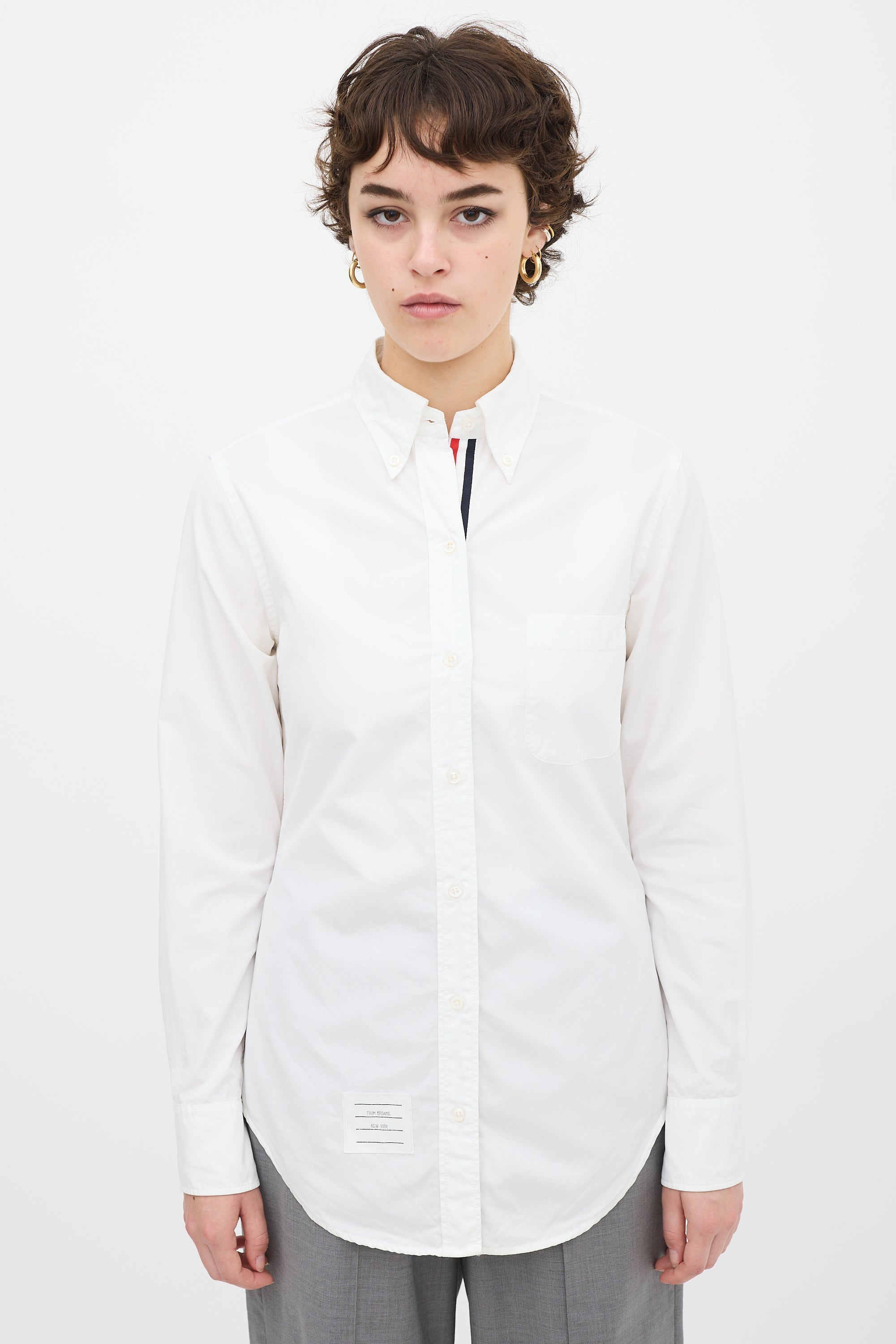Pre-owned Thom Browne white shirt featuring a buttoned point collar, button up front, concealed signature tricolour grosgrain ribbon at placket, patch pocket at left chest, curved hem, and long sleeves with buttoned cuffs.