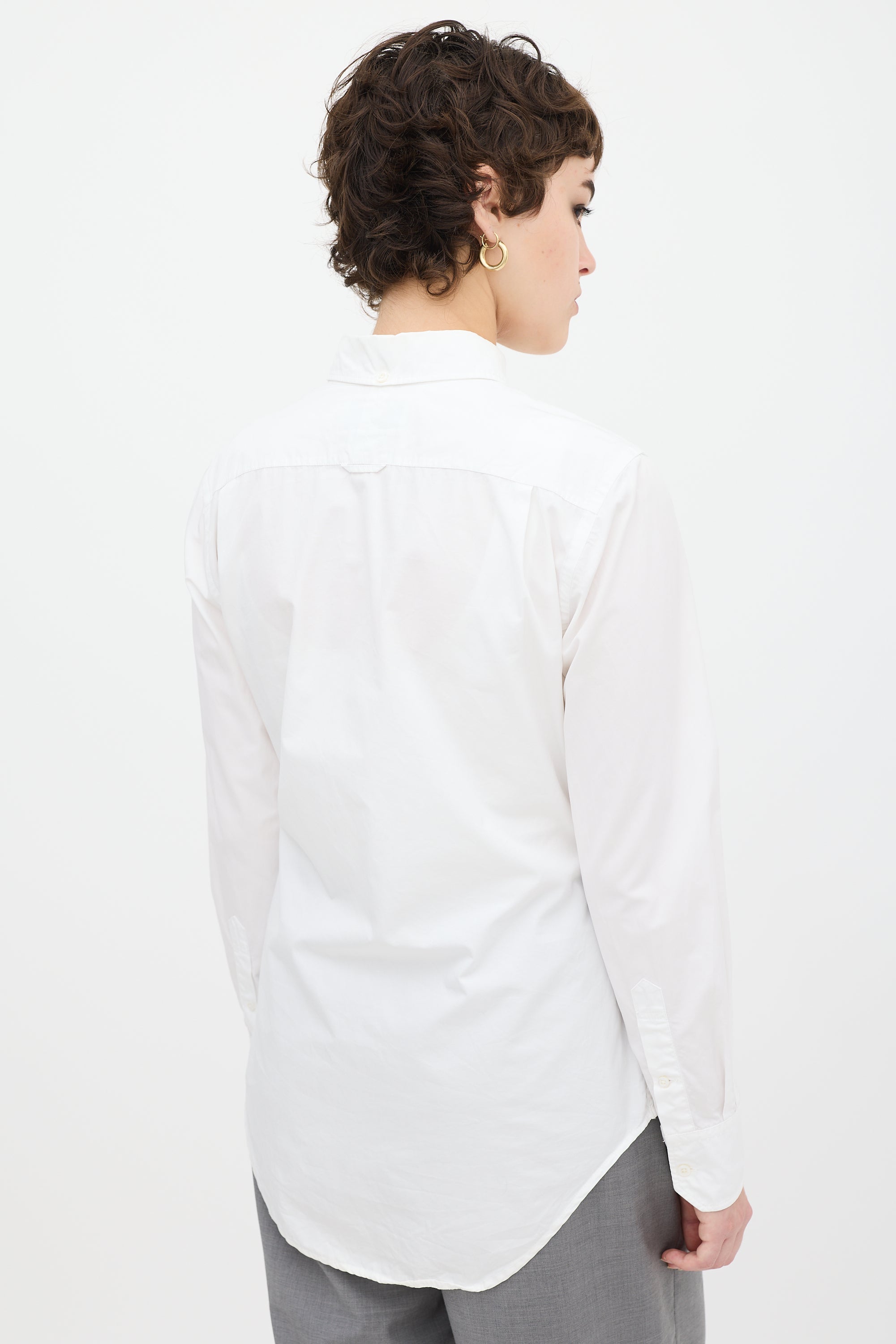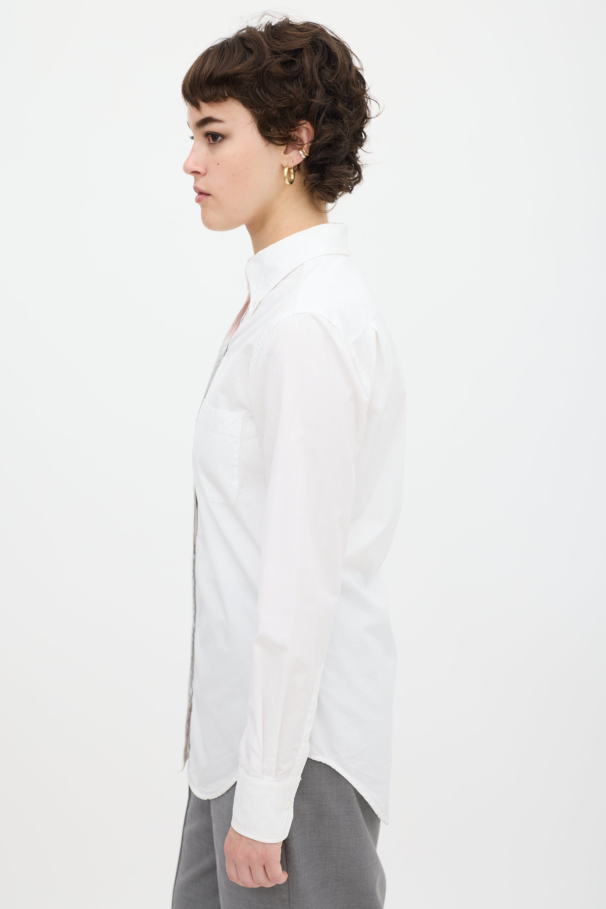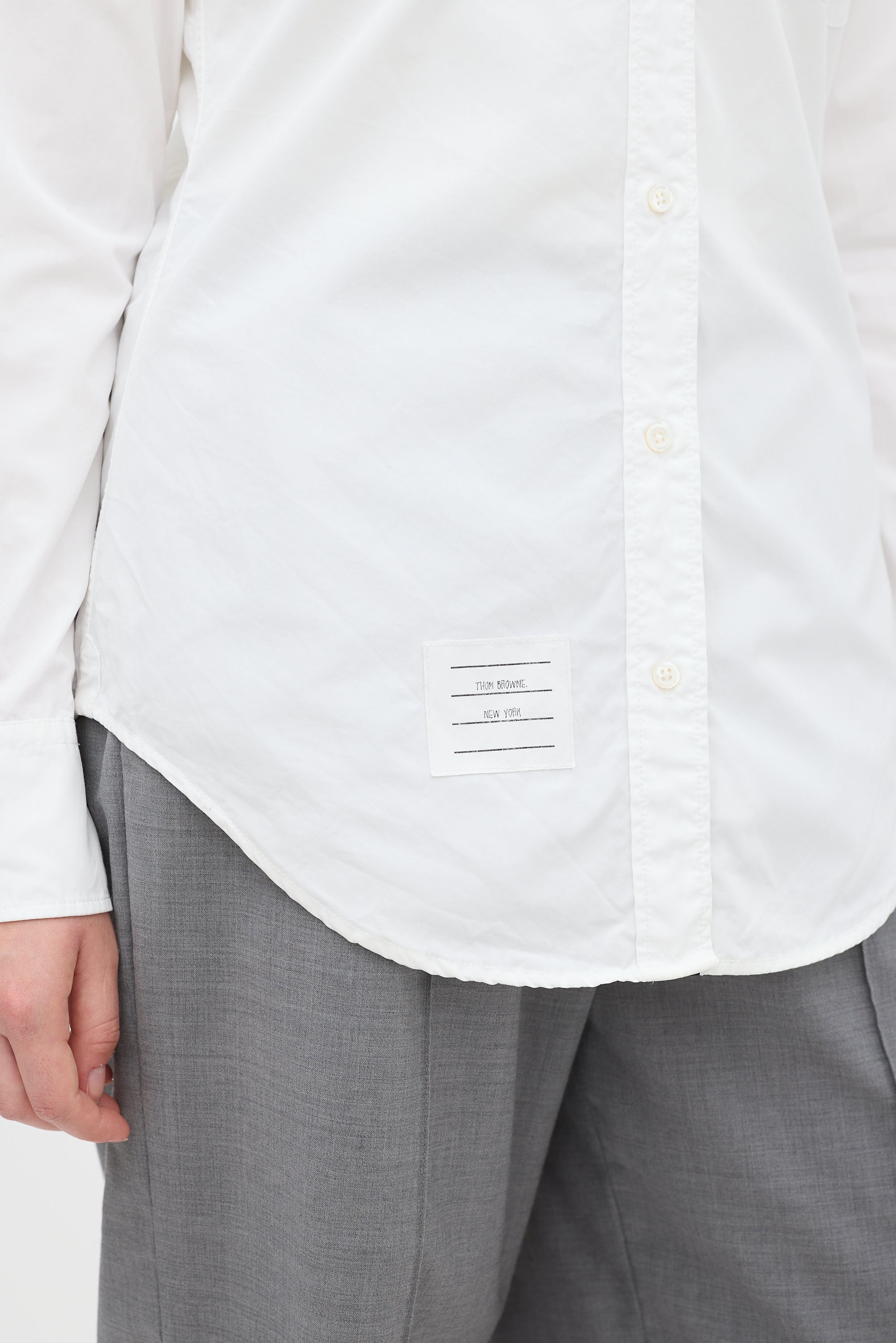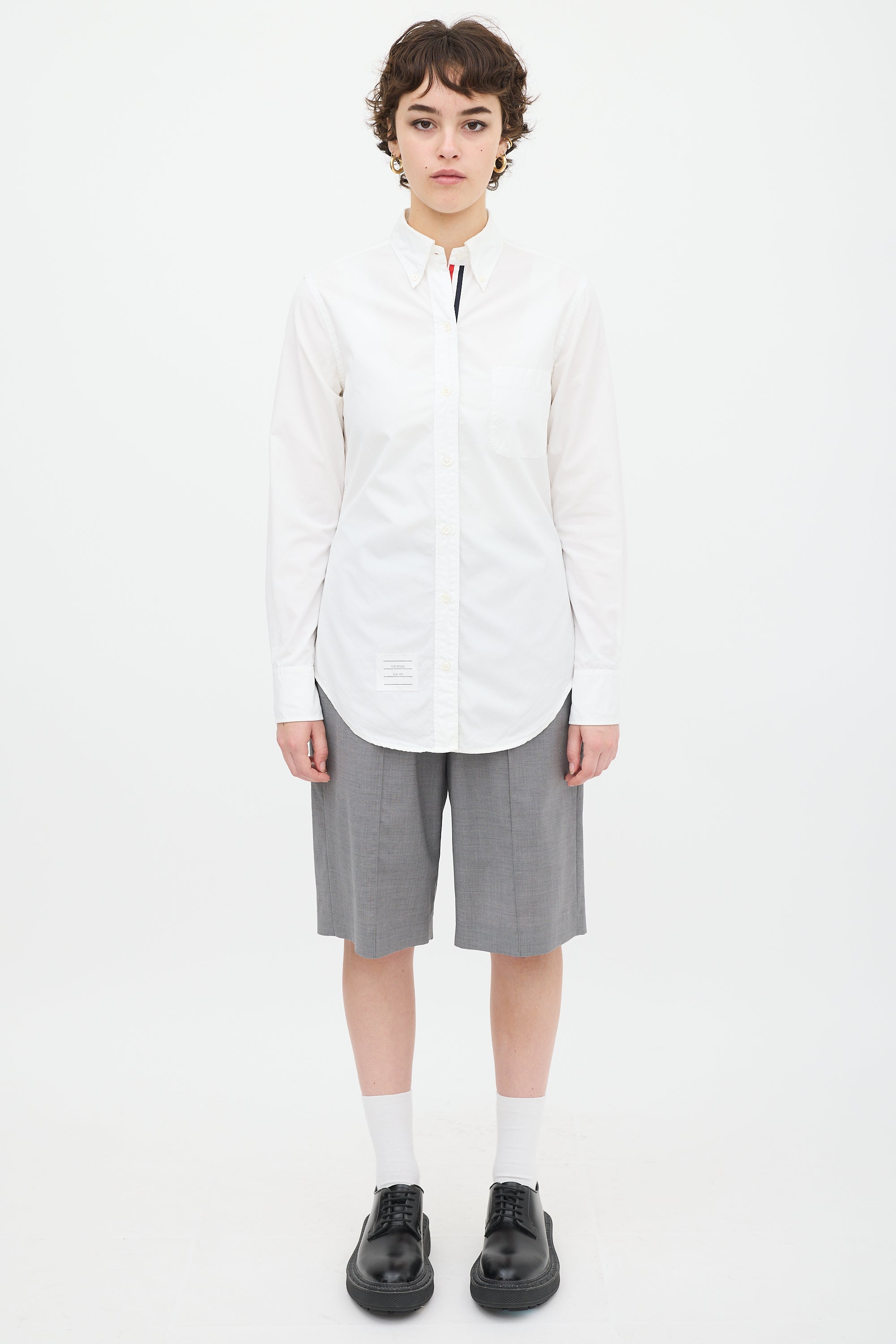 Pre-owned Thom Browne white shirt featuring a buttoned point collar, button up front, concealed signature tricolour grosgrain ribbon at placket, patch pocket at left chest, curved hem, and long sleeves with buttoned cuffs.