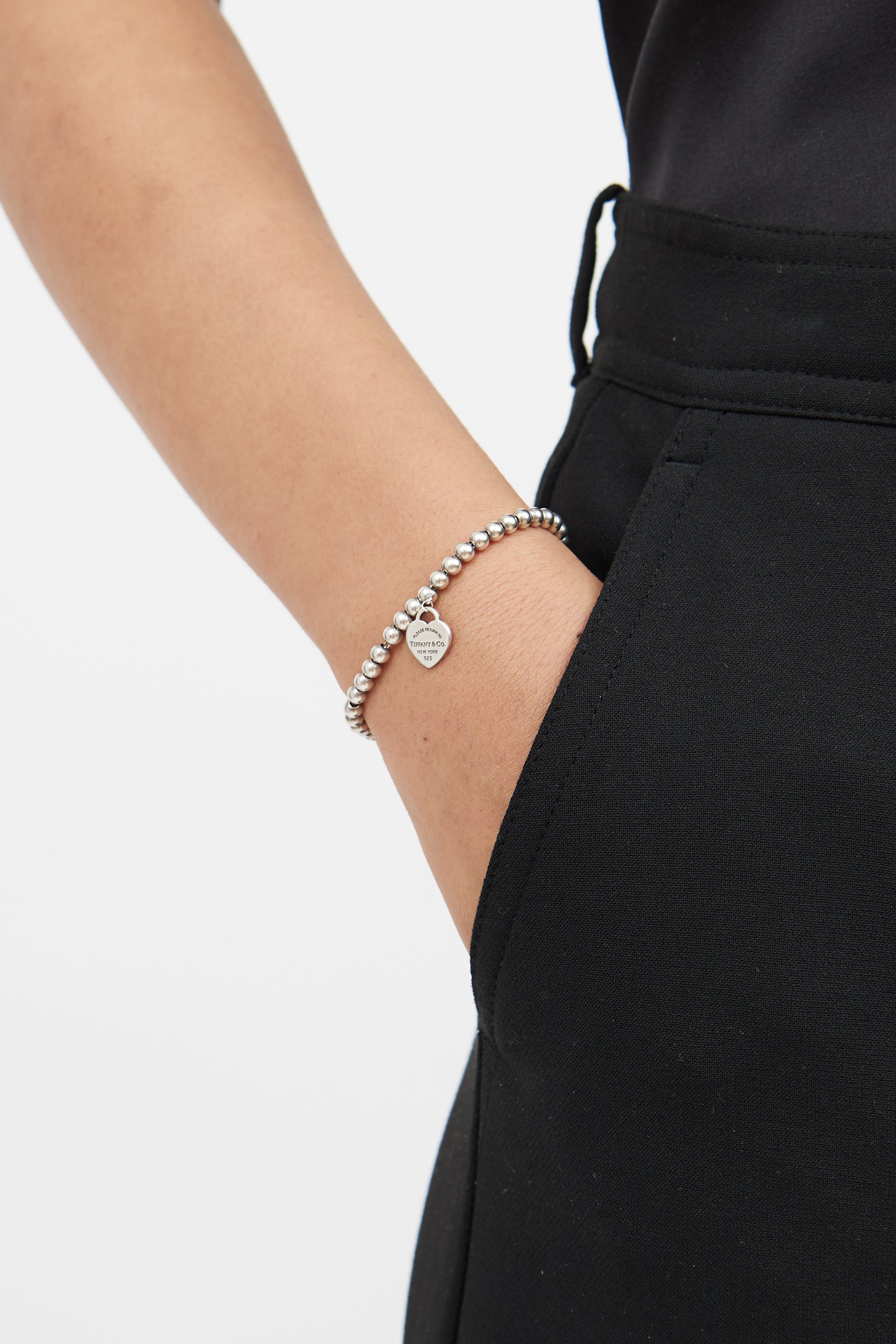 Pre-owned Tiffany & Co. sterling silver bracelet featuring circular bead design, red heart drop pendant with "Please Return To Tiffany & Co." and "925" stamping, circular drop pendant, and lobster clasp closure. Includes original box and pouch.
