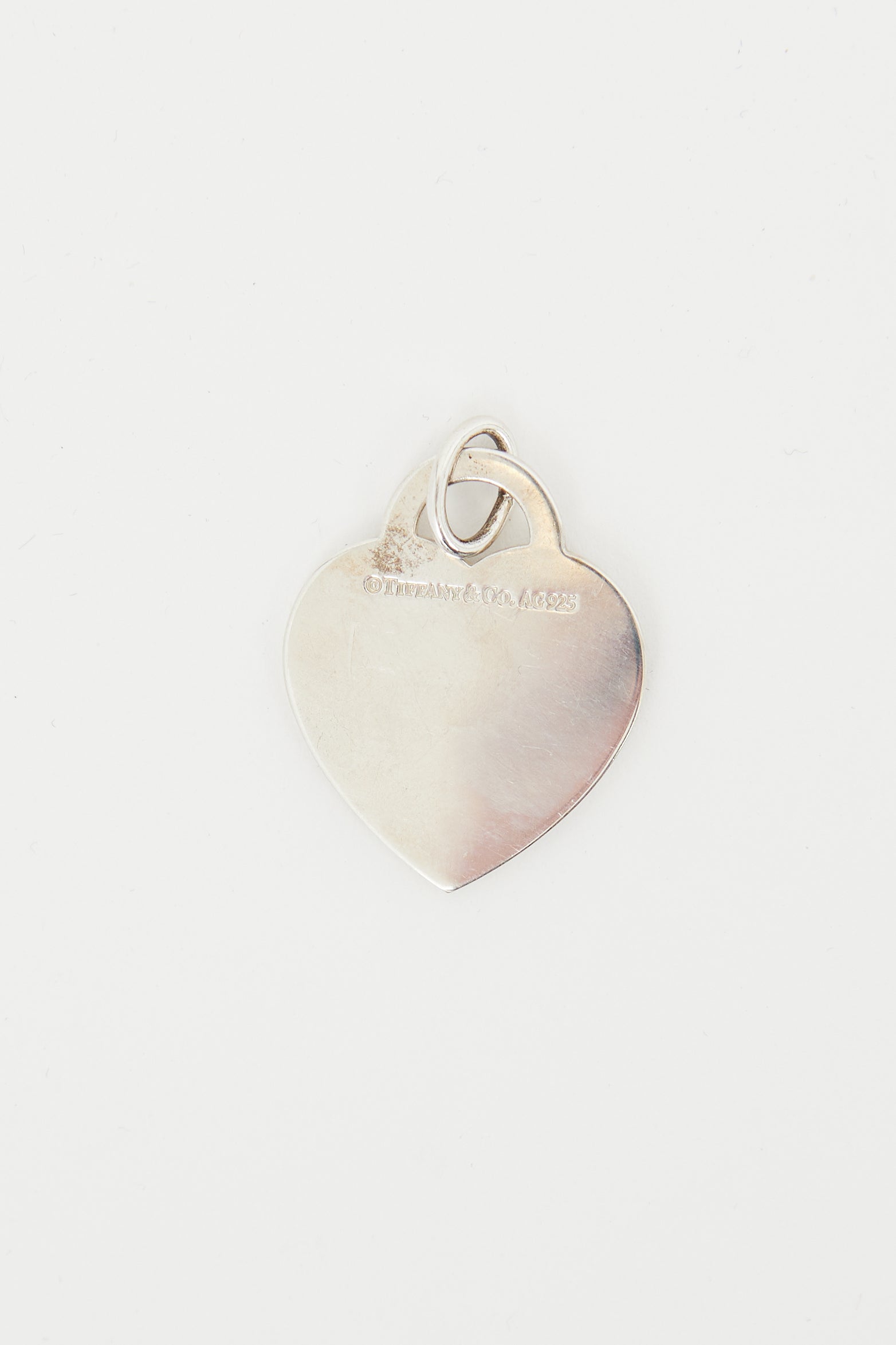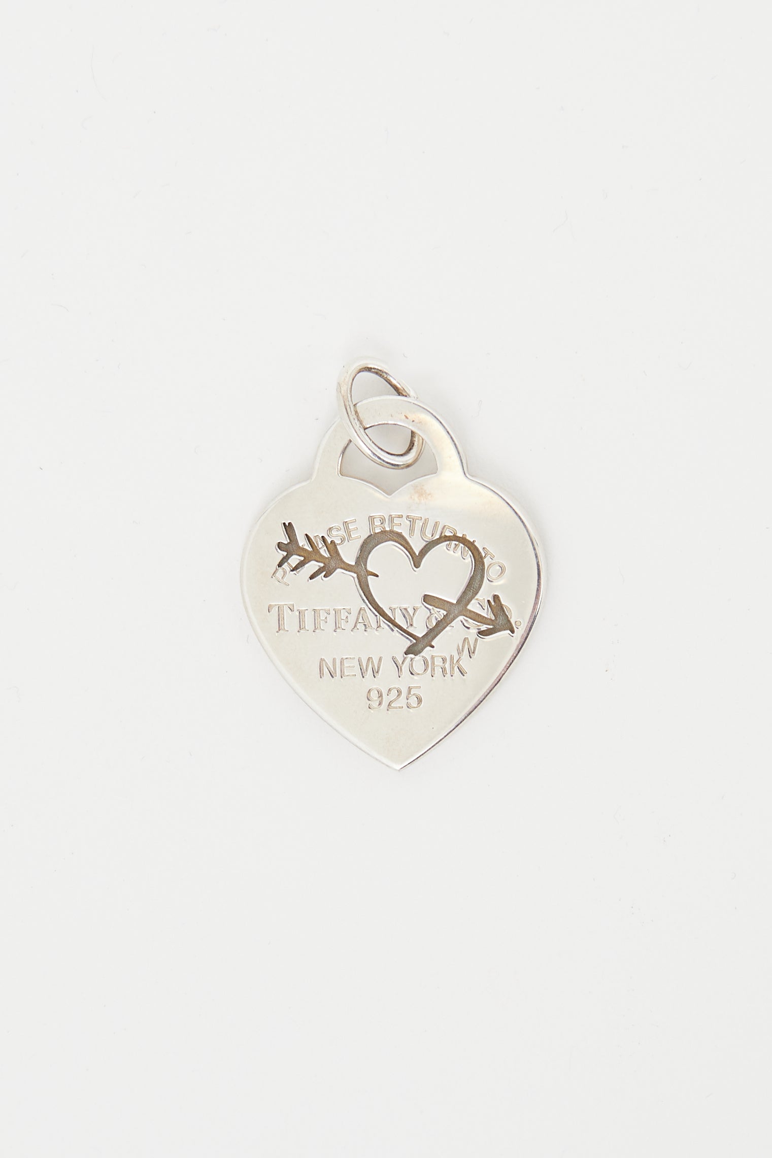 Pre-owned Tiffany & Co. sterling silver cupid heart pendant featuring heart shape, embossed heart with arrow graphic on front, "Please Return To Tiffany & Co." "New York" "925" stamping and oval clasp.