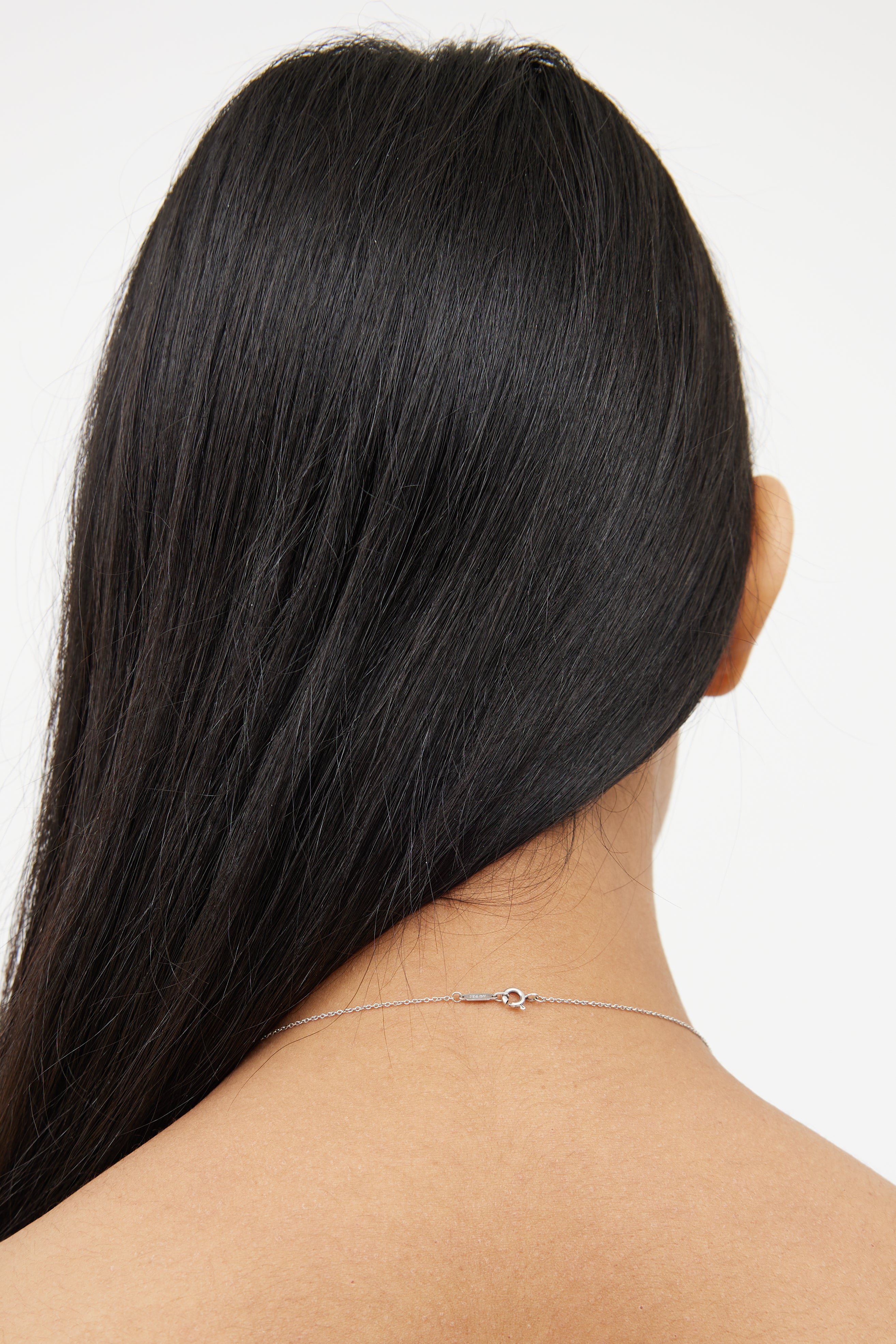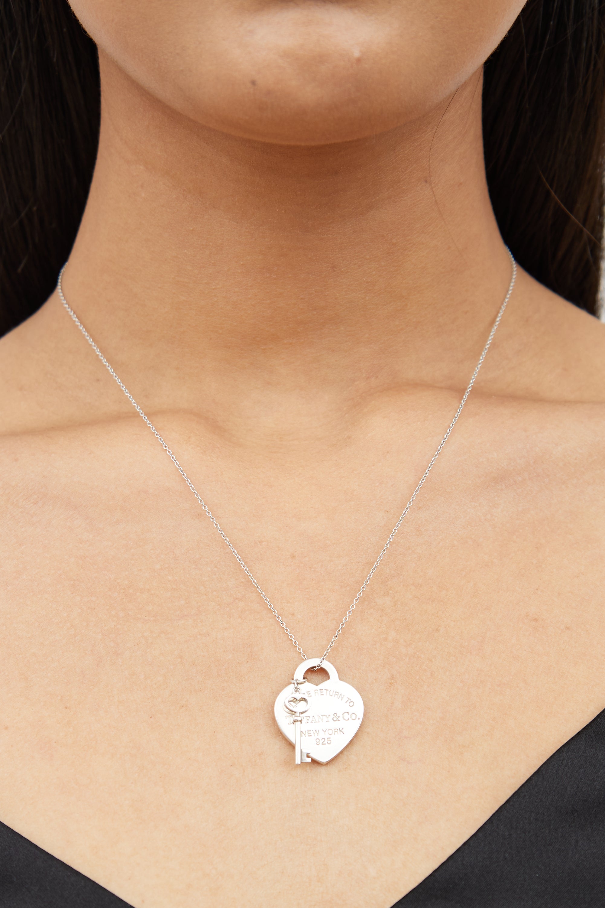 Pre-owned Tiffany & Co. sterling silver necklace featuring heart charm with "Please Return To Tiffany & Co. New York" and "925" engraving, drop key pendant, chain link, and clasp closure. Includes original pouch.