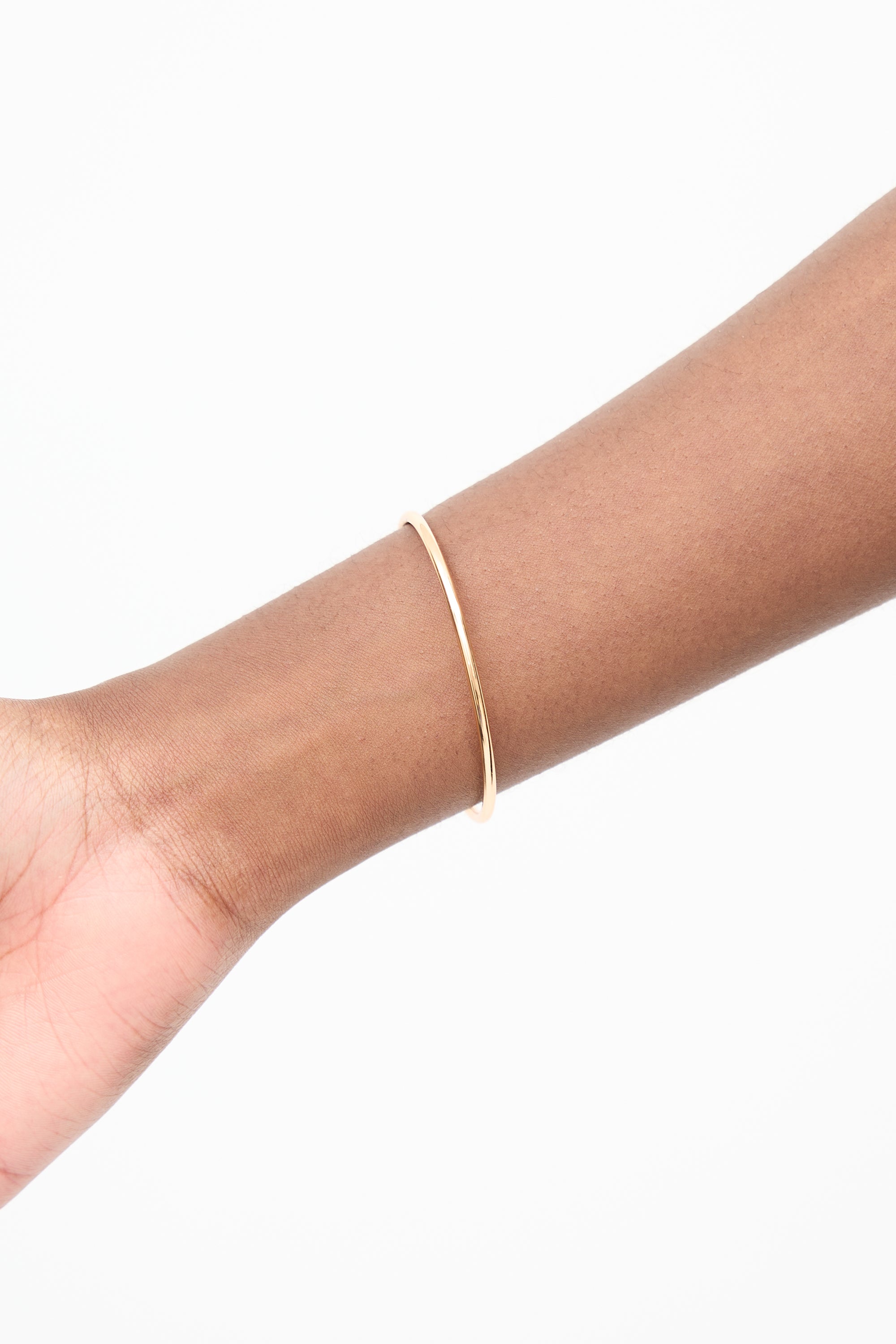 Pre-owned Tiffany & Co. 18K gold Narrow T Wire bangle bracelet featuring open design, T motif ends, and inner etched logo. Comes with original box and case.