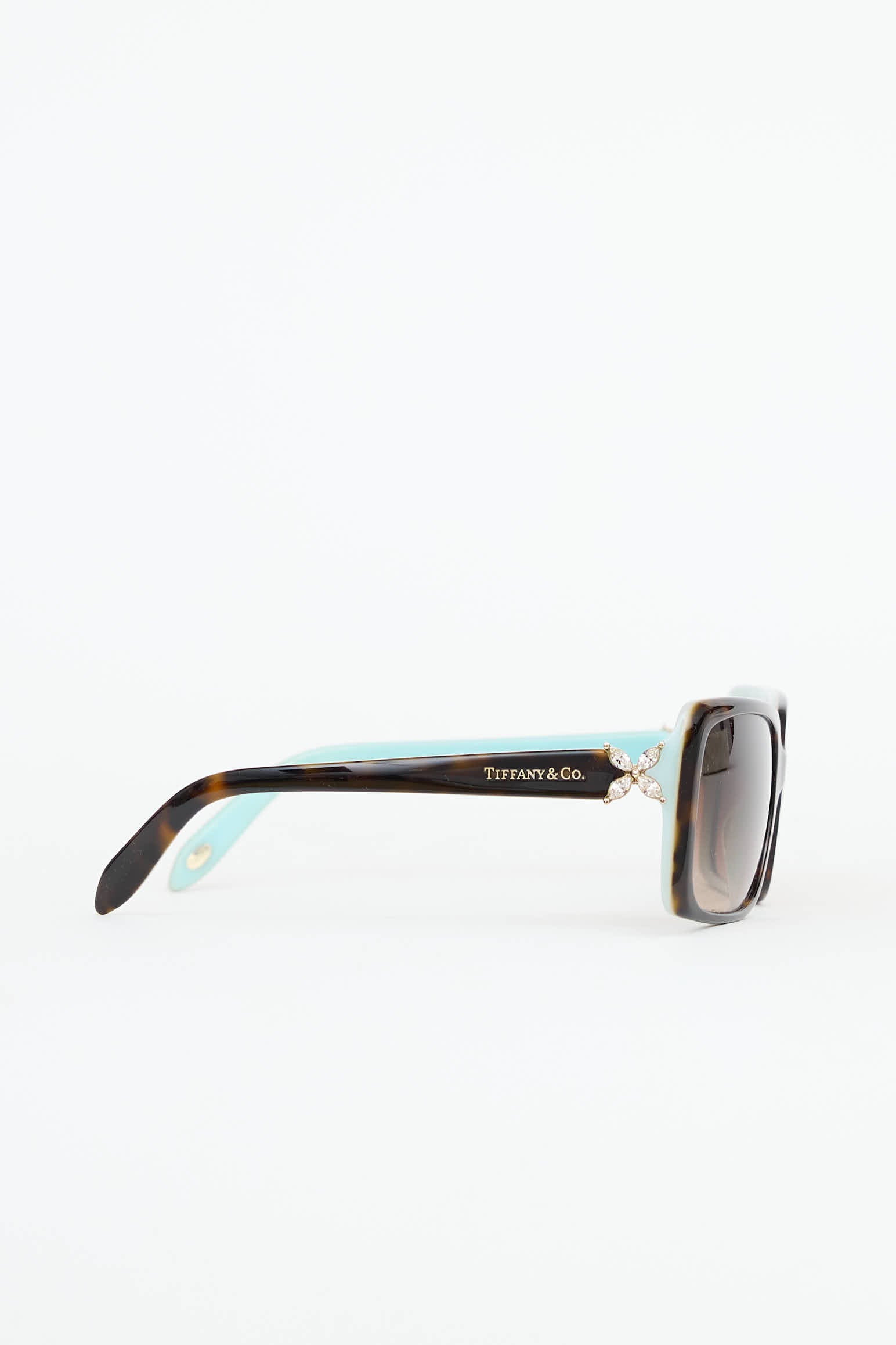 Pre-owned Tiffany & Co. TF 4047-B sunglasses featuring square tortoise frames, brown gradient lenses, and crystal embellishment with printed logo at temples.
