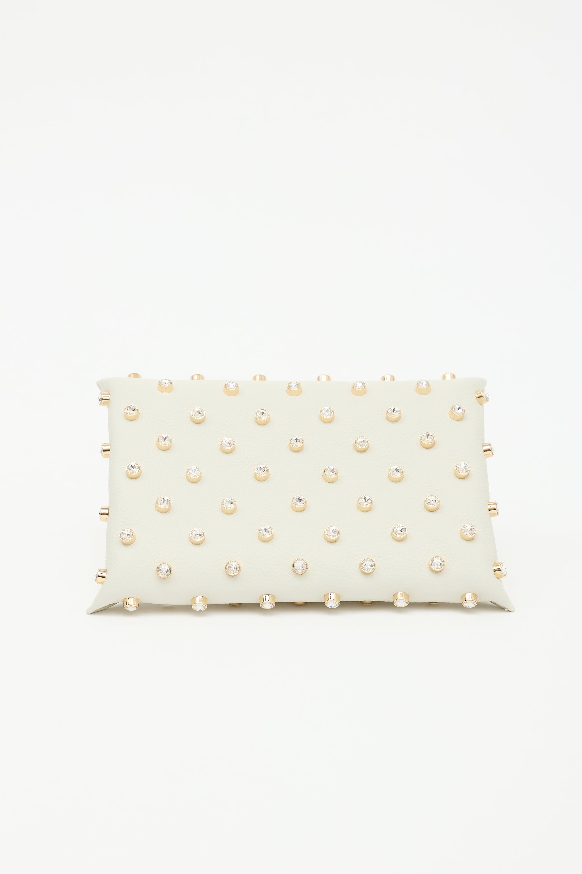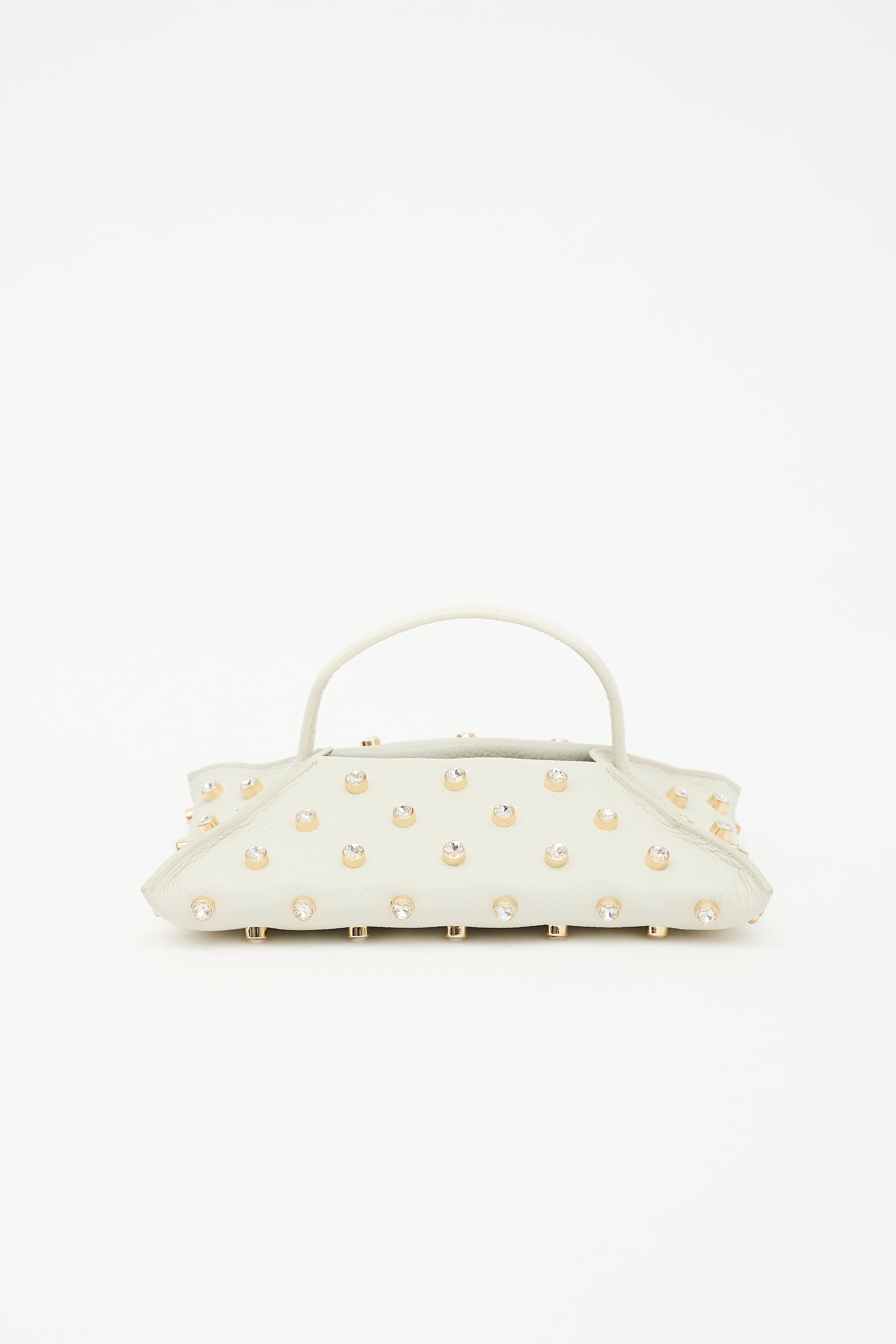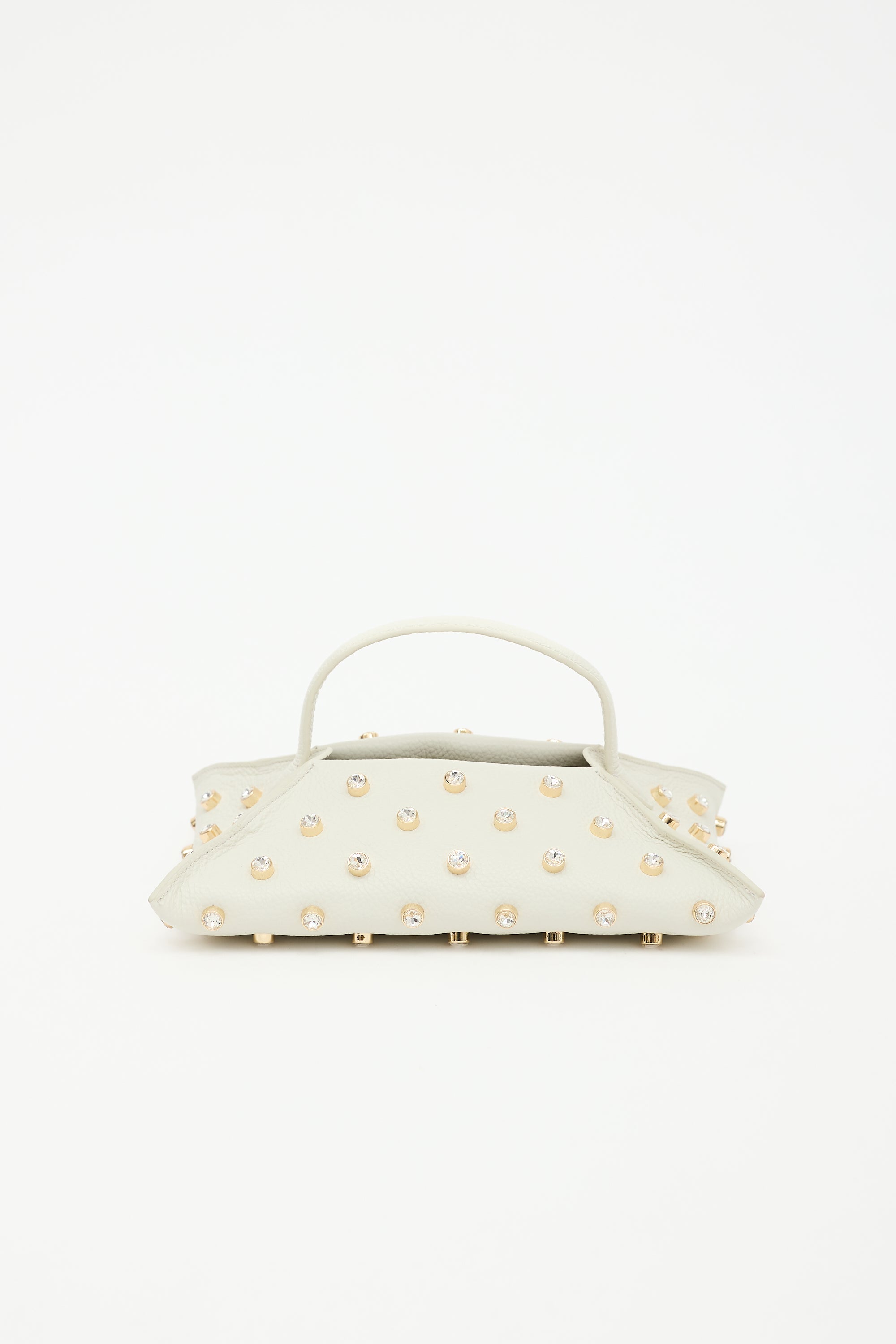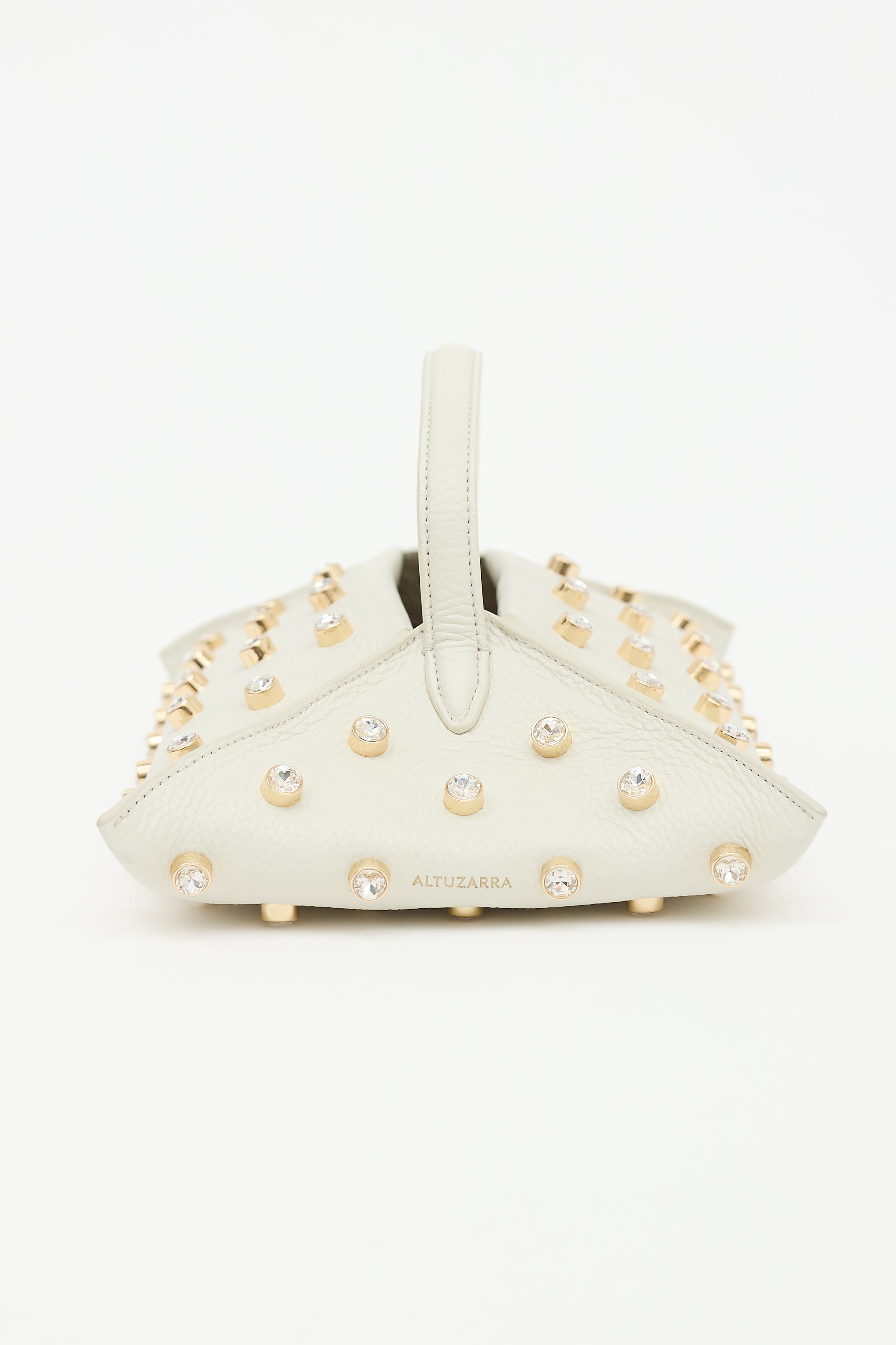 Pre-owned Altuzarra white leather Origami Baguette bag featuring gold tone and crystal stud embellishment, one top handle, open compartment with button strap, gold stamped logo at side, and one main suede compartment. Includes original dust bag.