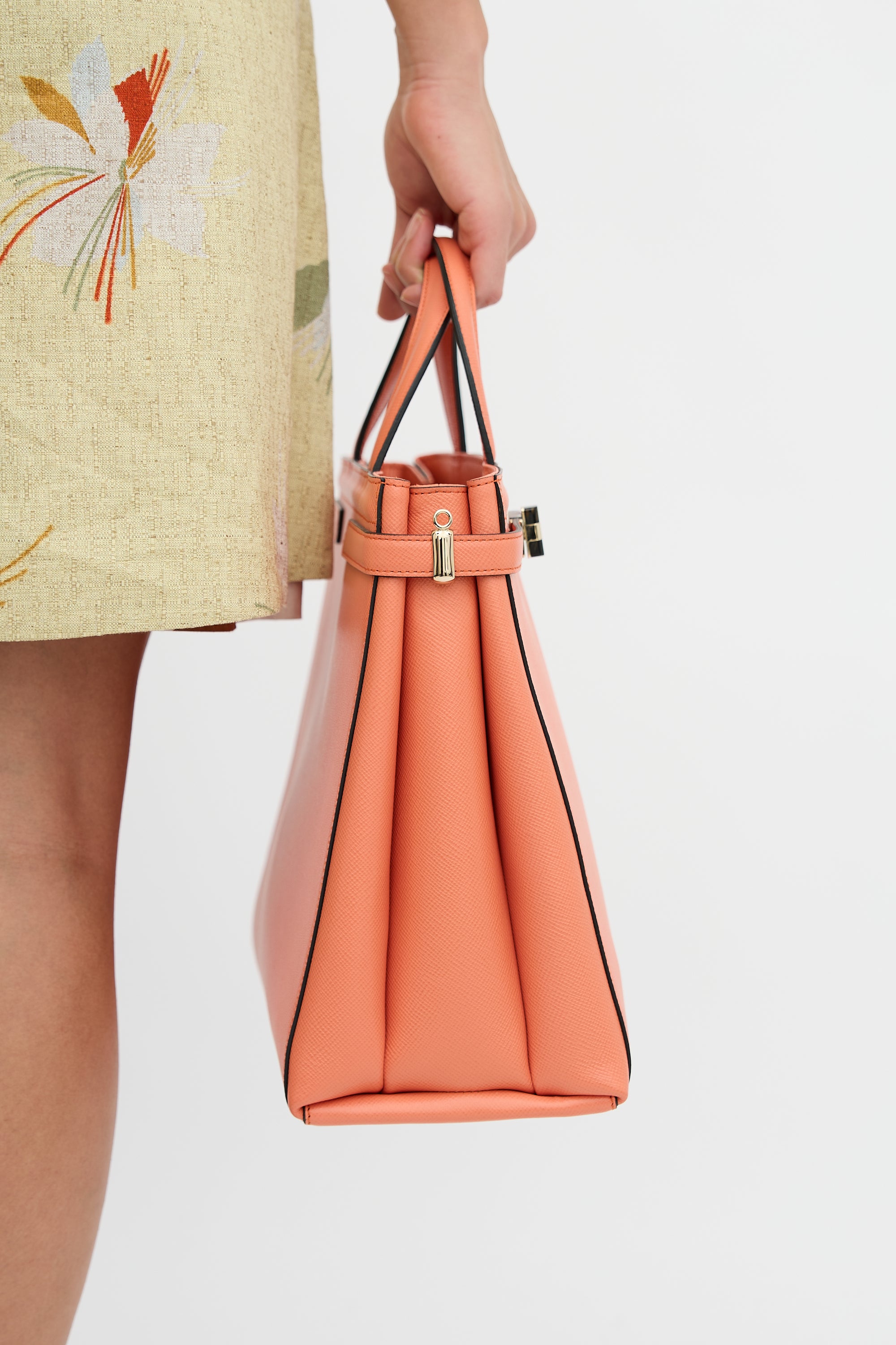 Pre-owned Serapian orange grained leather large bag featuring two fixed top handles, gold tone hardware, stamped logo at front, cinchable sides with straps and turn lock front fastening, four protective feet, adjustable and detachable strap, open top with two main compartments, interior zip top partition, two zip pockets, and two slip pockets. Comes with original dust bag.