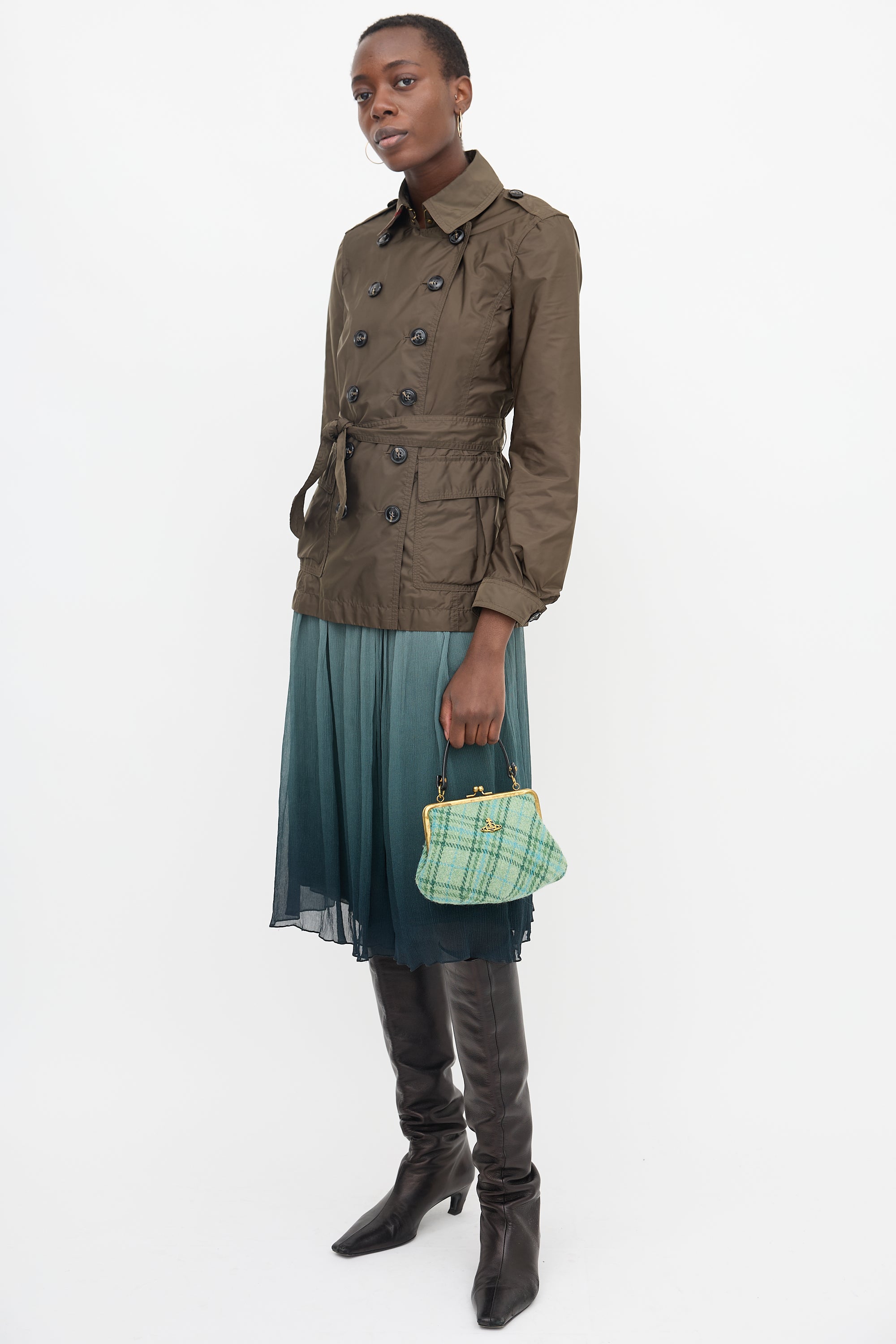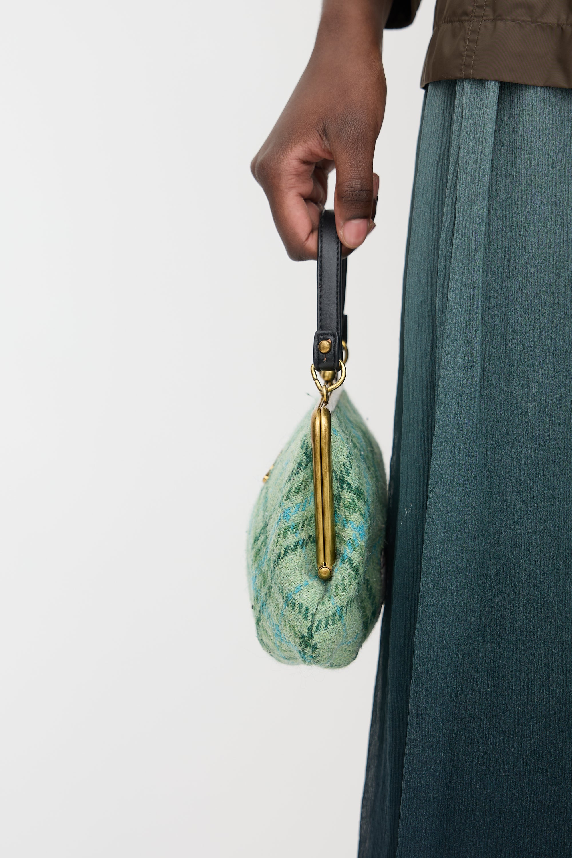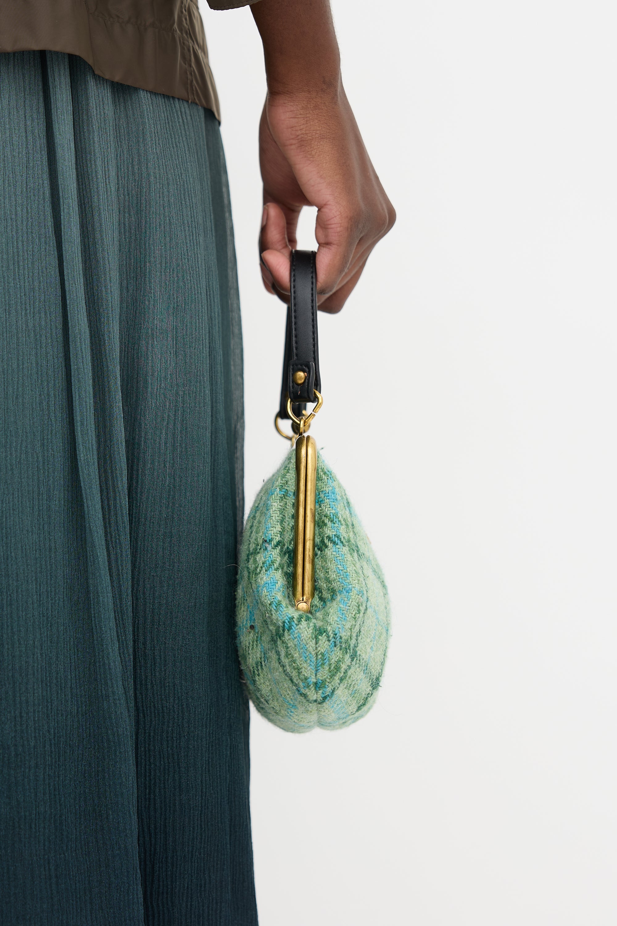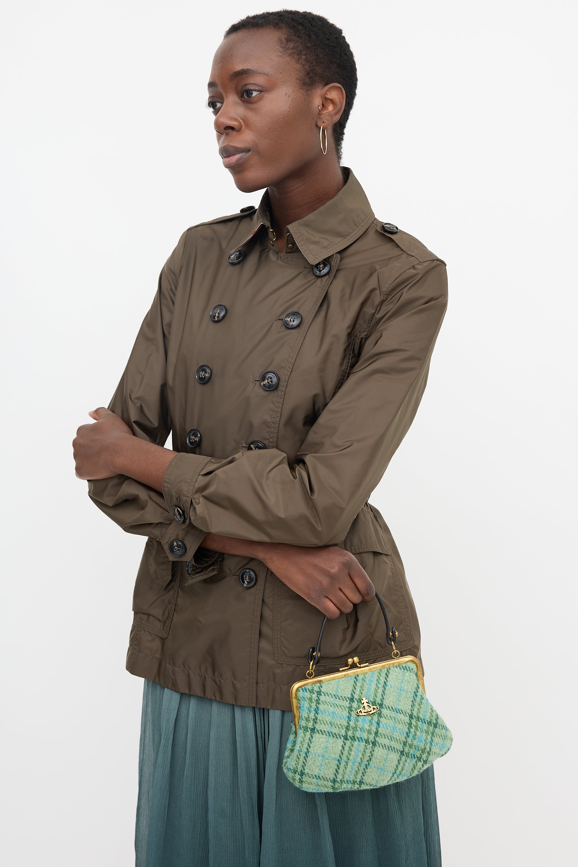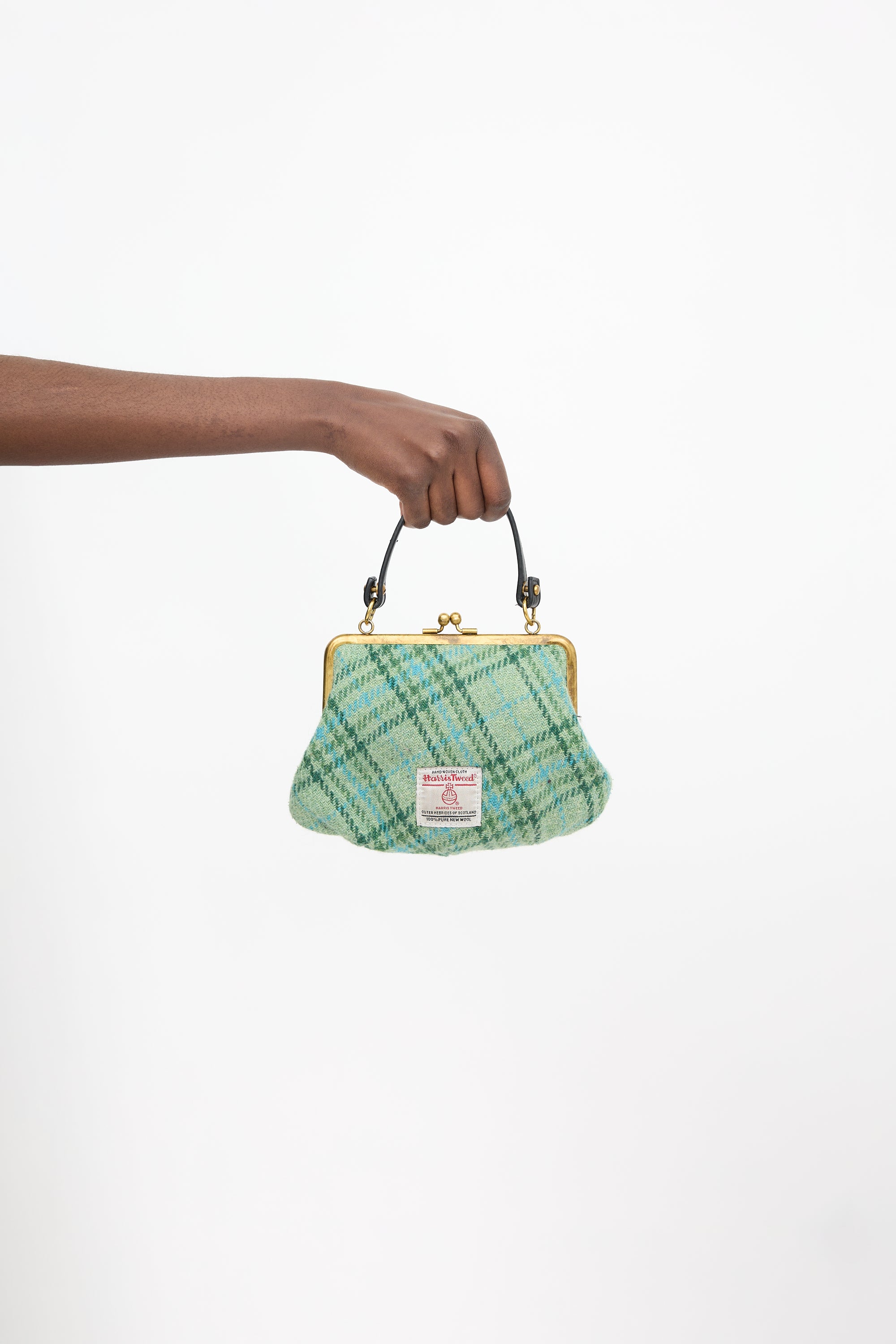 Pre-owned Vivienne Westwood X Harris Tweed 2020 green Elena Frame bag featuring check pattern, gold tone hardware, Orb embellishment at front, Harris Tweed label at back, single black leather top handle, detachable chain, top frame with kiss lock closure, and one lined main compartmwnt with one zip pocket. Comes with original dust bag.