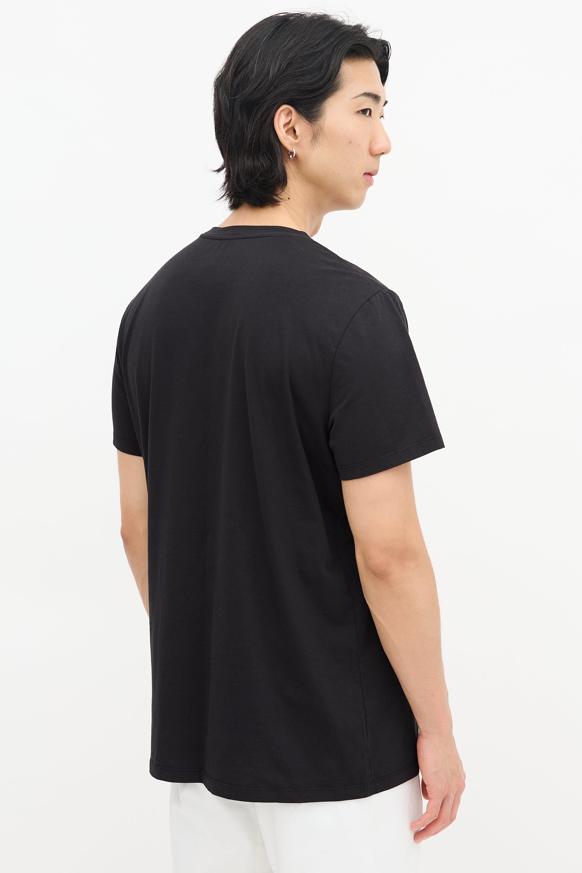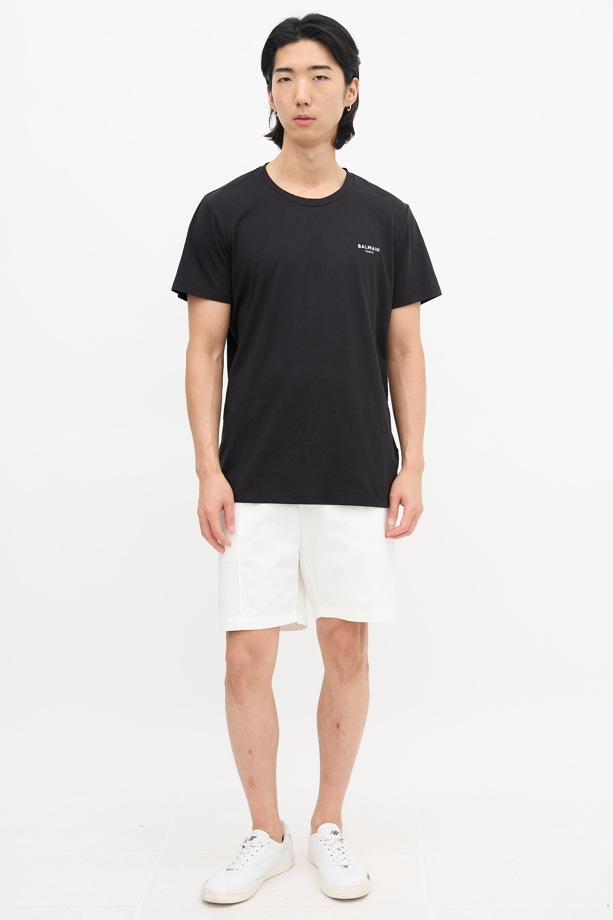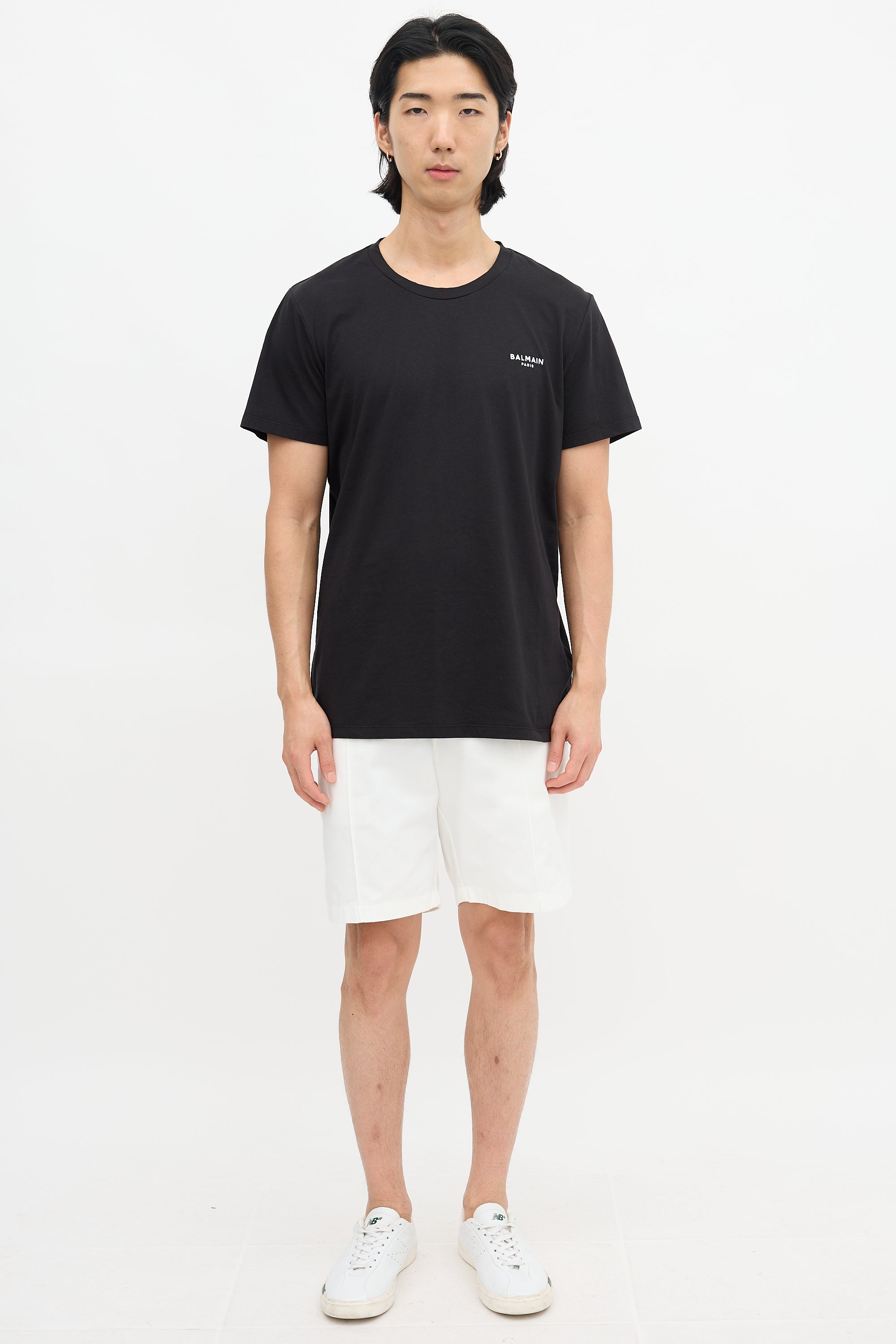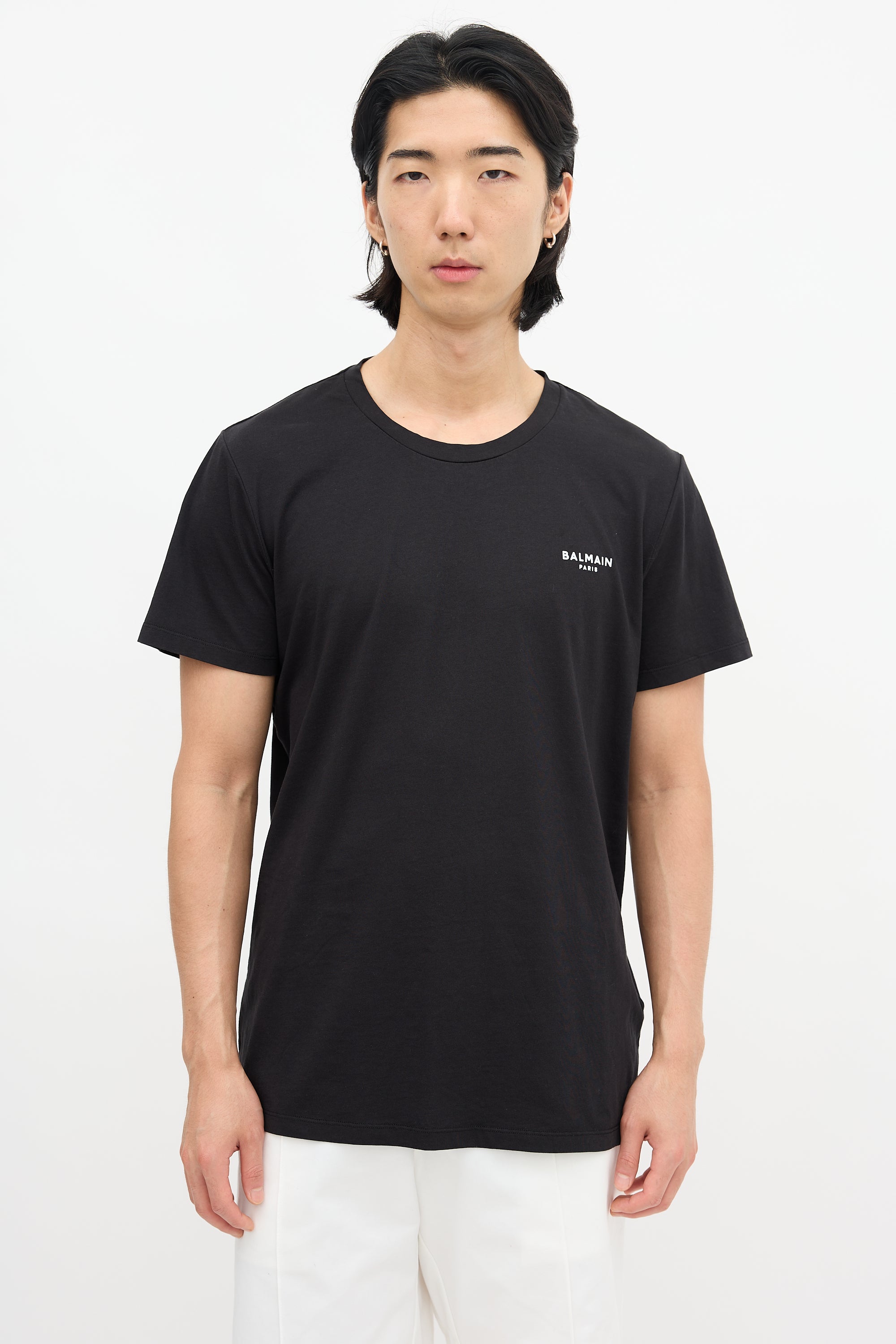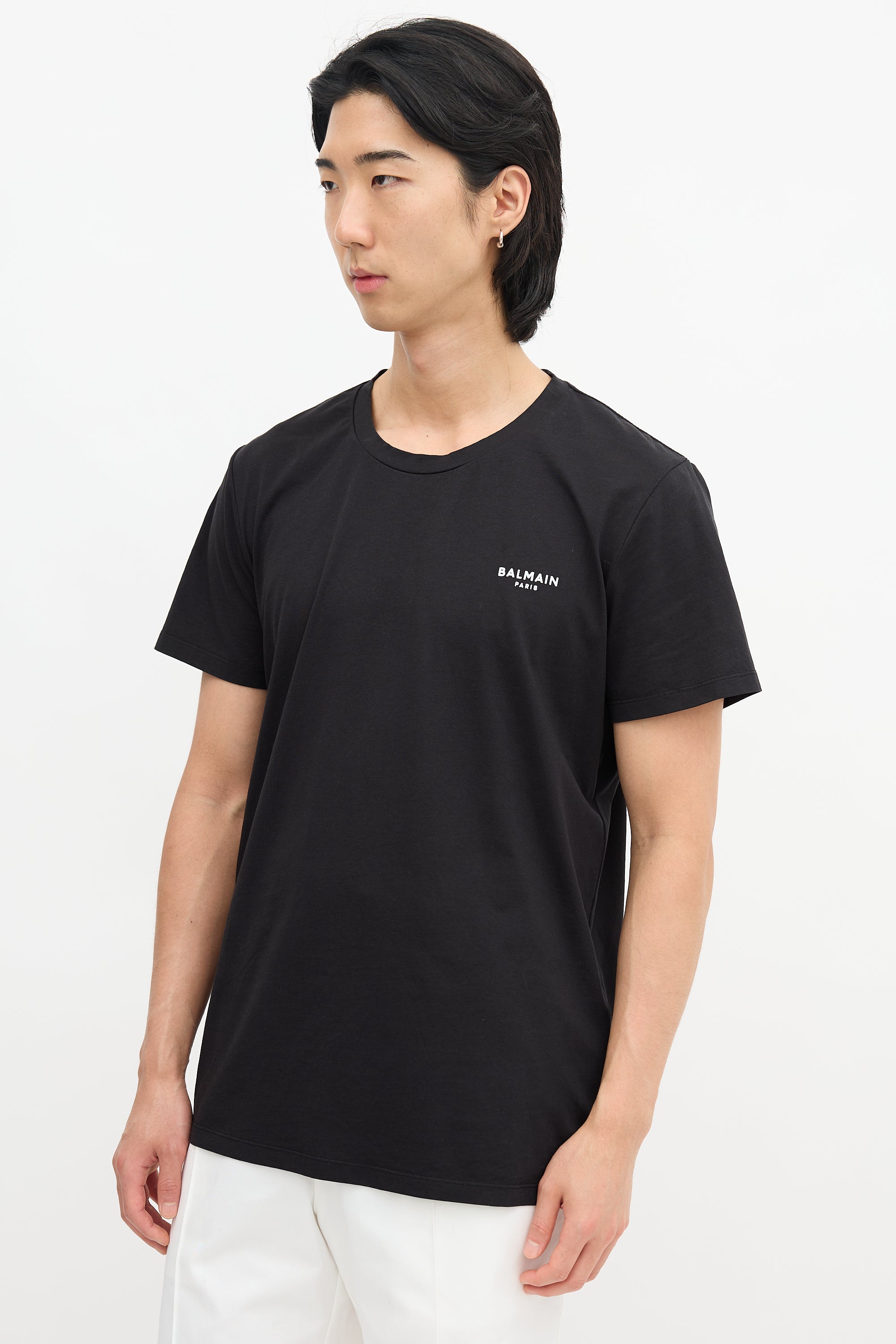 Pre-owned Balmain black T-shirt featuring crew neckline and white printed logo front.