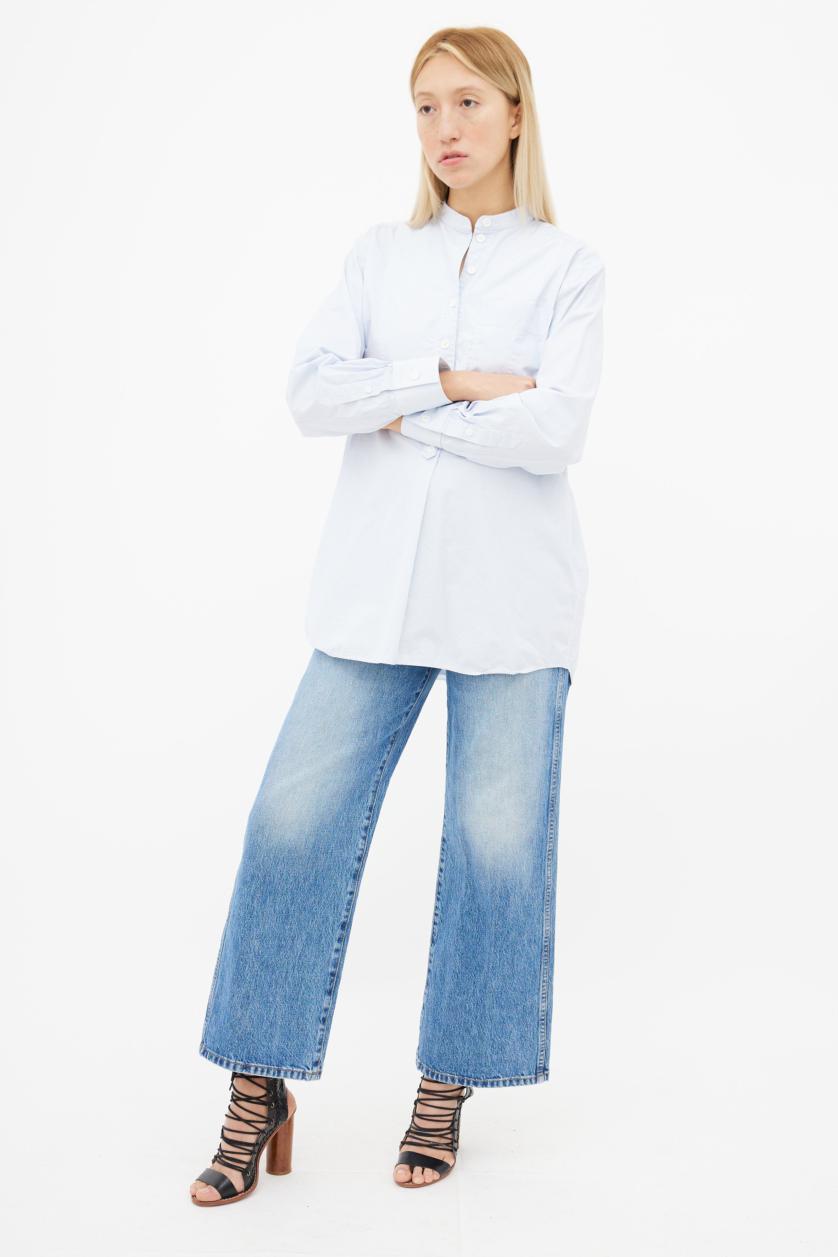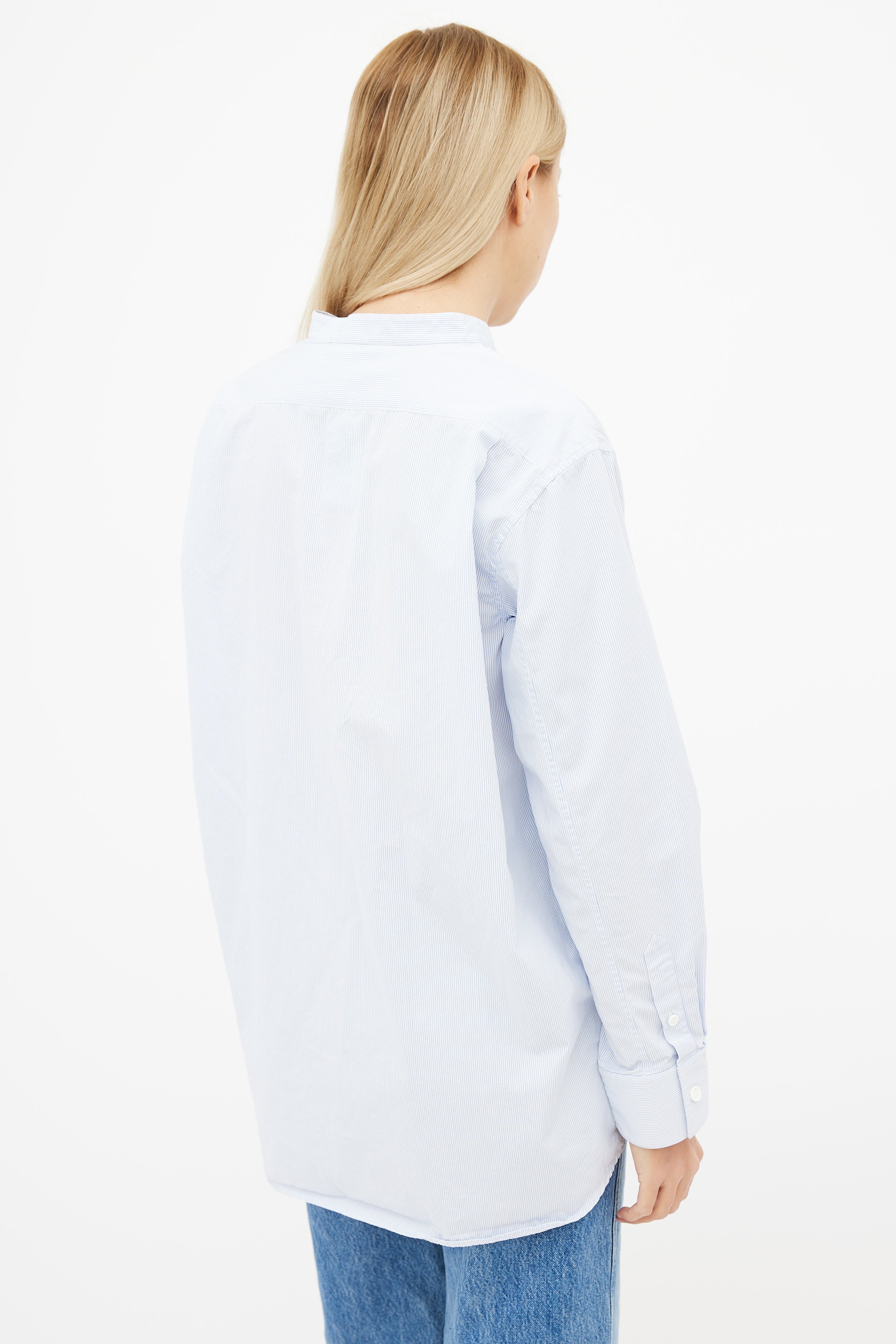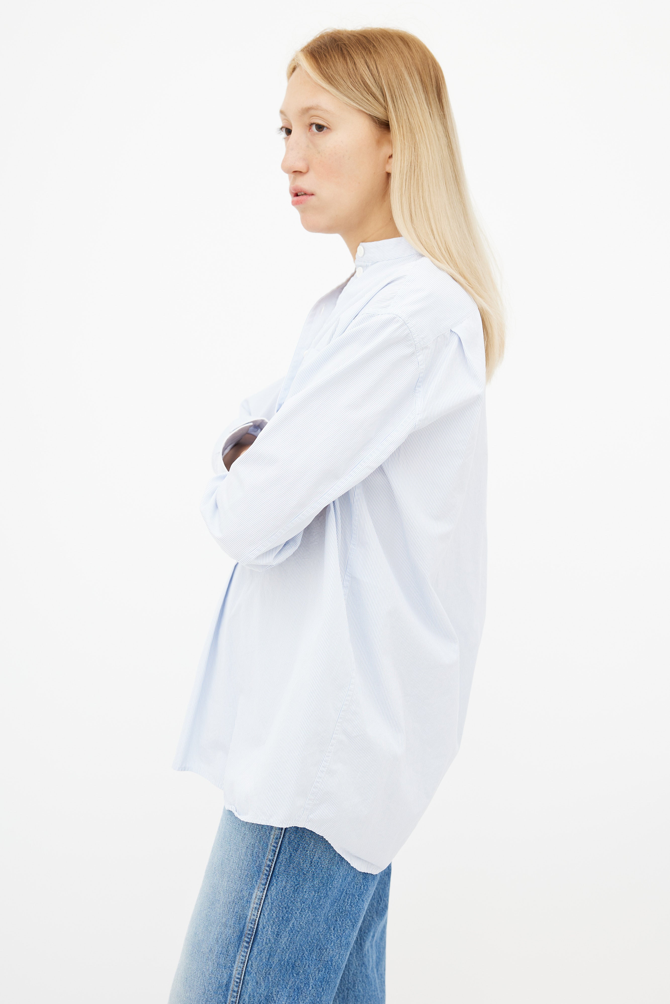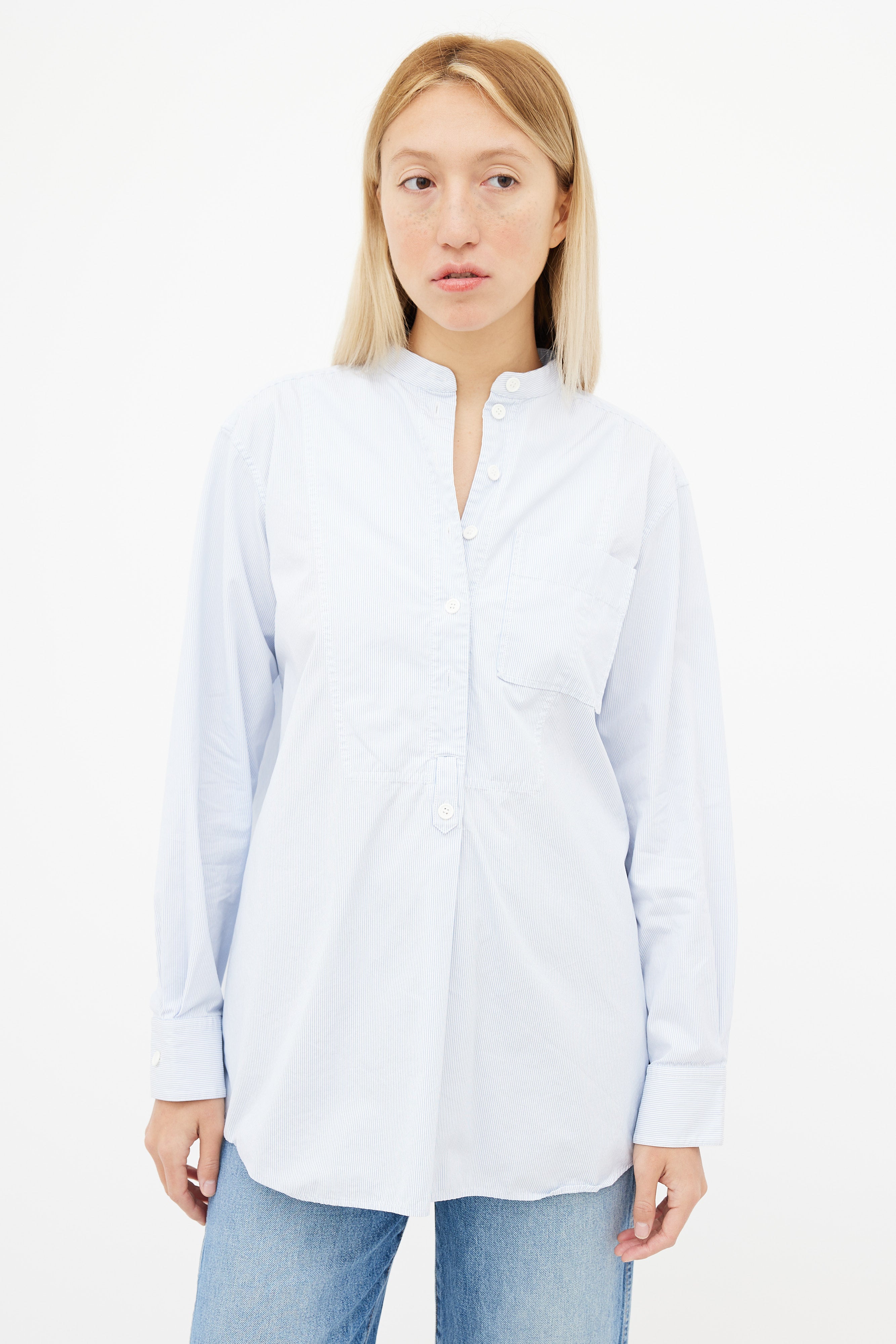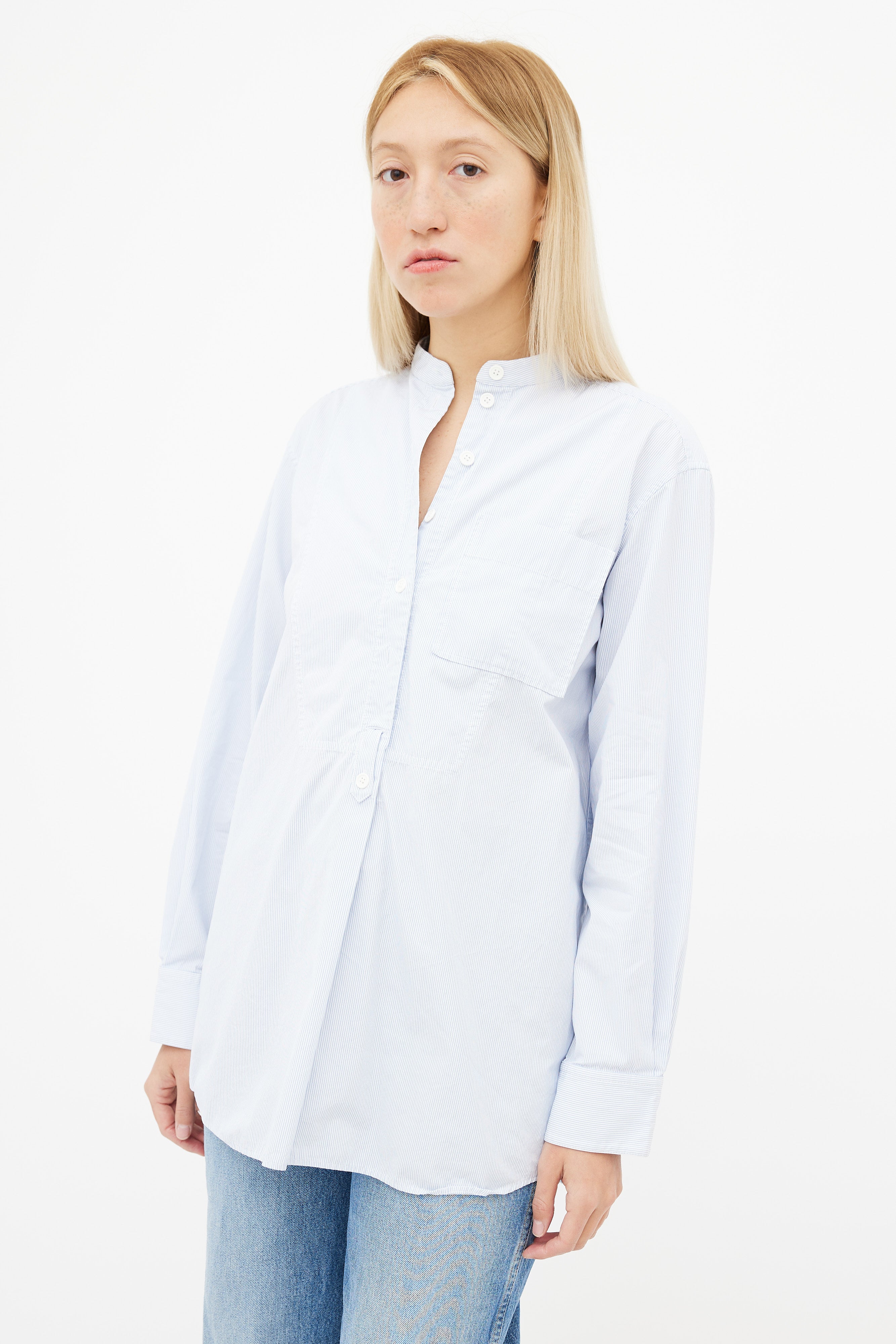Pre-owned Celine shirt in blue and white featuring stripe throughout, stand collar, long sleeve design, pocket at chest, white button closure at front and cuff, and tonal tab at end of placket.