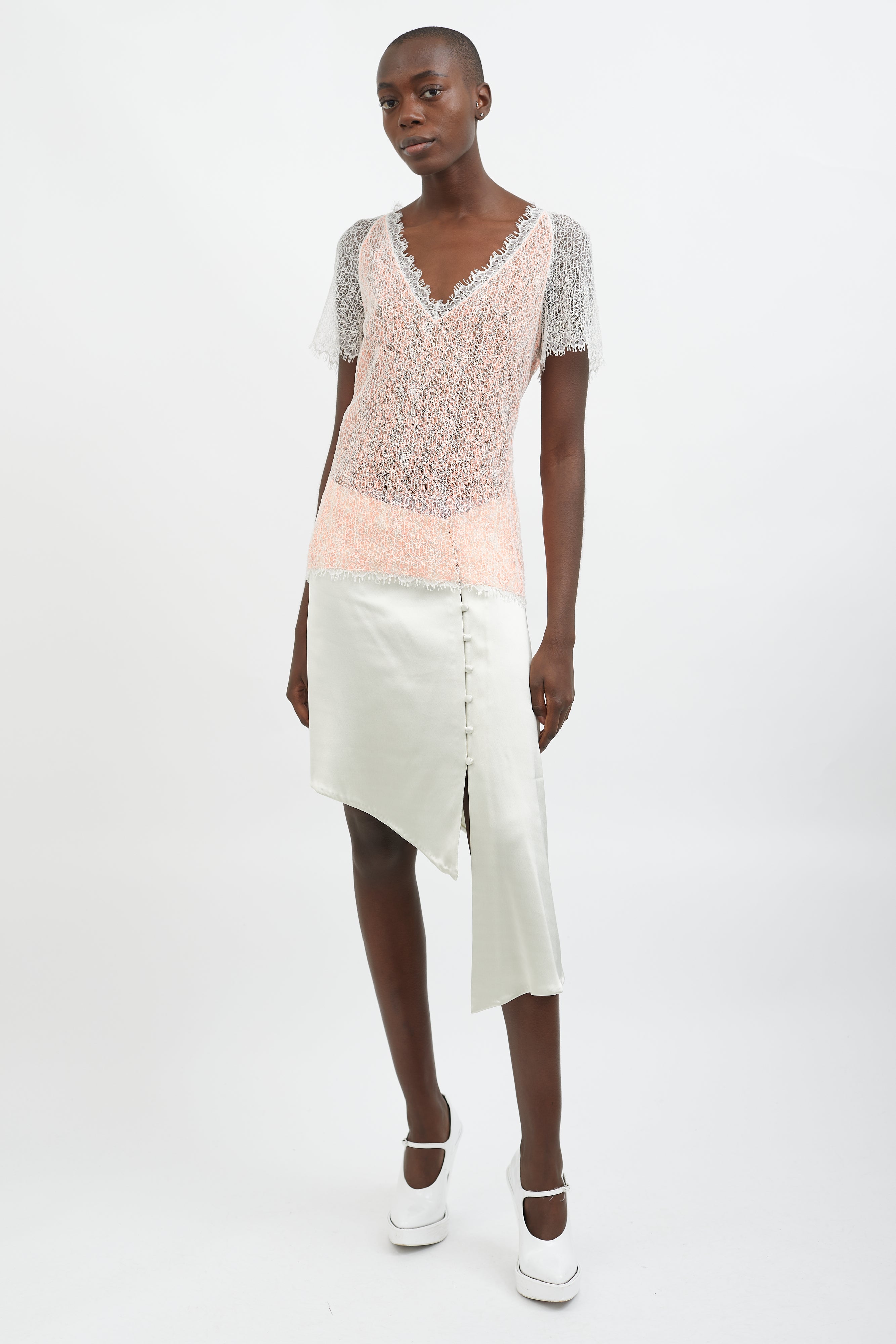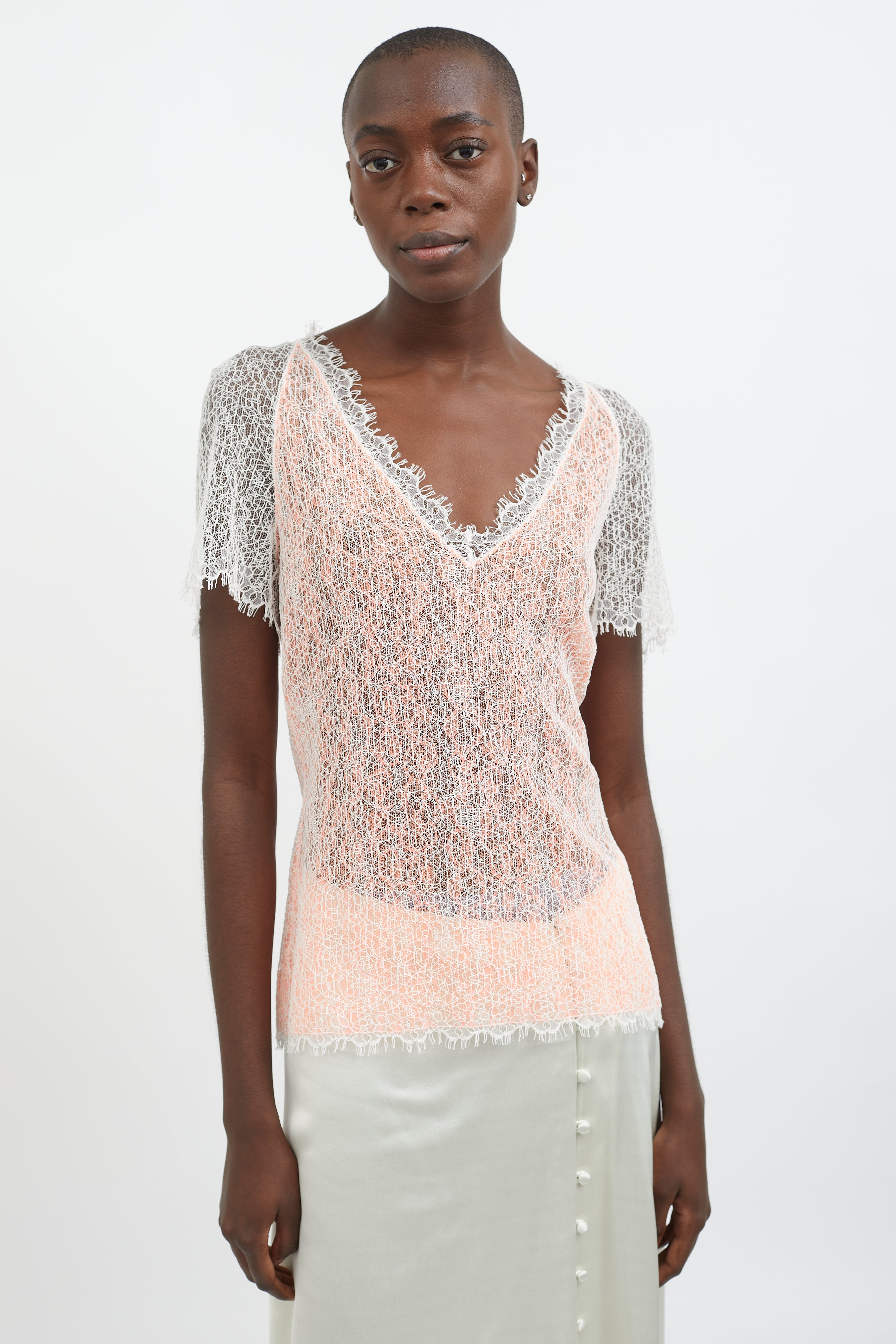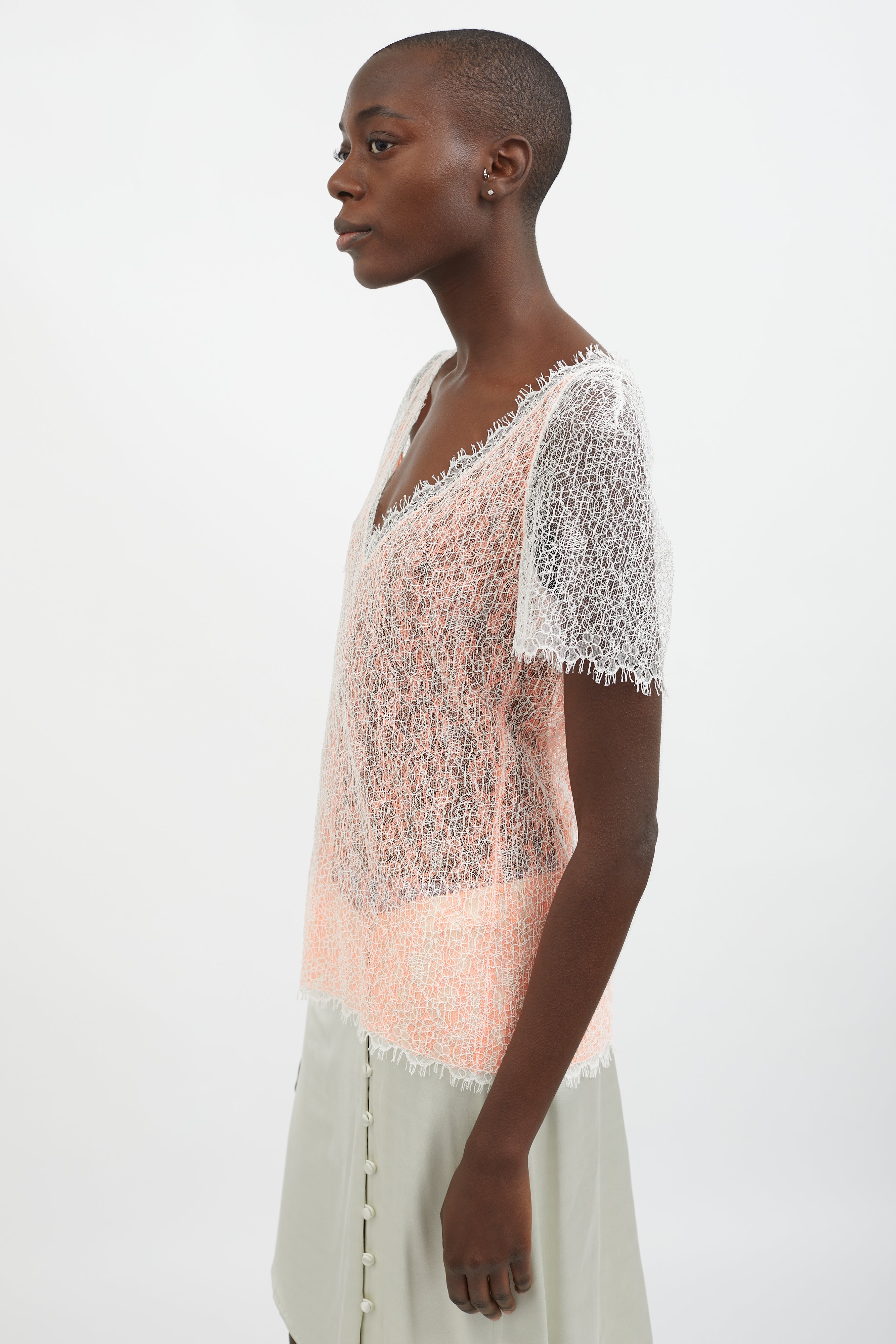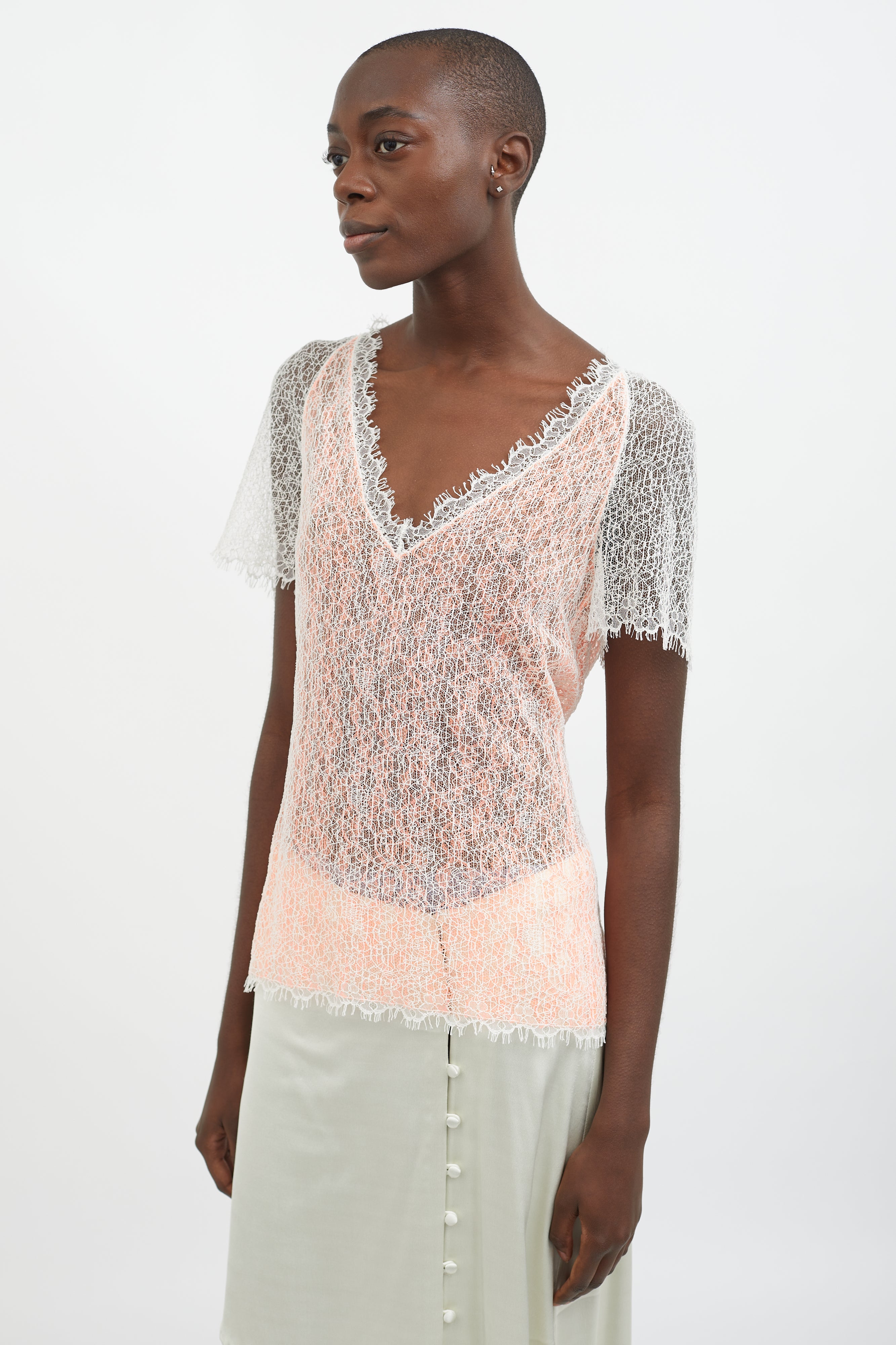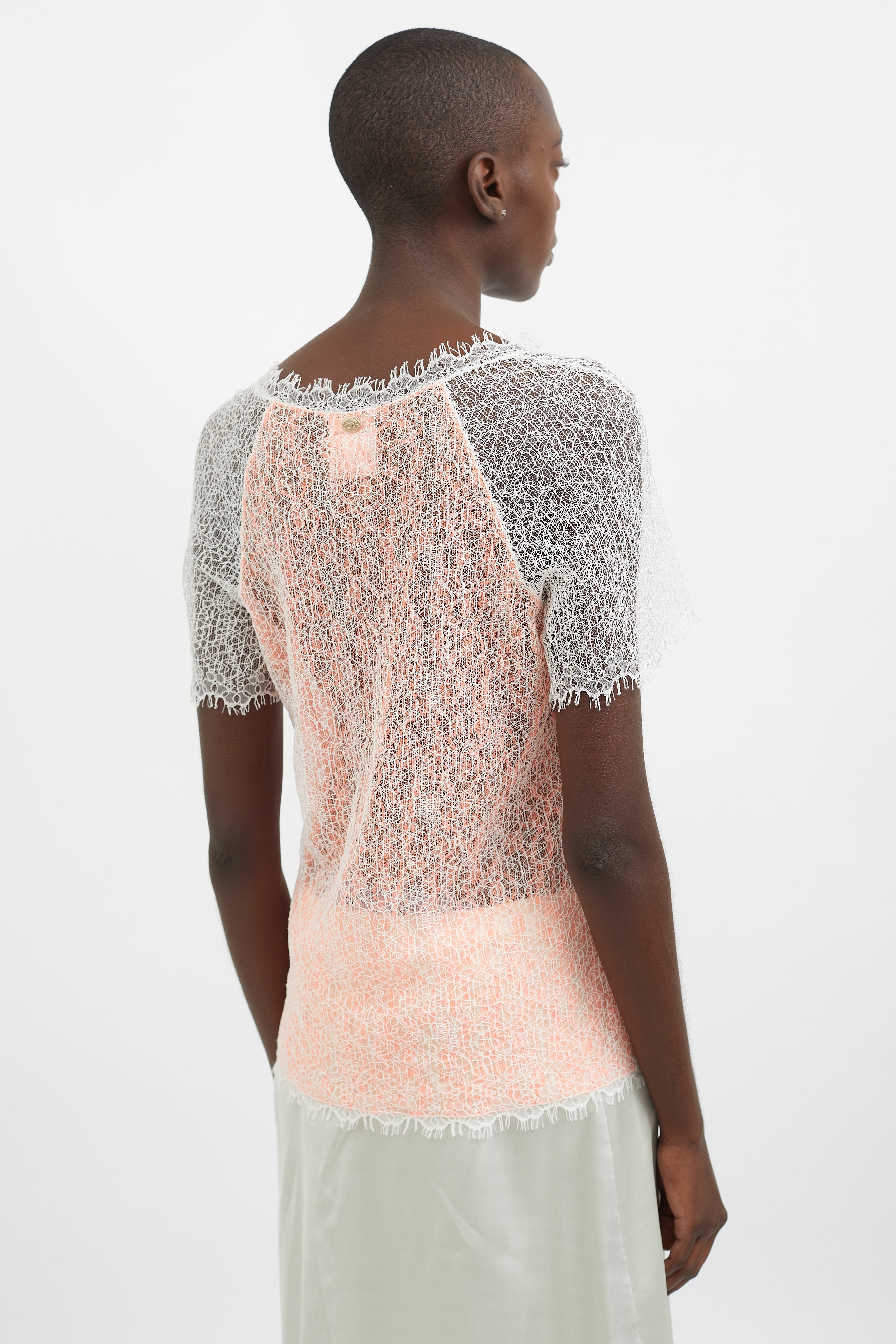 Pre-owned Chanel white and orange lace top featuring wide v-neckline, white lace raglan short sleeves, mix white and orange lace details at front and back.