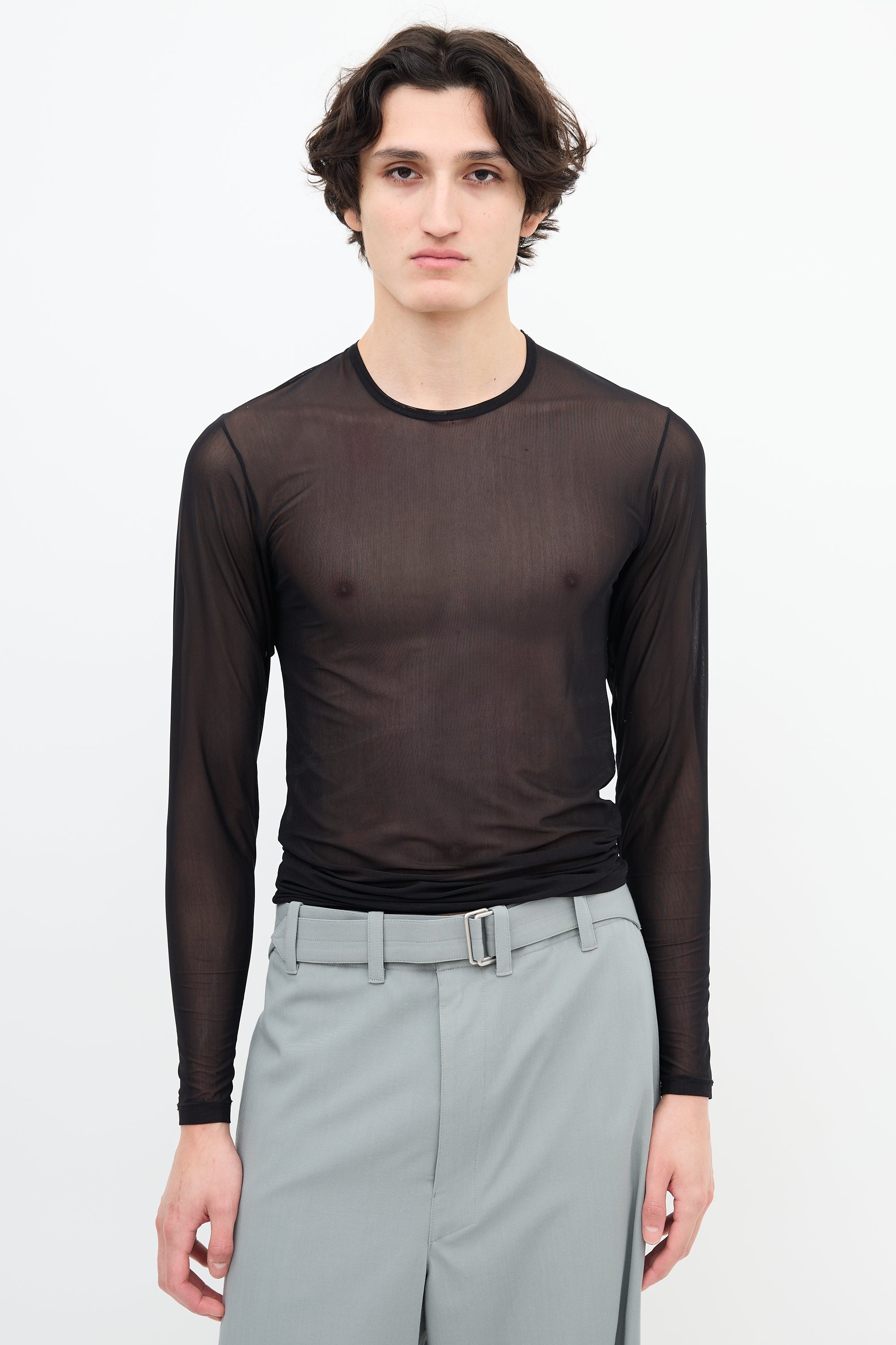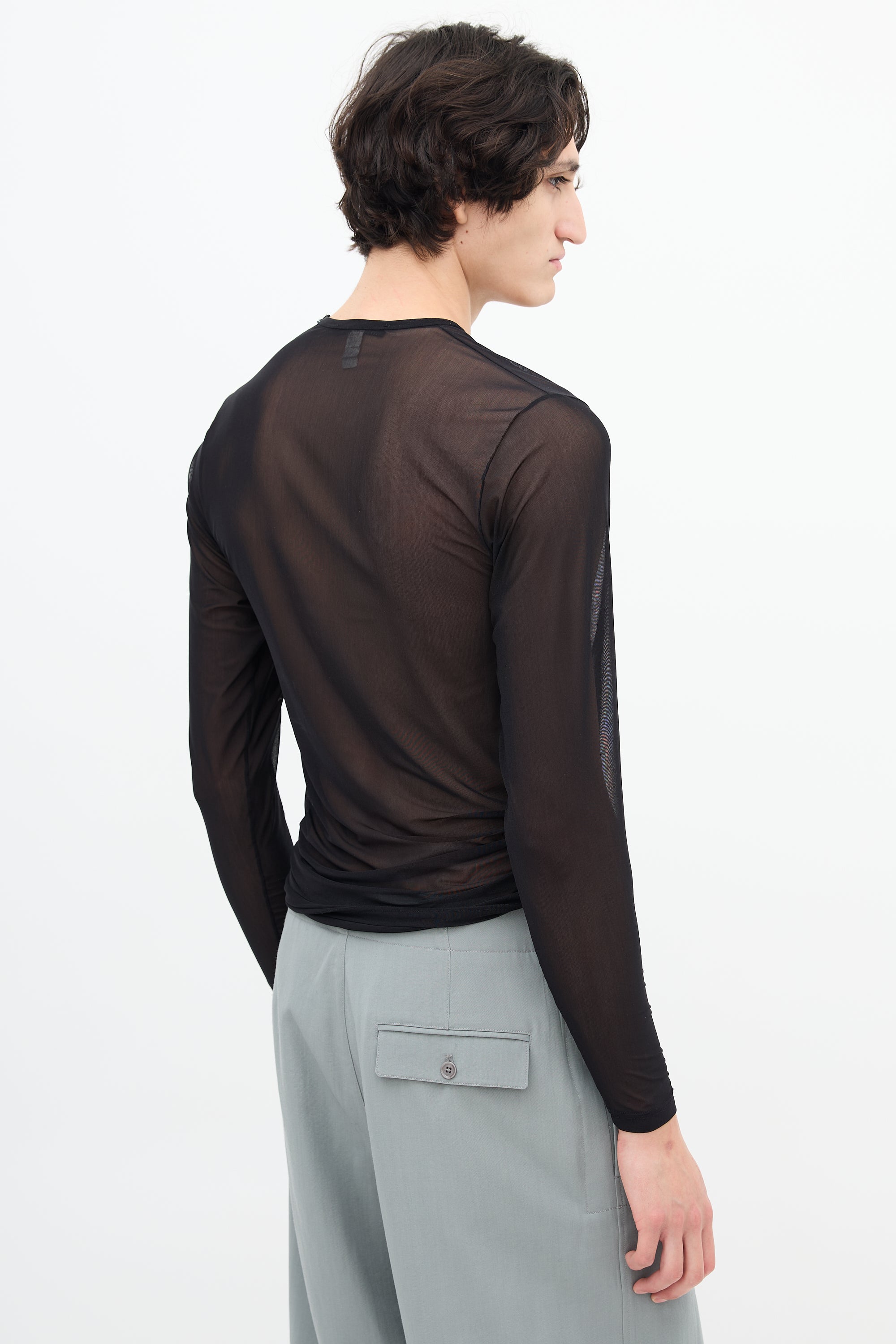 Pre-owned Gucci Spring/Summer 1998 black mesh long sleeve top featuring crew neckline. Unlined. Tom Ford era design