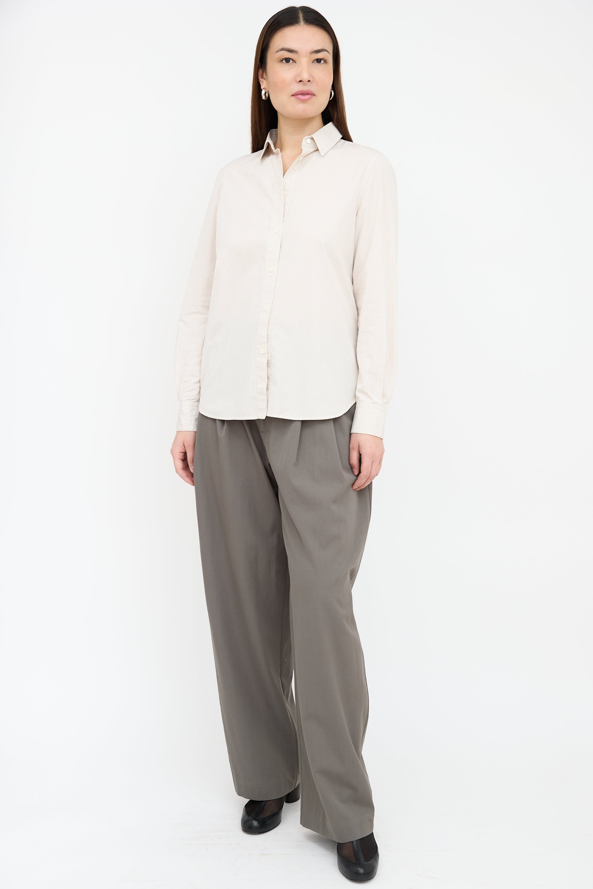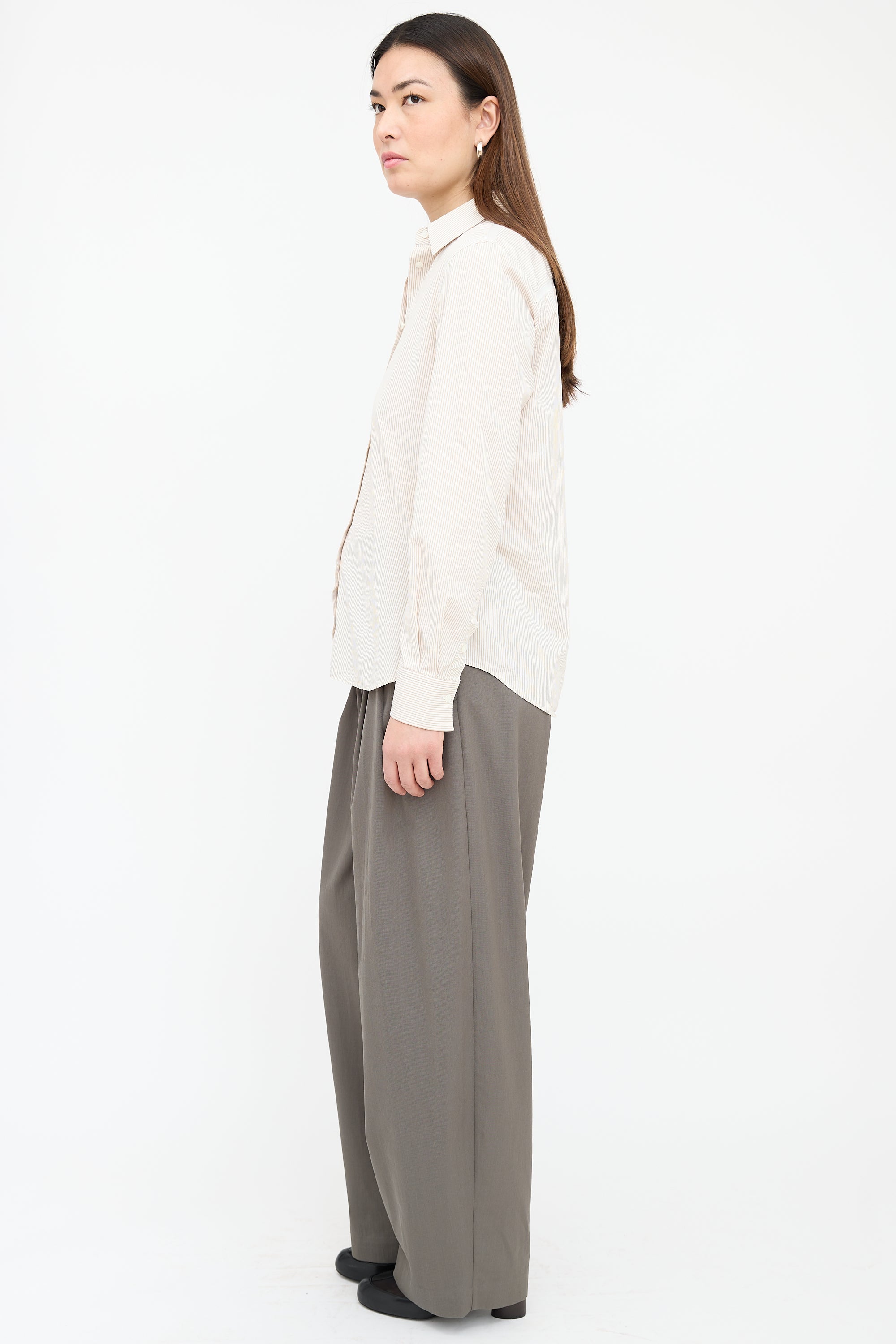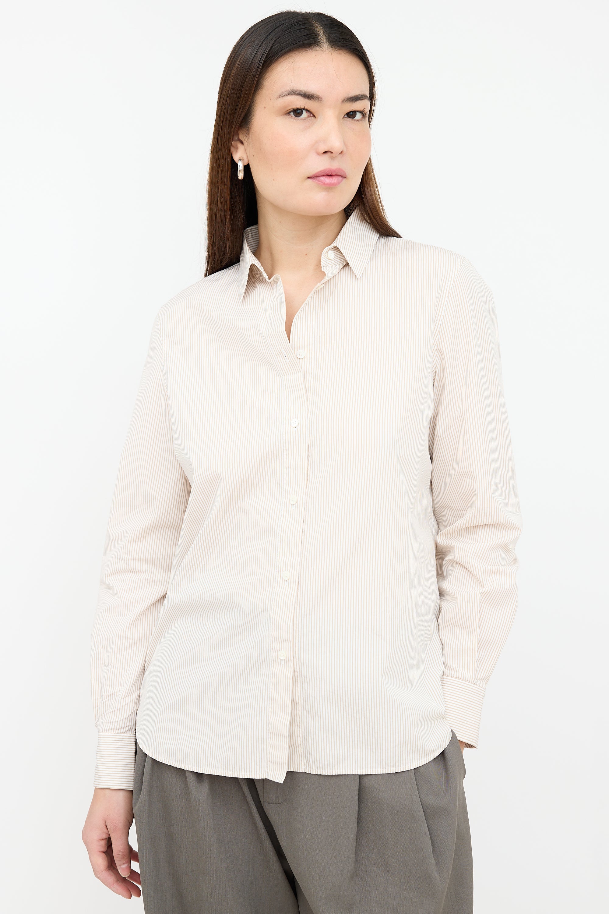 Pre-owned Loro Piana white shirt featuring a brown stripes, pointed collar, buttoned front, buttoned cuffs, sheer panel at shoulders and back yoke, and centre back box pleat.