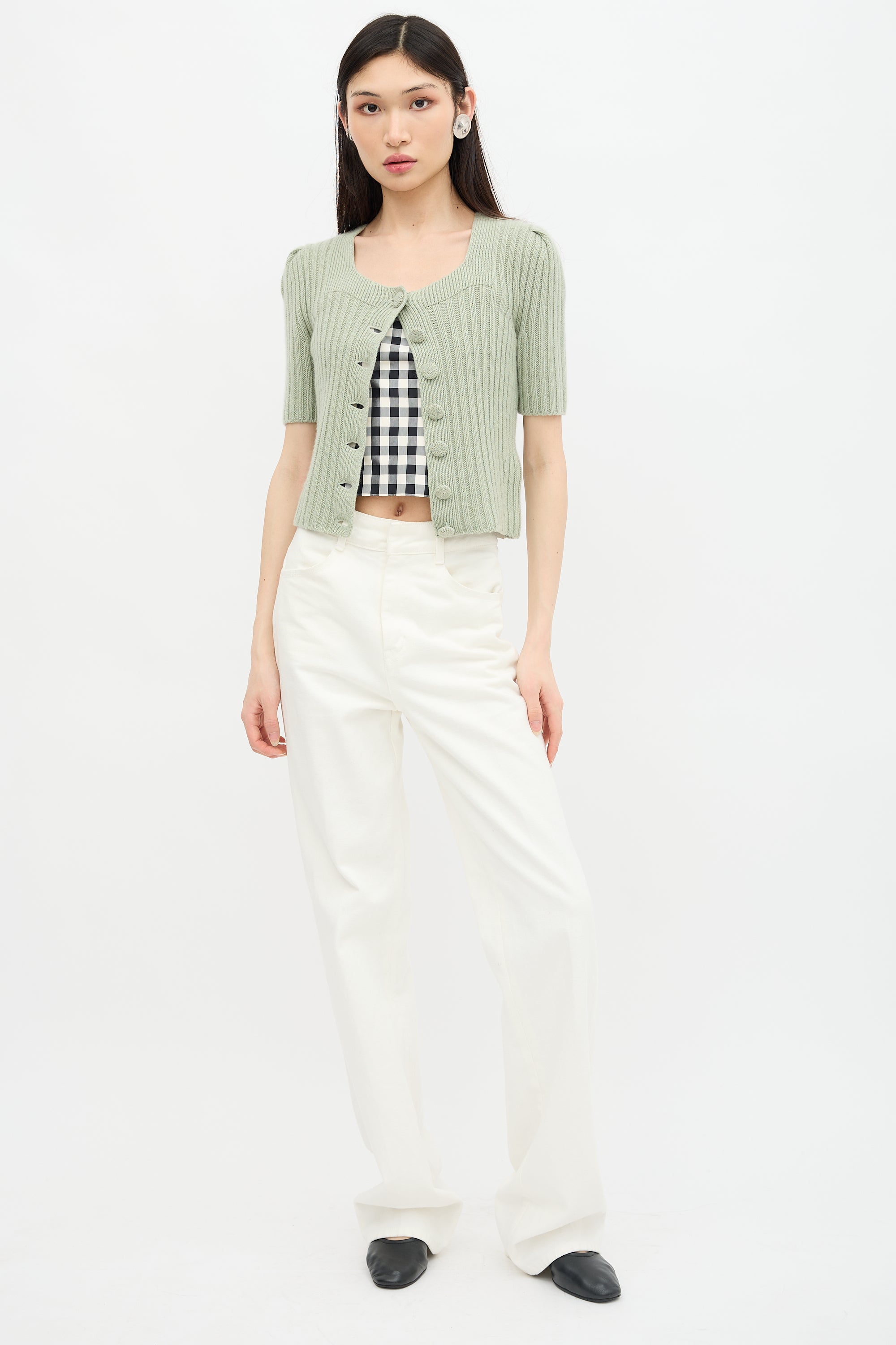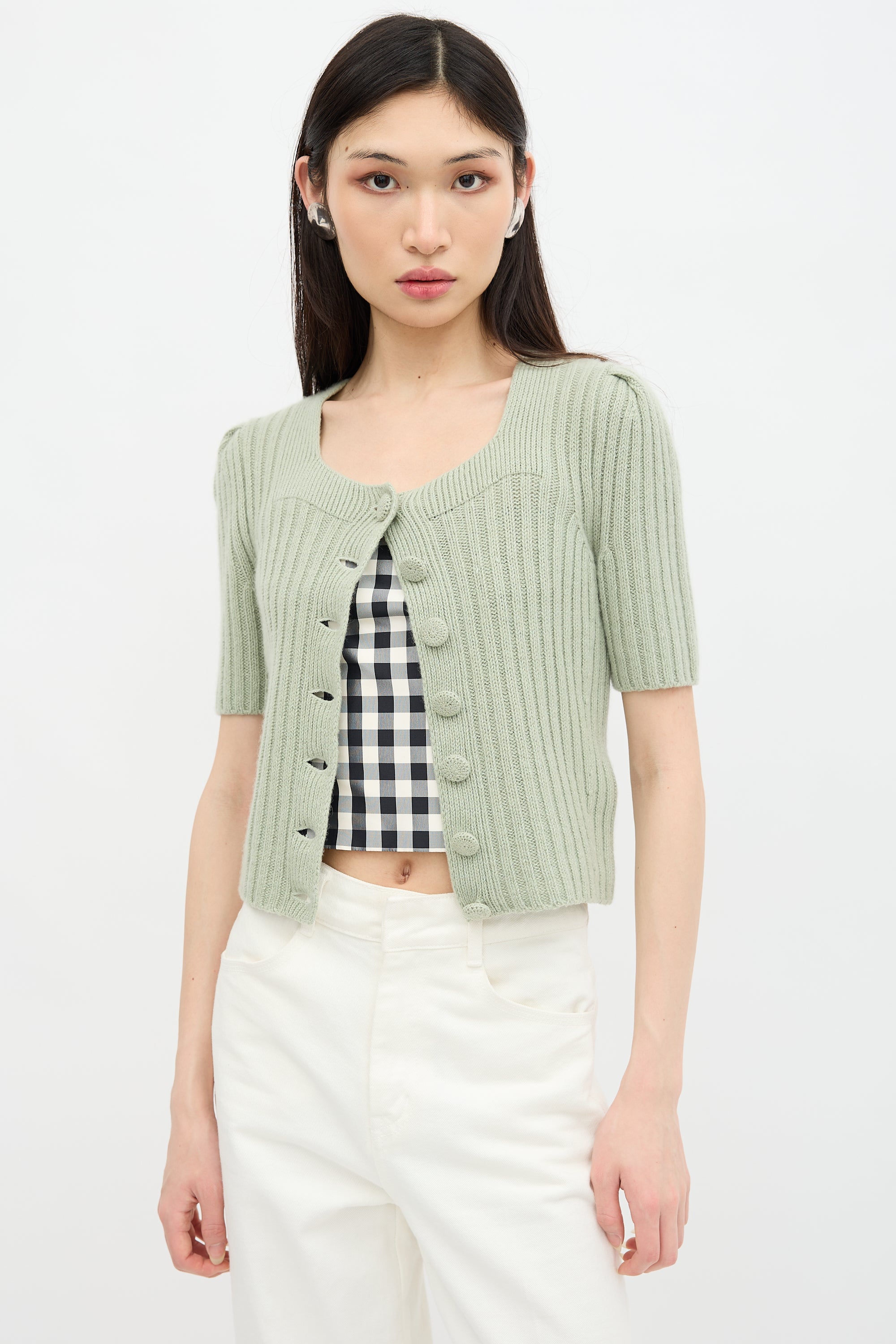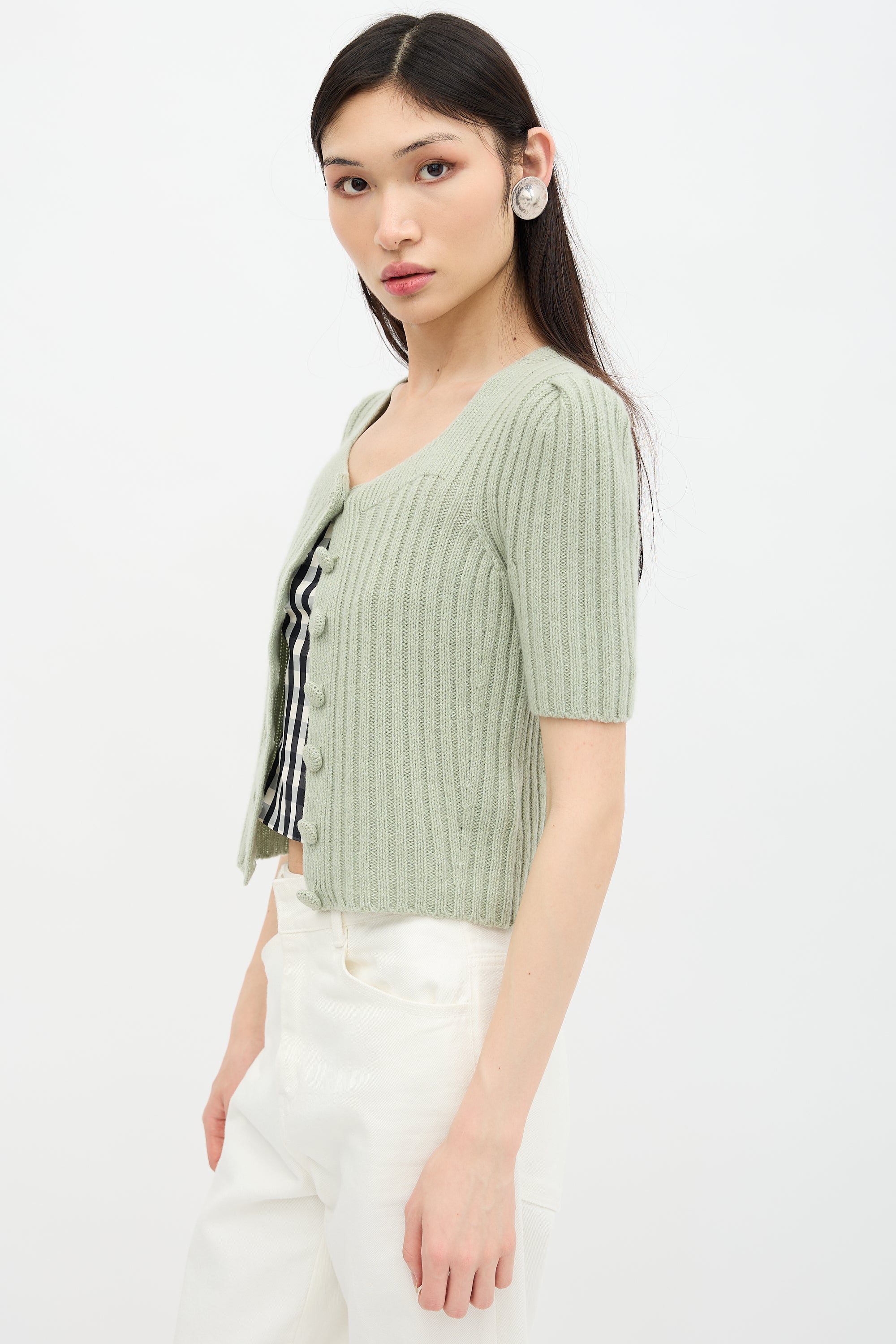 Pre-owned Ralph Lauren green linen and cashmere blend knit shirt featuring square neckline, pleated sleeves, and button front.