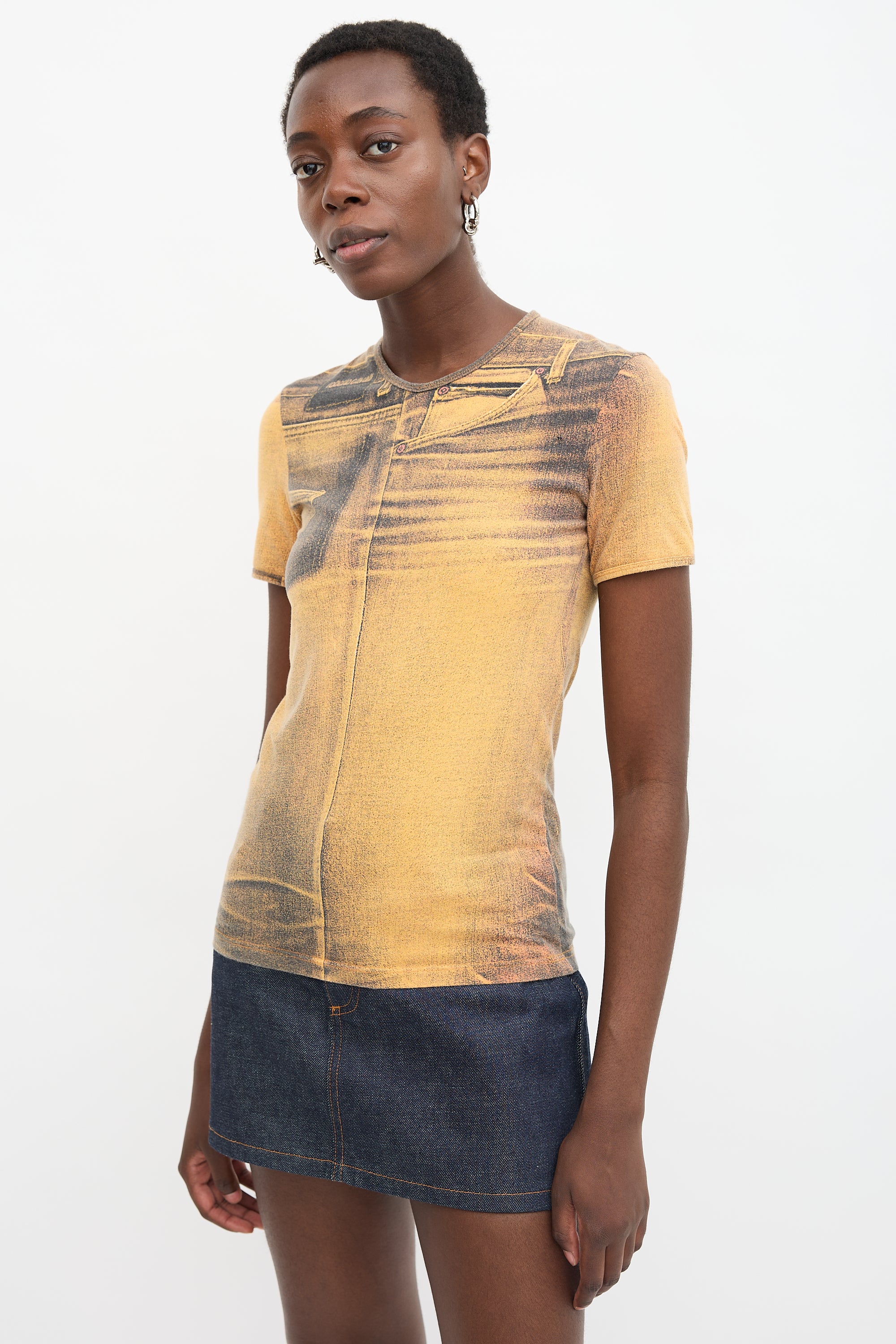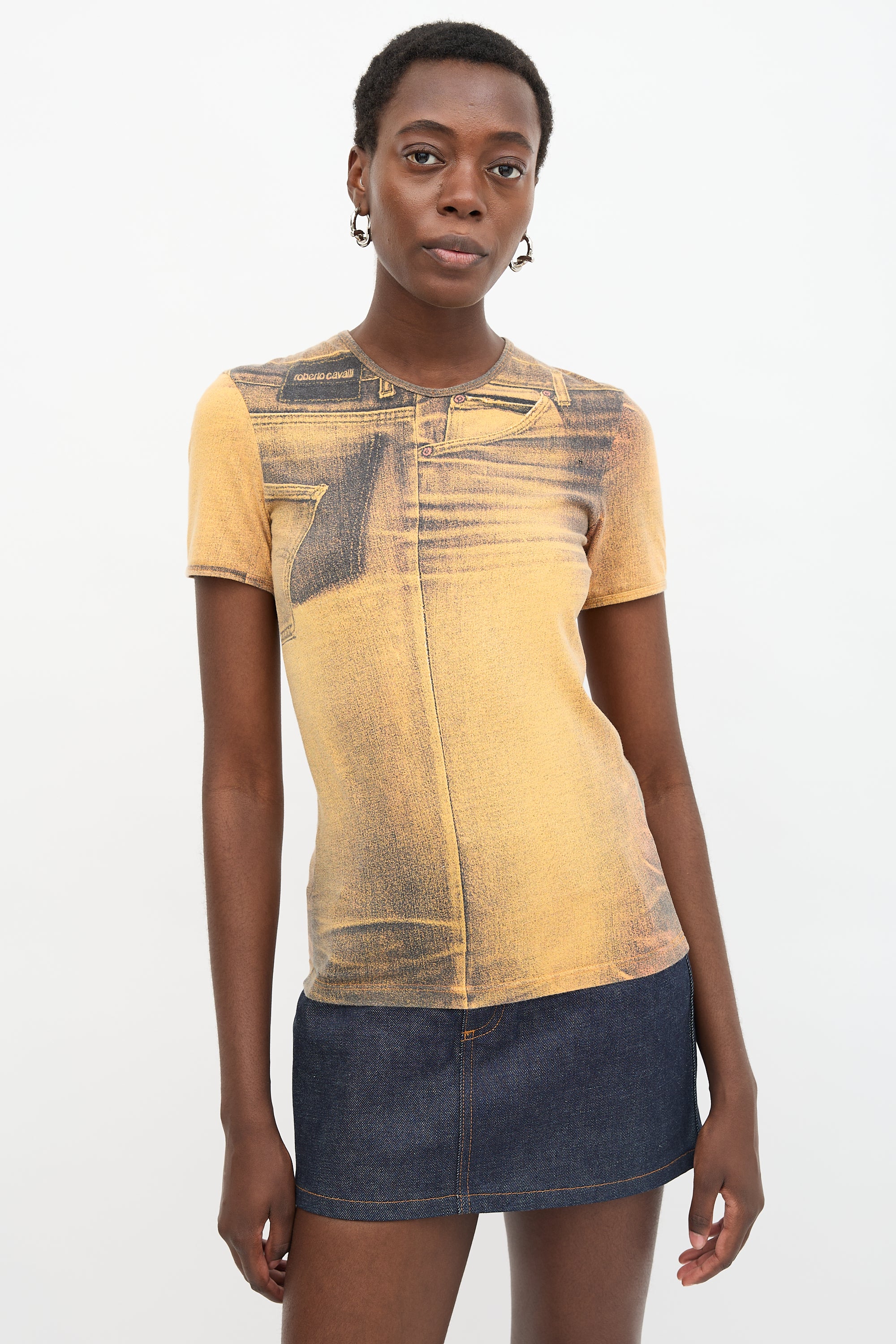 Pre-owned Roberto Cavalli vintage yellow t-shirt featuring logo and jeans Trompe L'Oeil print and crew neckline. c. 2000s