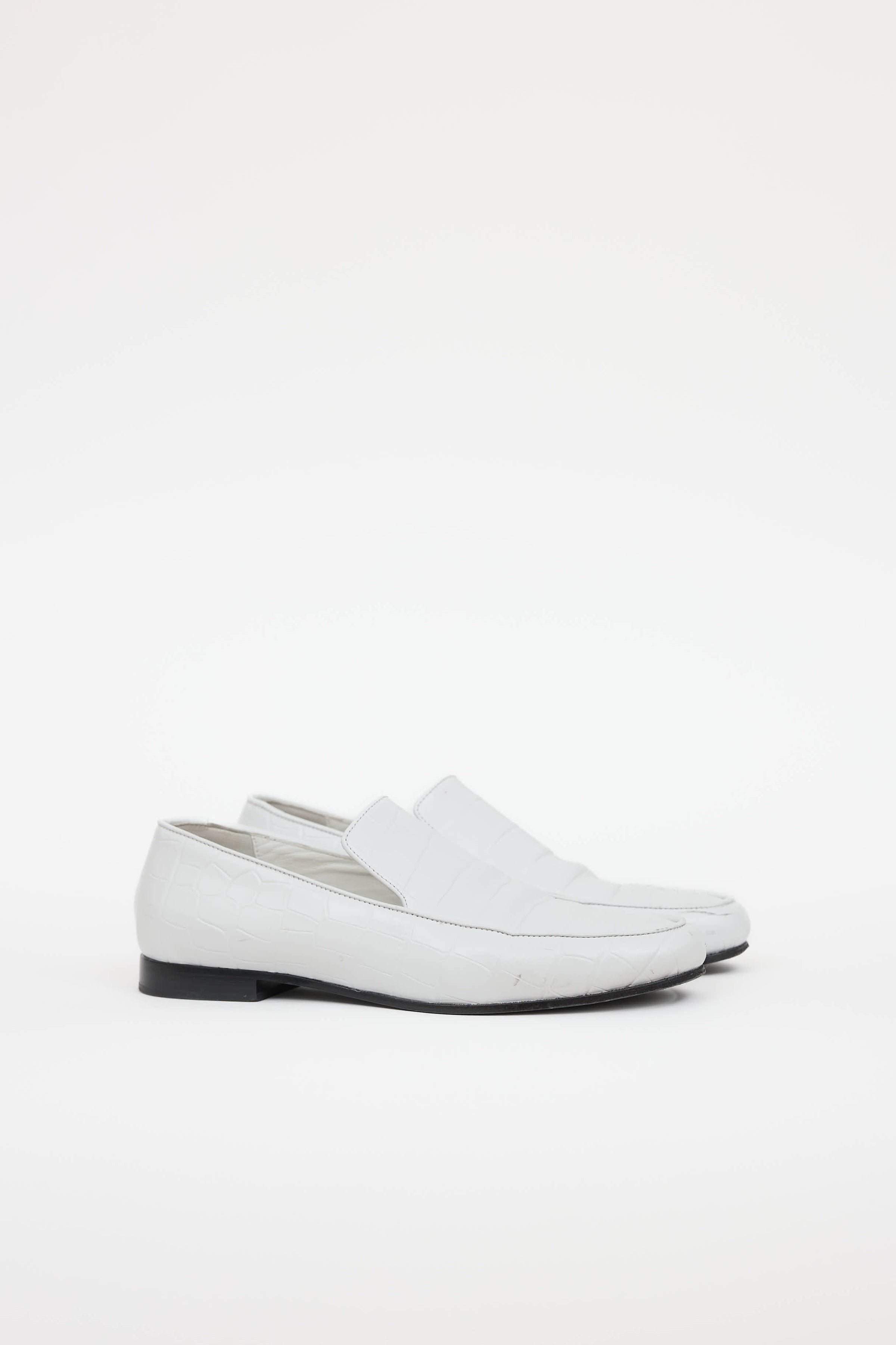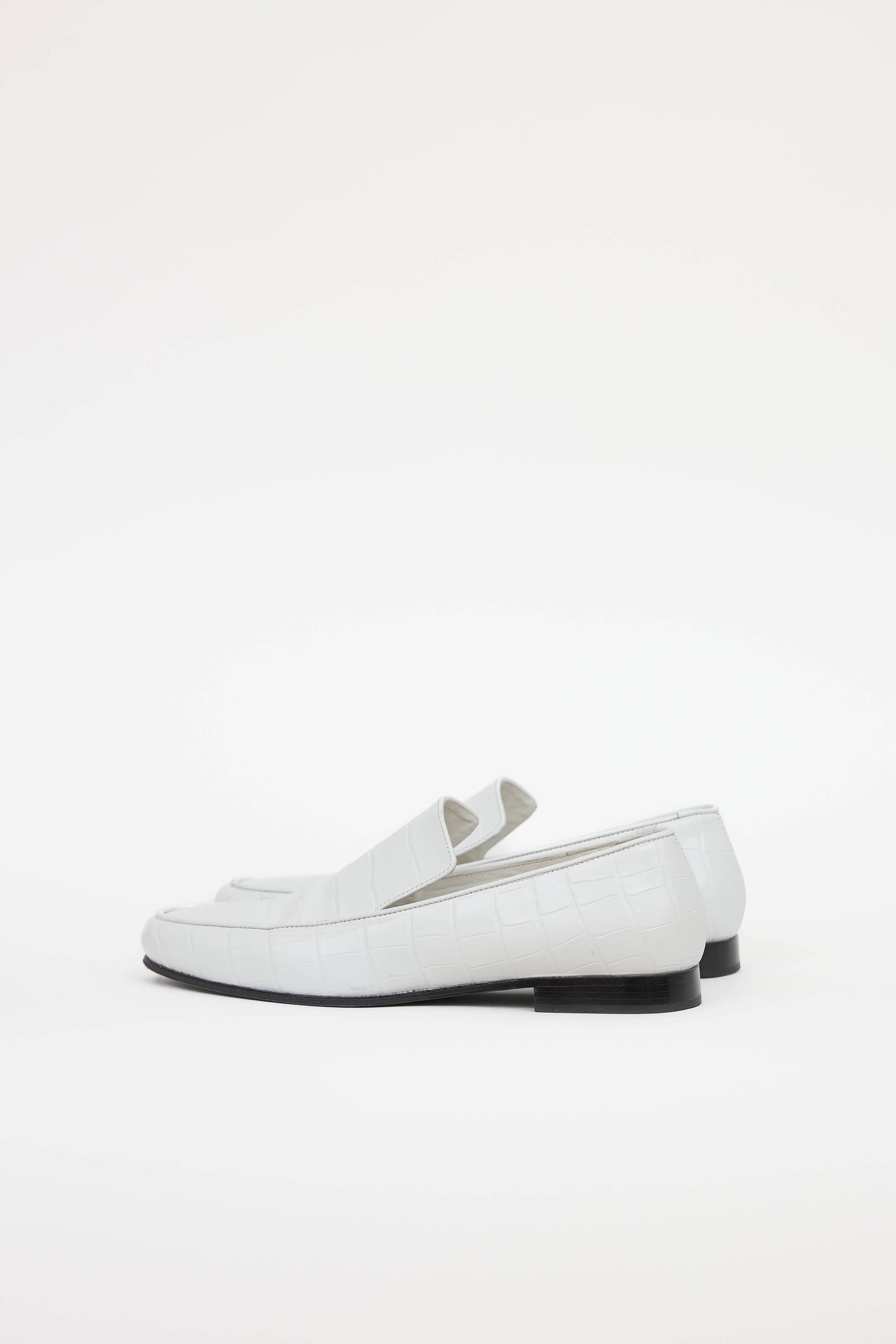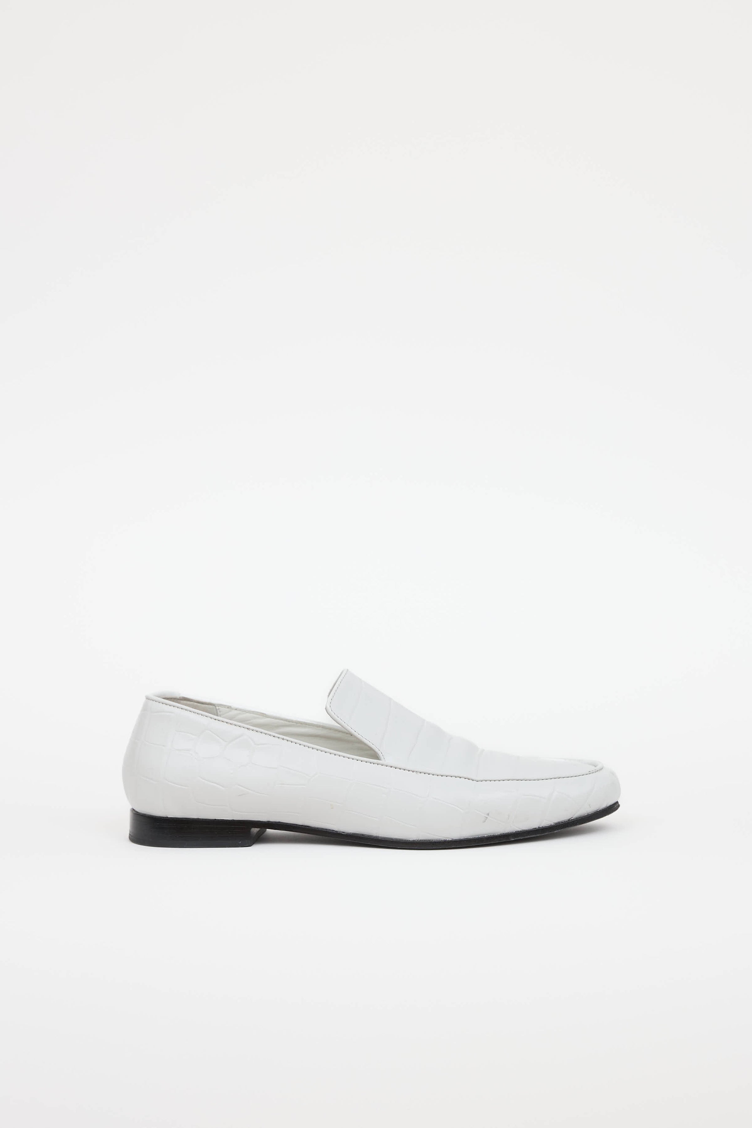 Pre-owned Toteme white leather The Oval loafers featuring almond toe, croc effect leather upper, slip on entry, and stacked block heel.