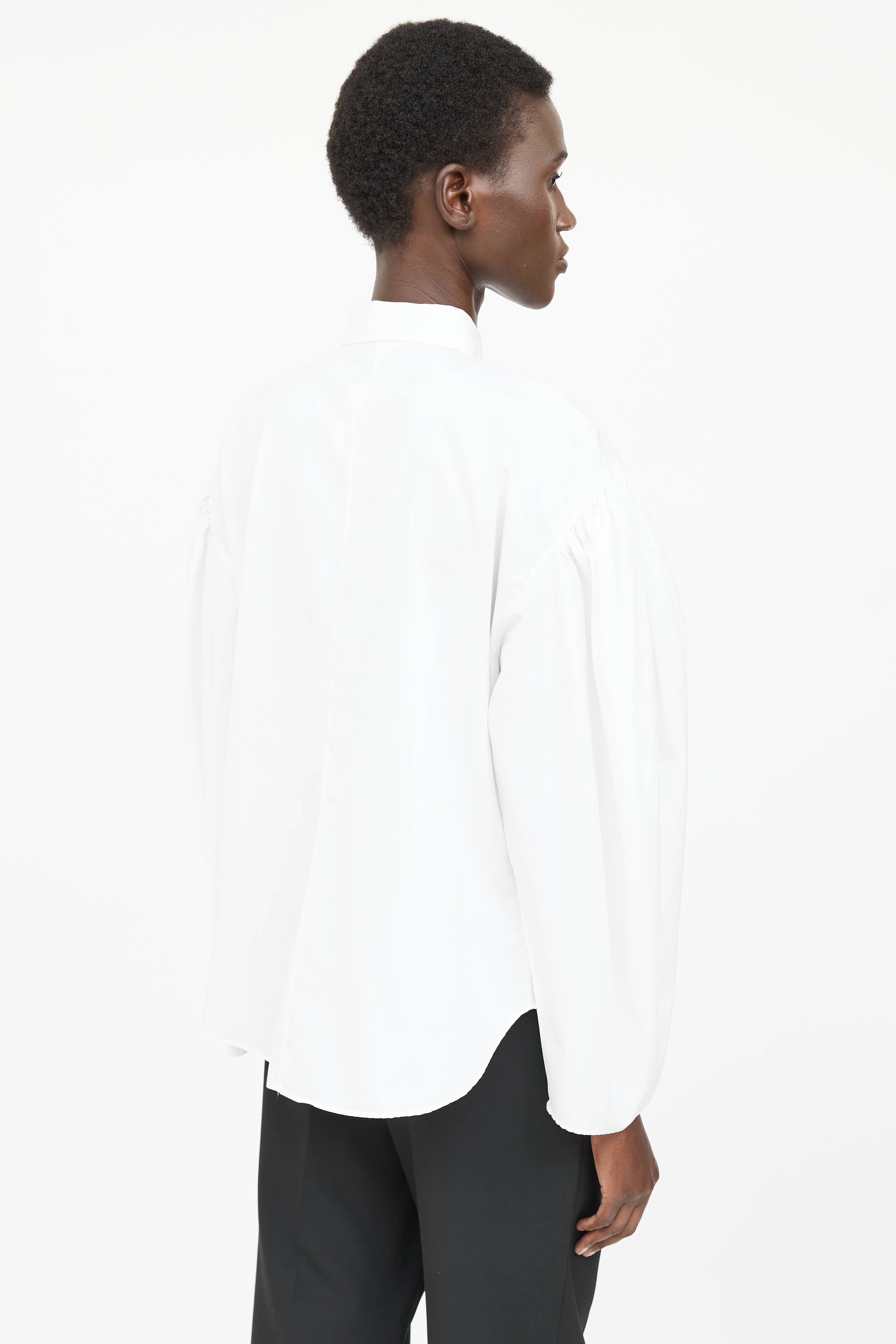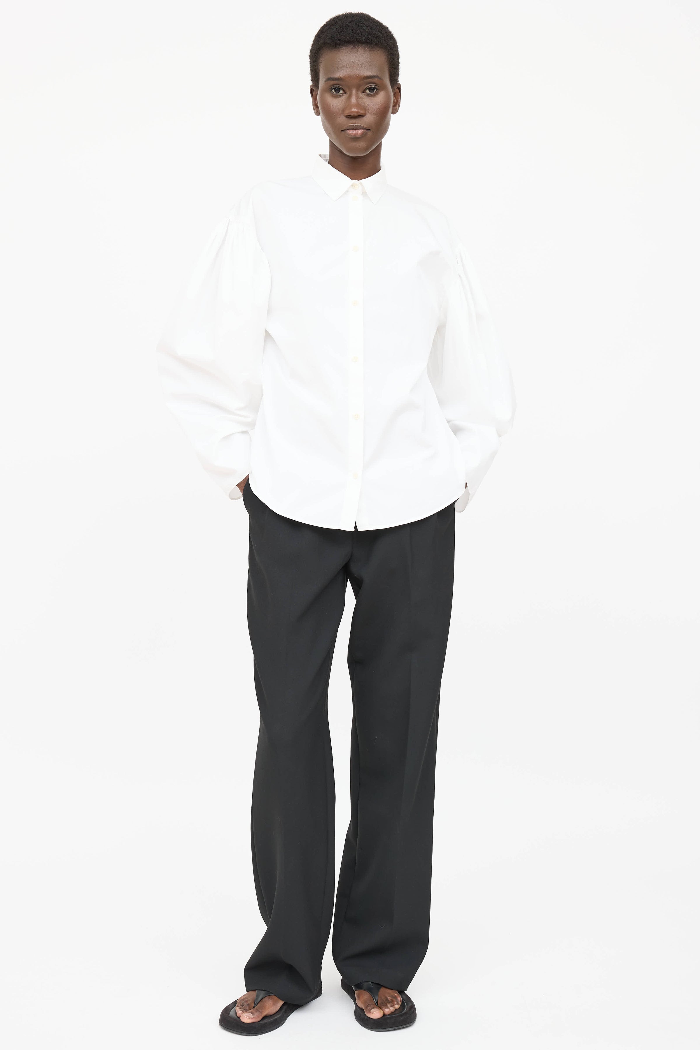 Pre-owned Toteme white long sleeve top featuring pointed collar, button front, and puffed pleated shoulders.