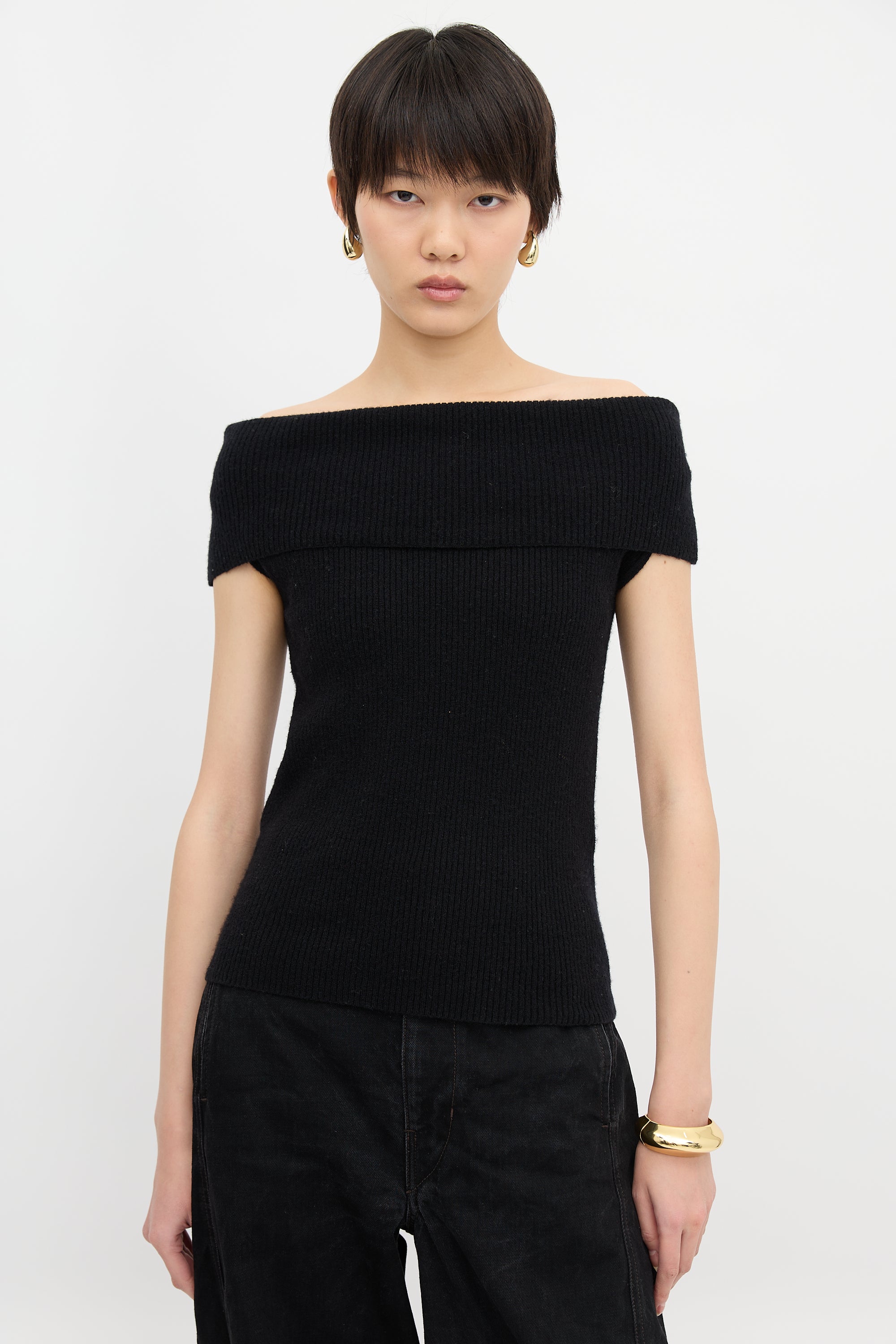 Pre-owned Toteme black ribbed knit top featuring foldover topline and off shoulder design.