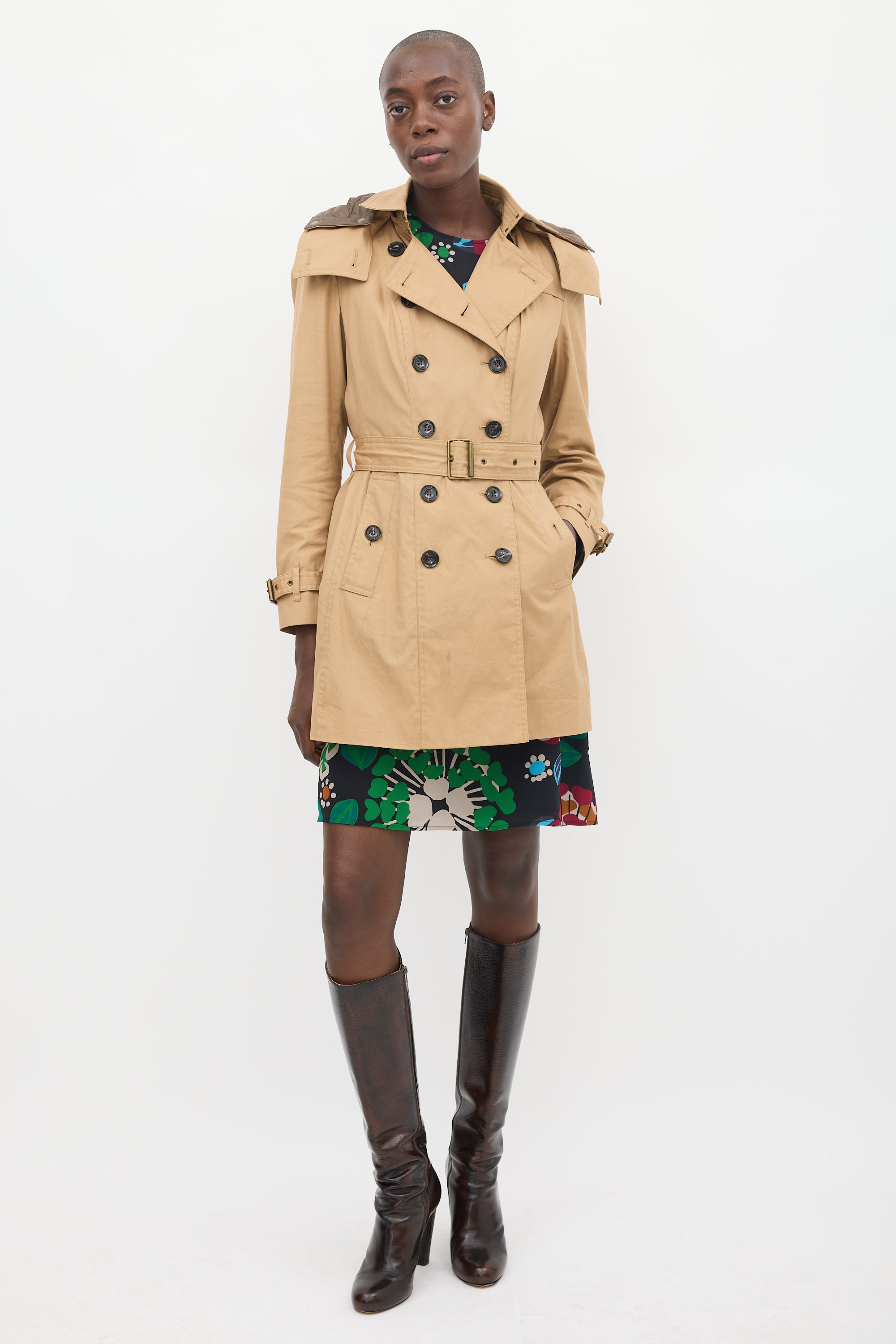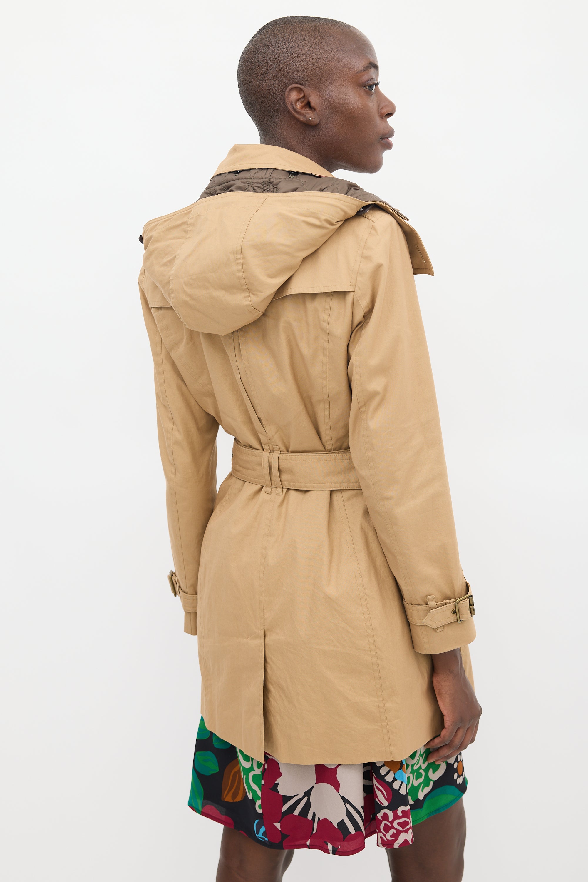Pre-owned Burberry brown cotton midi trench coat featuring a collared neck with signature Nova Check facing, double breasted button up front, storm flap at left shoulder, storm shield at upper back, two slip pockets at front hip, back vent, belted waist, epaulettes at shoulders, long sleeves with adjustable straps at cuffs, detachable hood, and removable padded lining at interior body and hood. Lined.