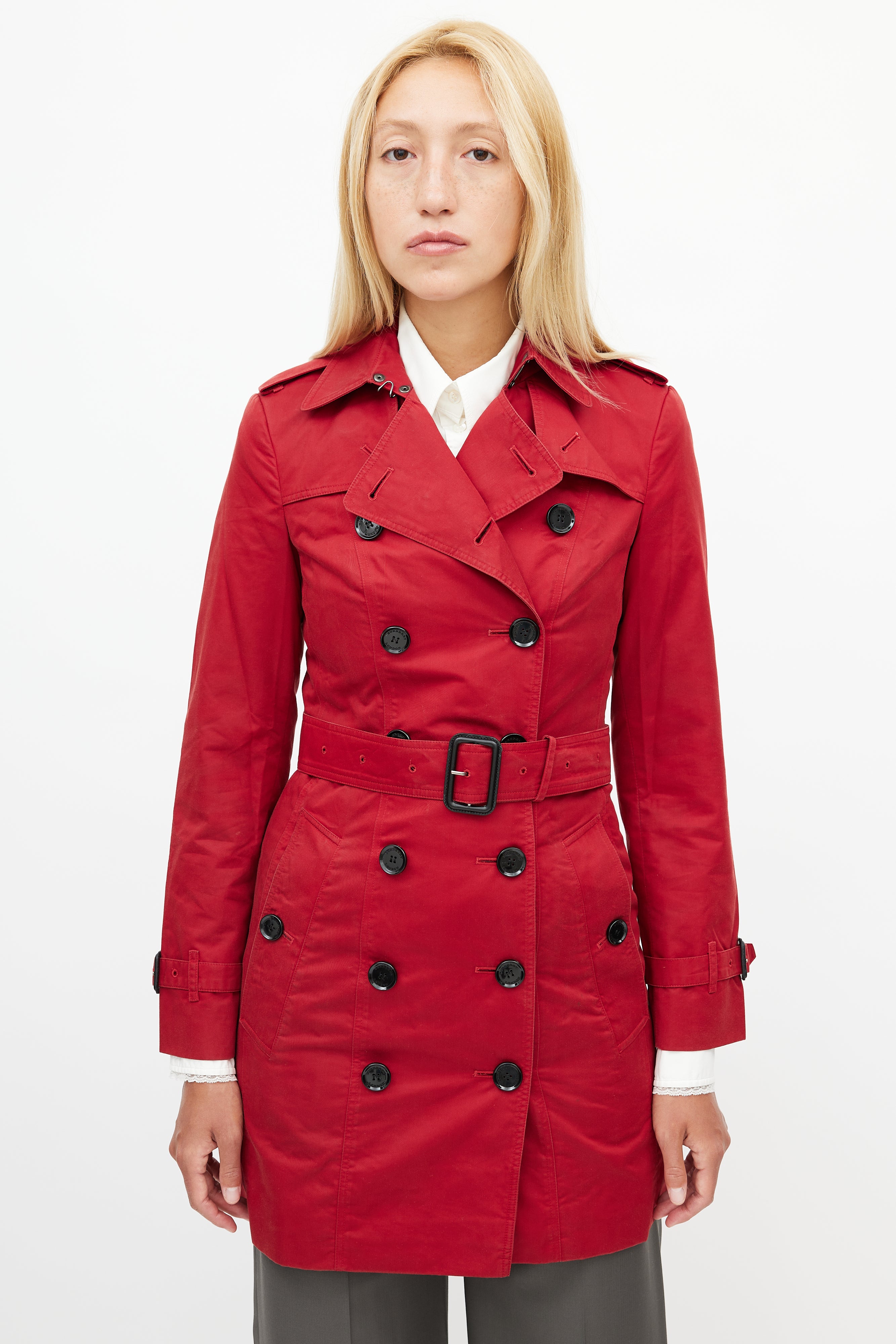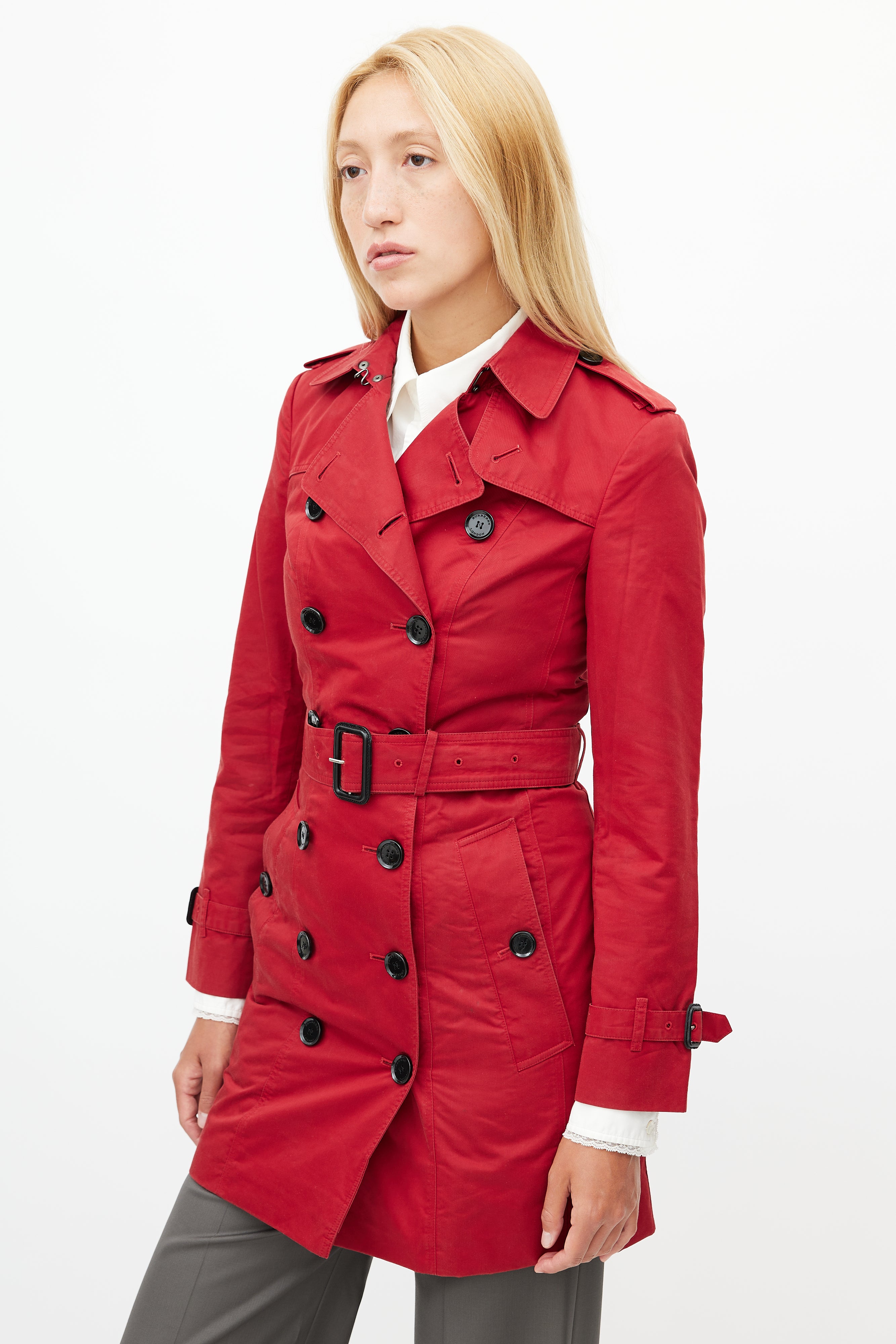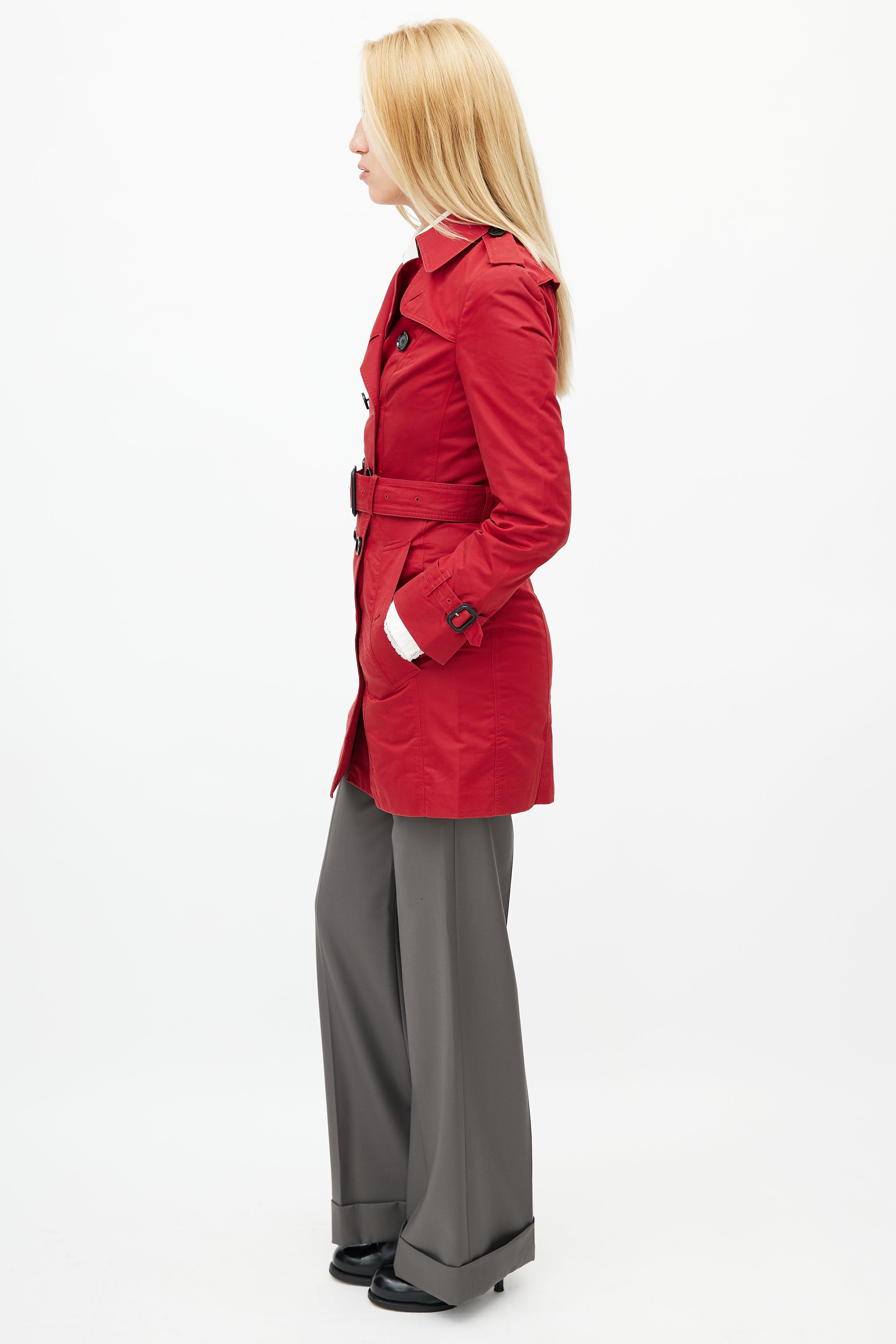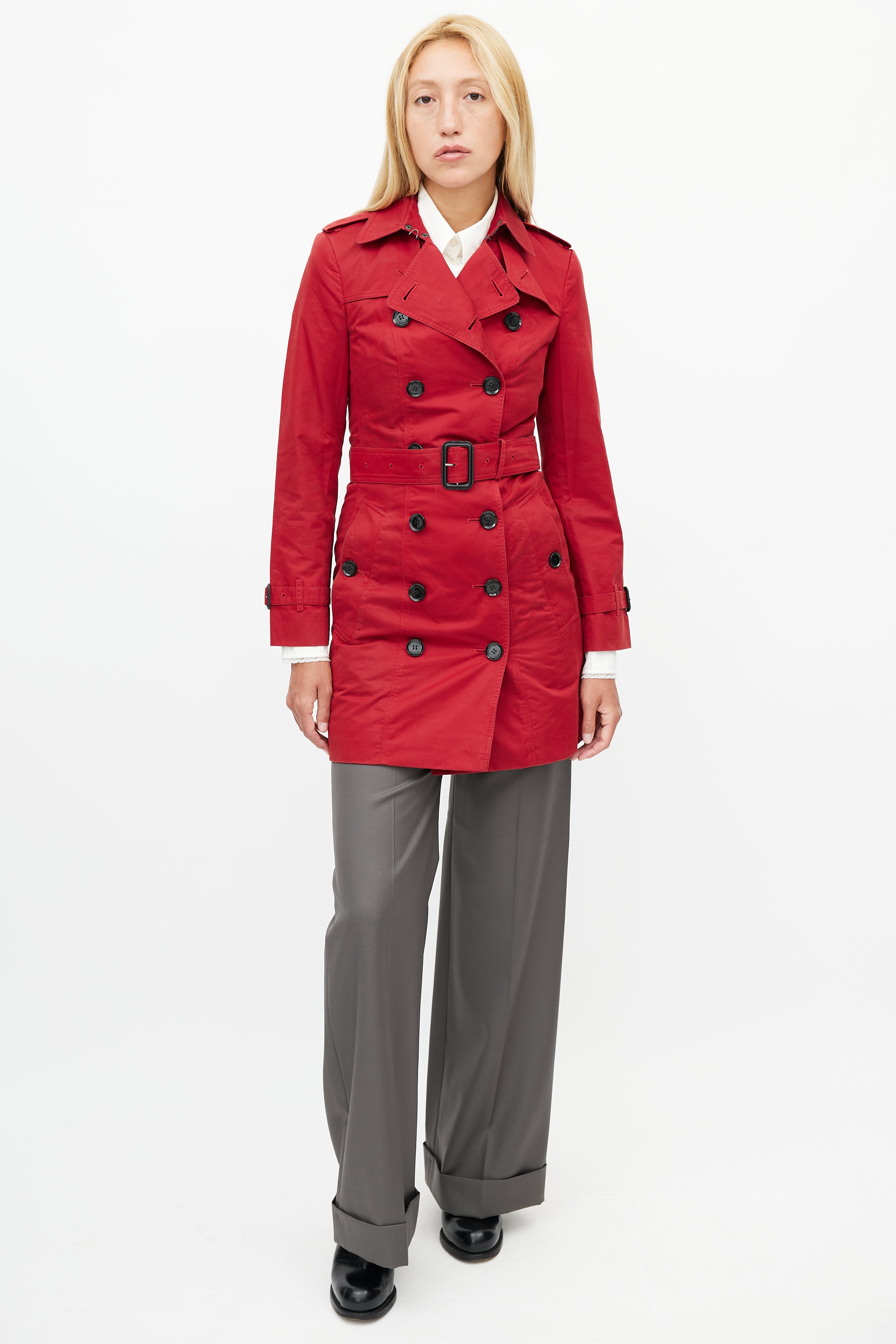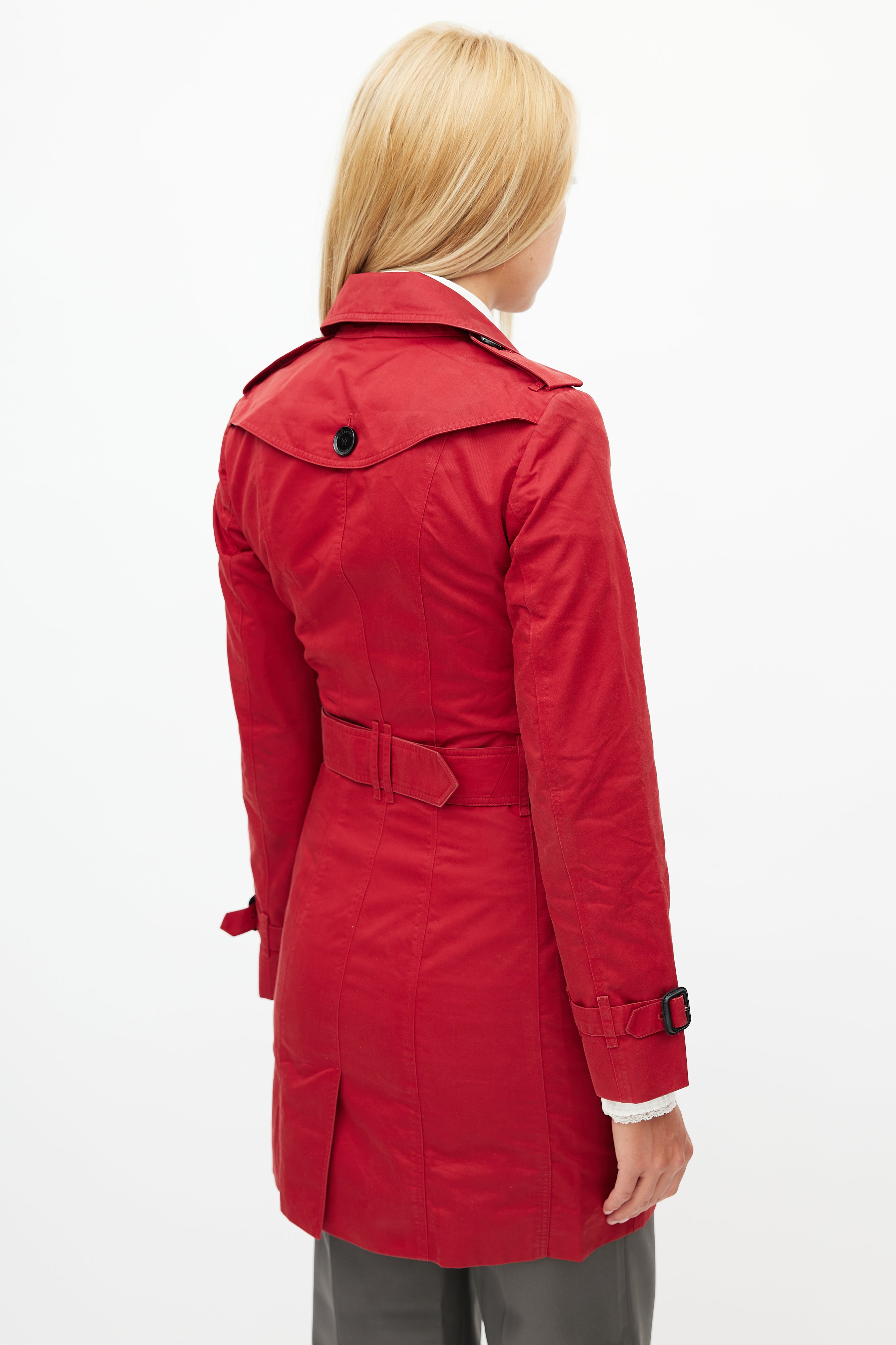 Pre-owned Burberry red trench coat featuring a notched lapel, epaulets at shoulder, two buttoned pockets at hip, long sleeves with belted cuffs, adjustable belt at waist, and double breasted button up front. Lined.