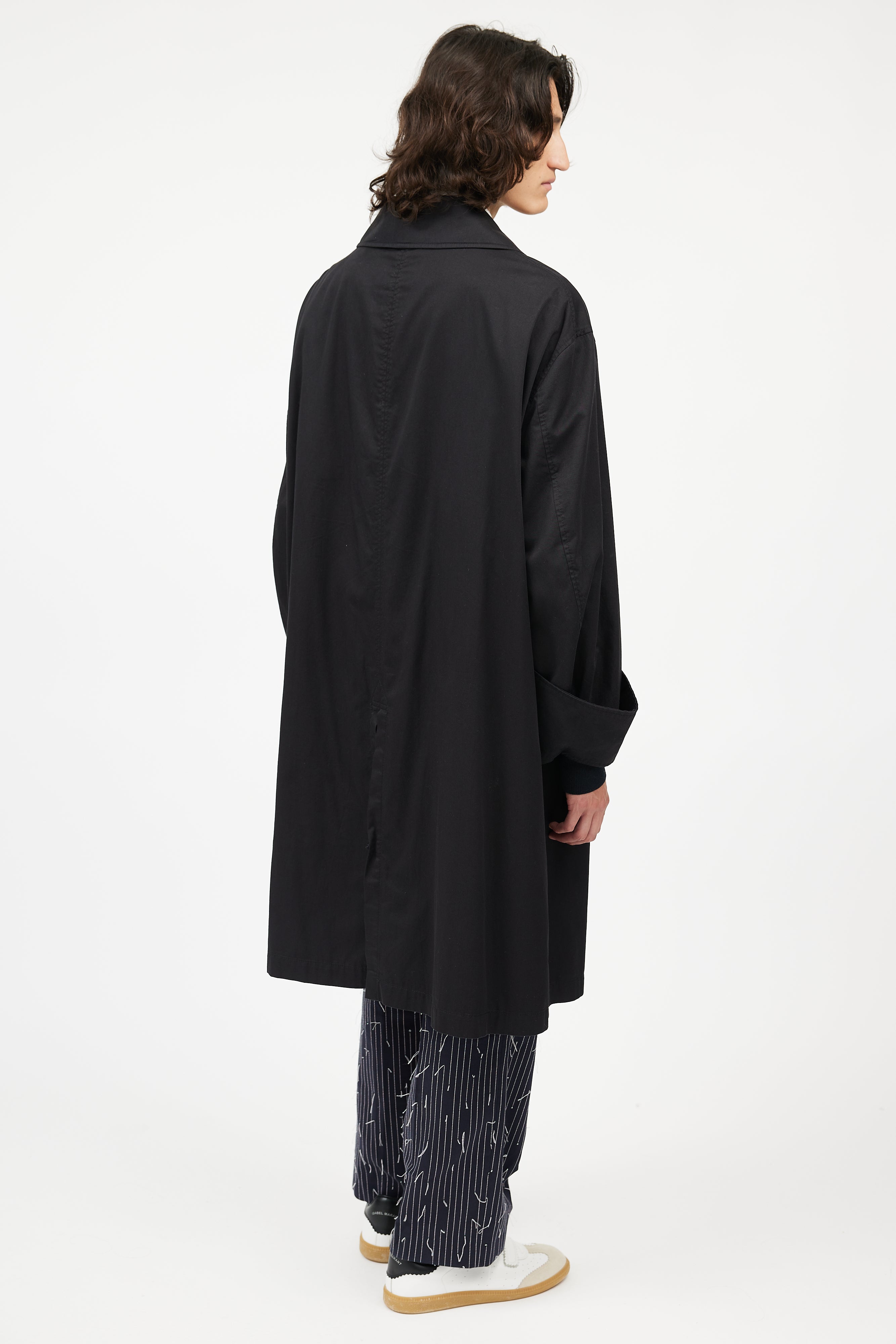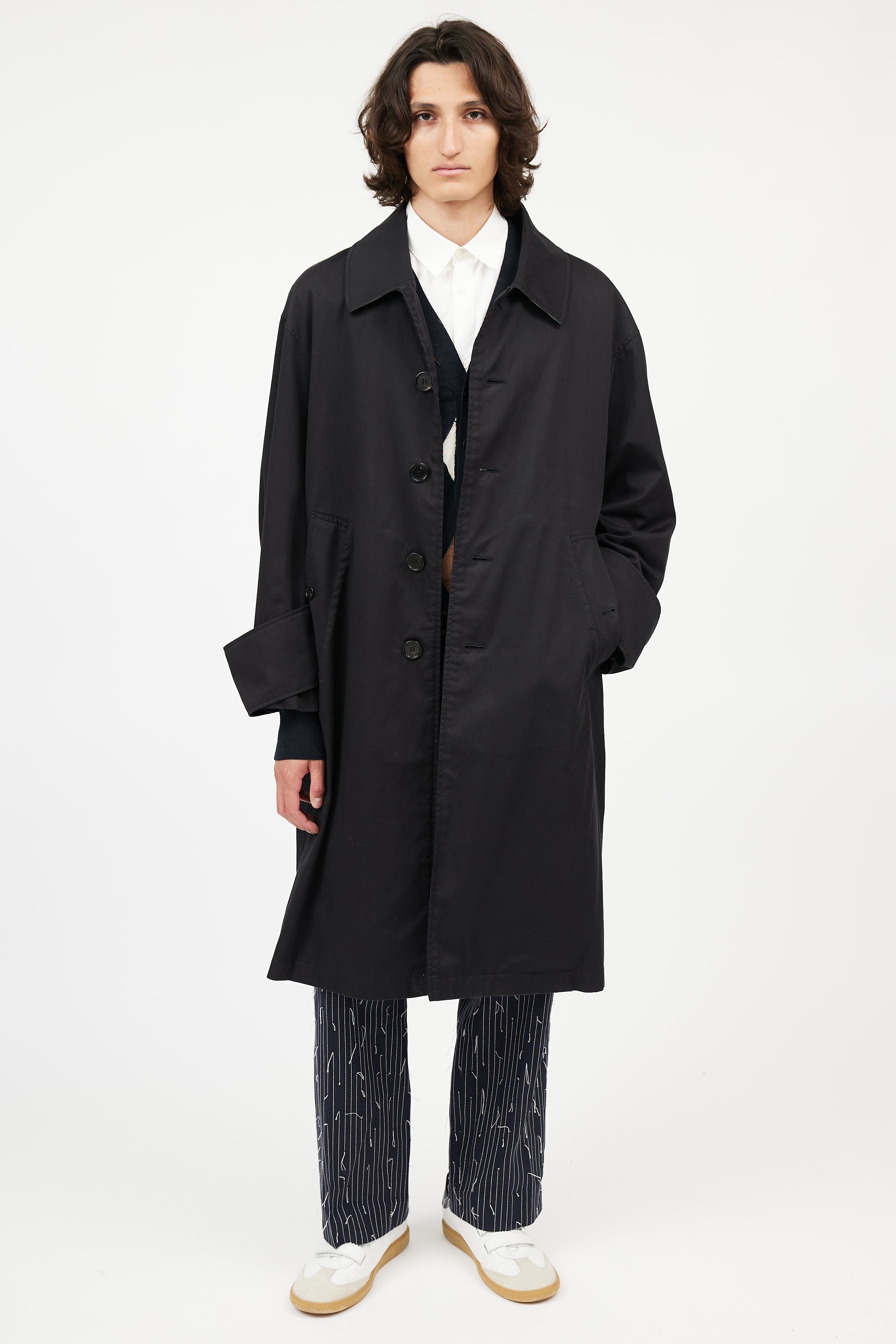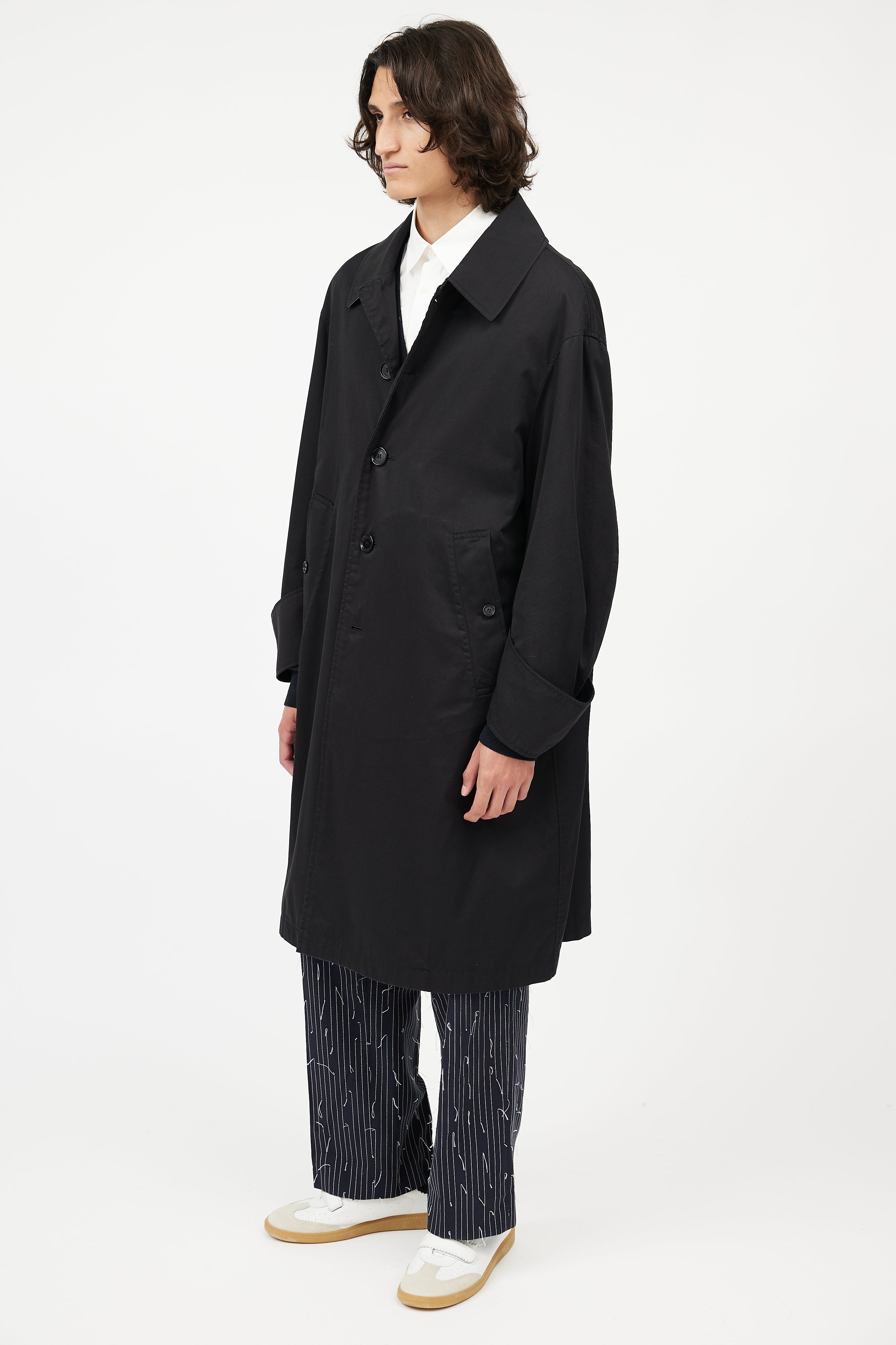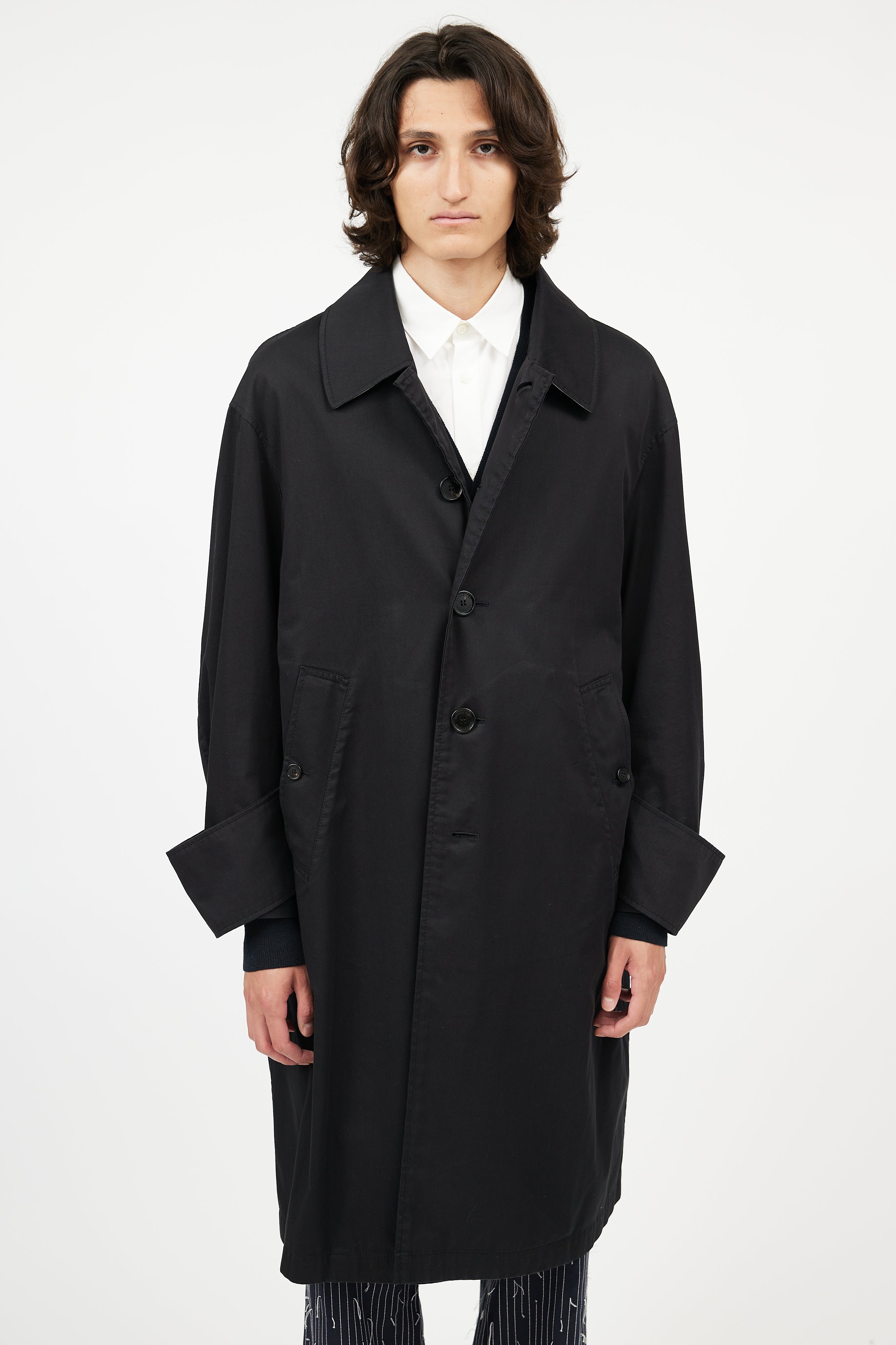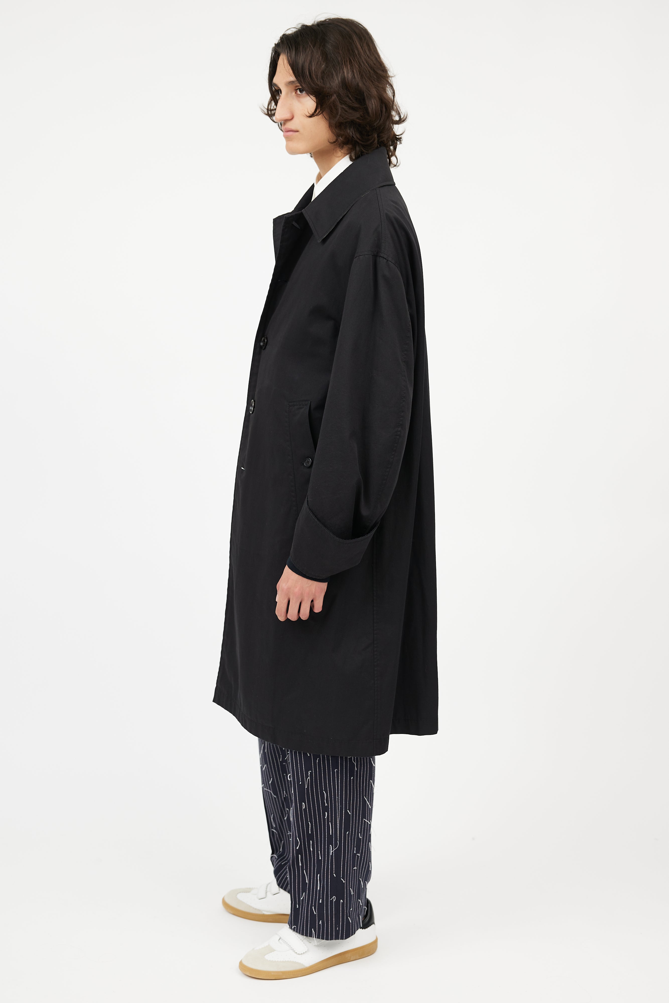 Pre-owned Burberry XO Barneys black trench coat featuring oversized collar with pastel signature Check lining, button up front, two buttoned pockets at hips, back flap with button fastening, and detachable oversized cuffs.