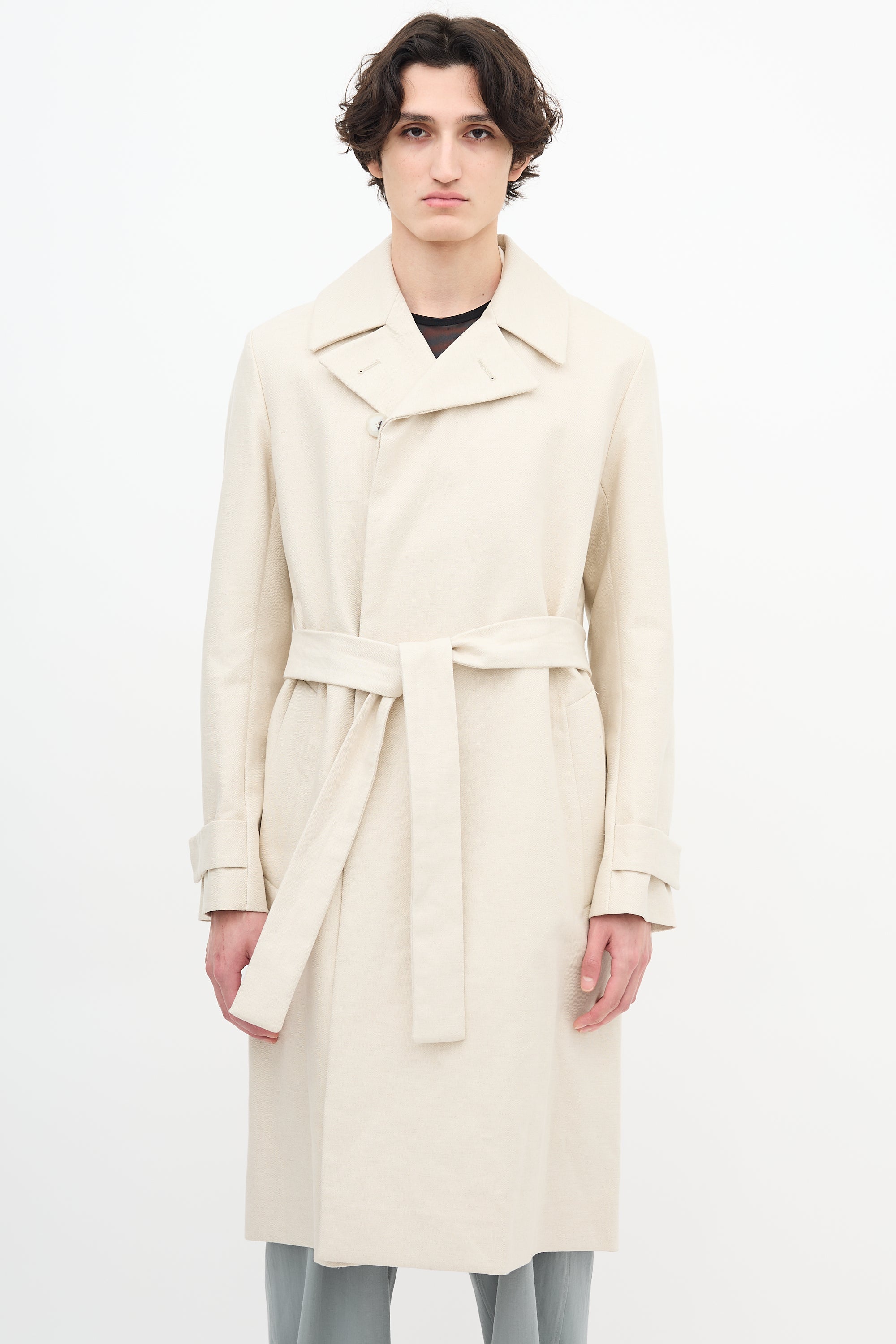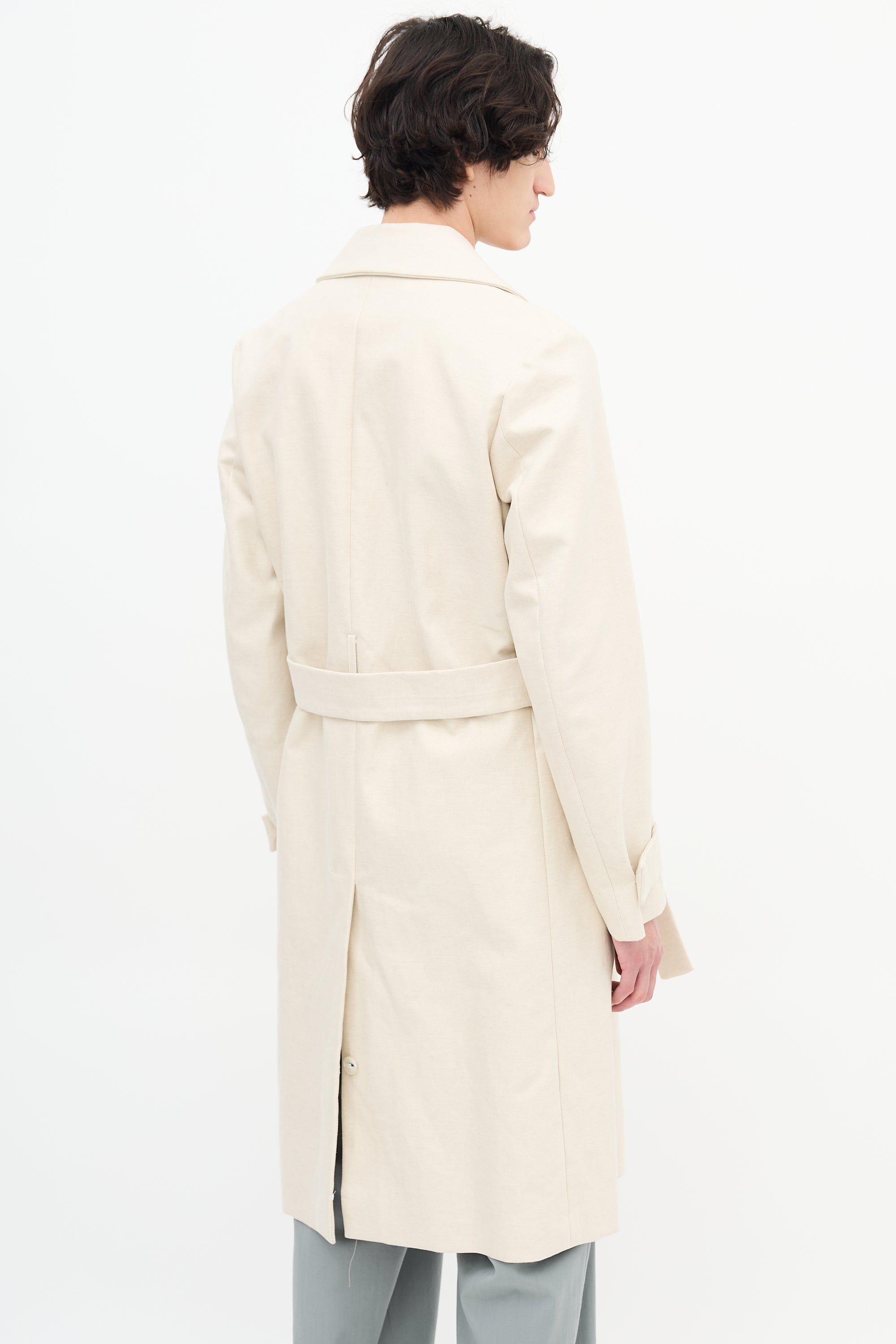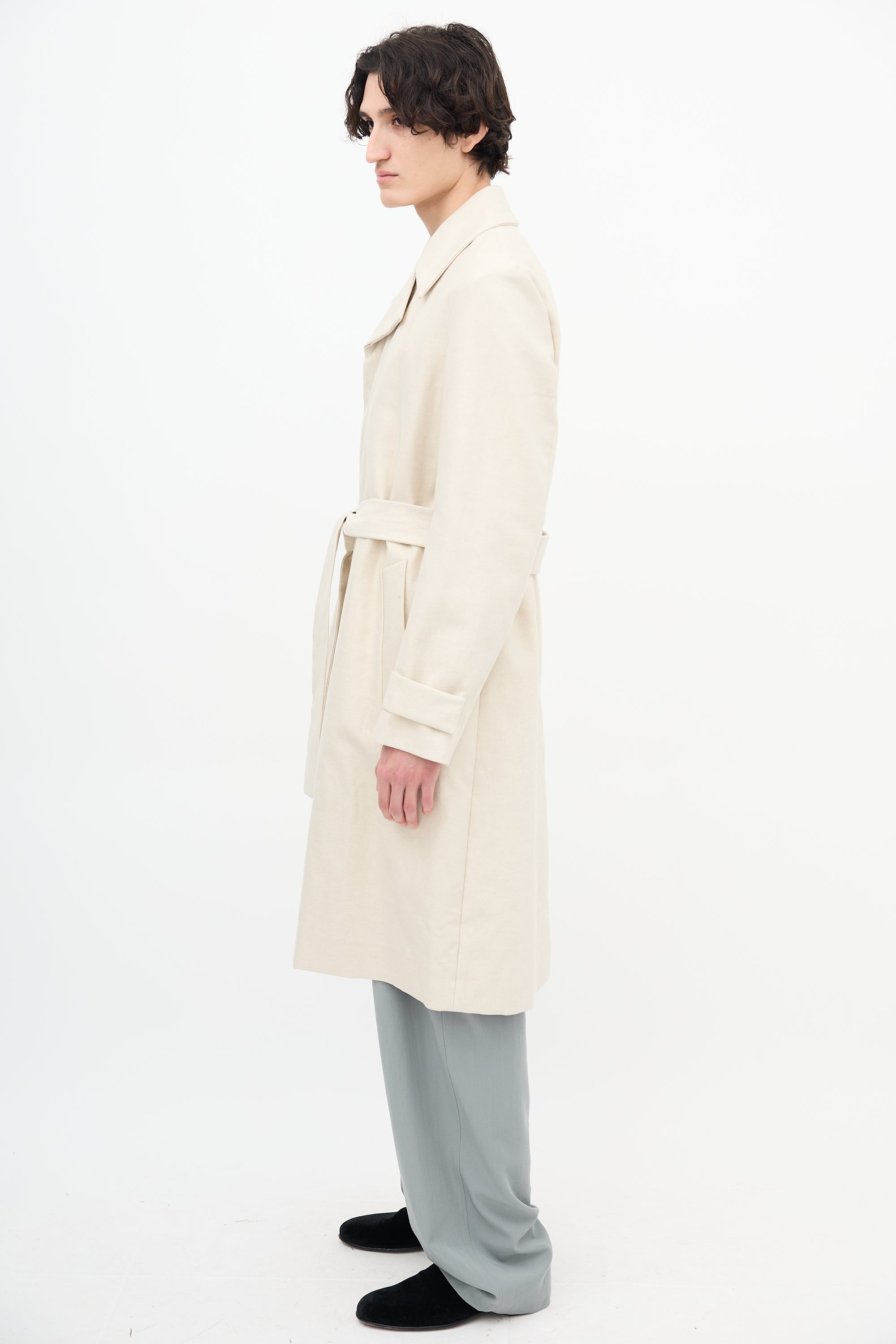 Pre-owned COS beige linen trench coat featuring peak lapel, concealed double breasted button up front, tie waist, two slash pockets at hips, buttoned cuffs, and back vent.