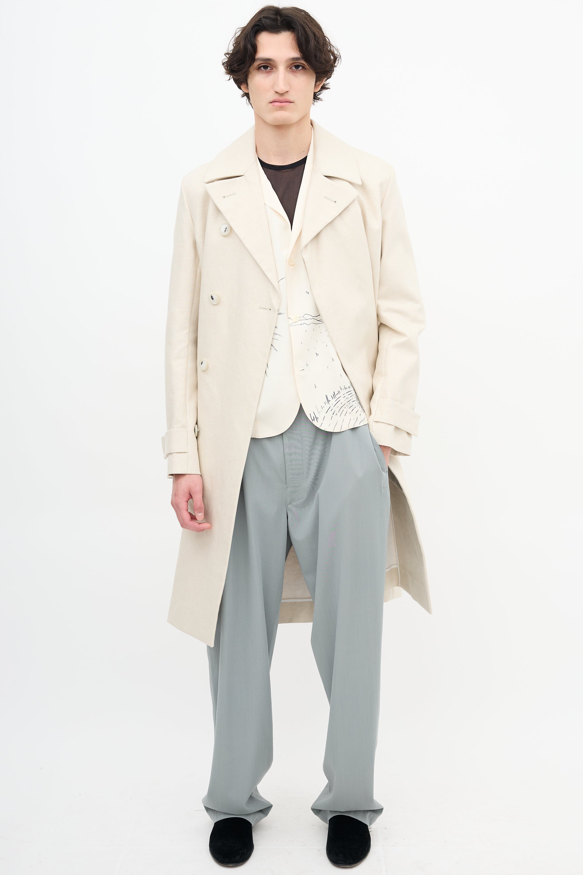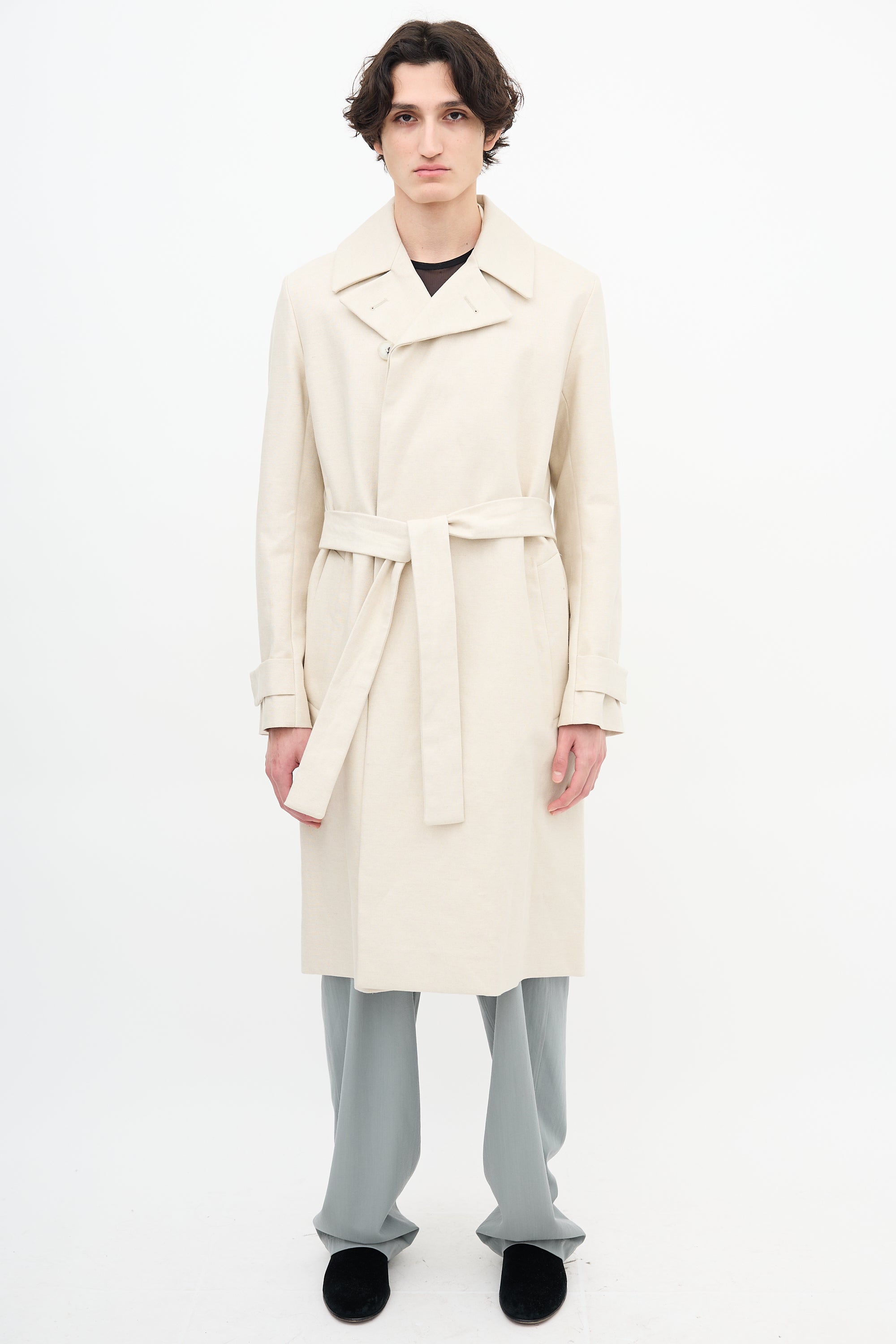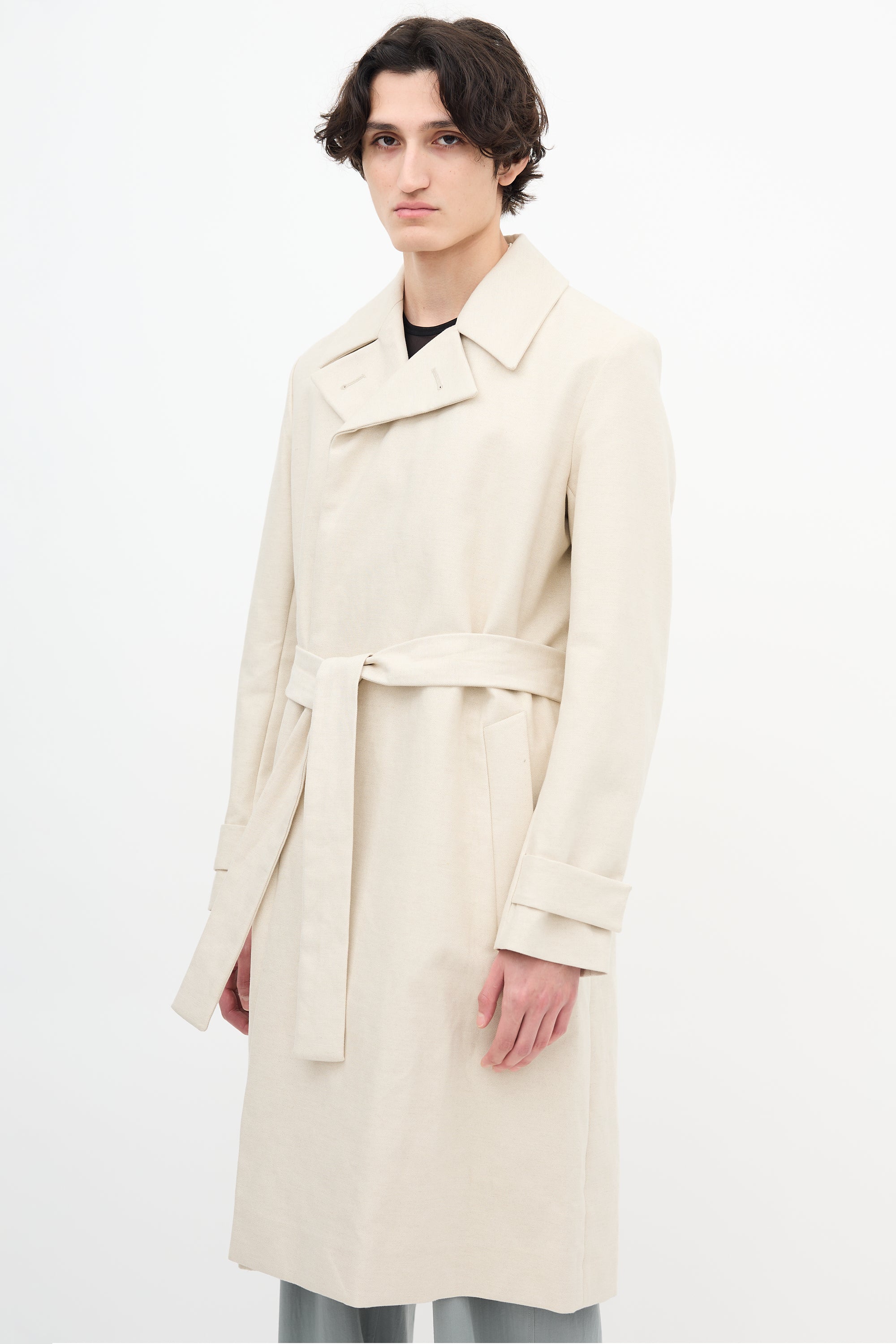 Pre-owned COS beige linen trench coat featuring peak lapel, concealed double breasted button up front, tie waist, two slash pockets at hips, buttoned cuffs, and back vent.