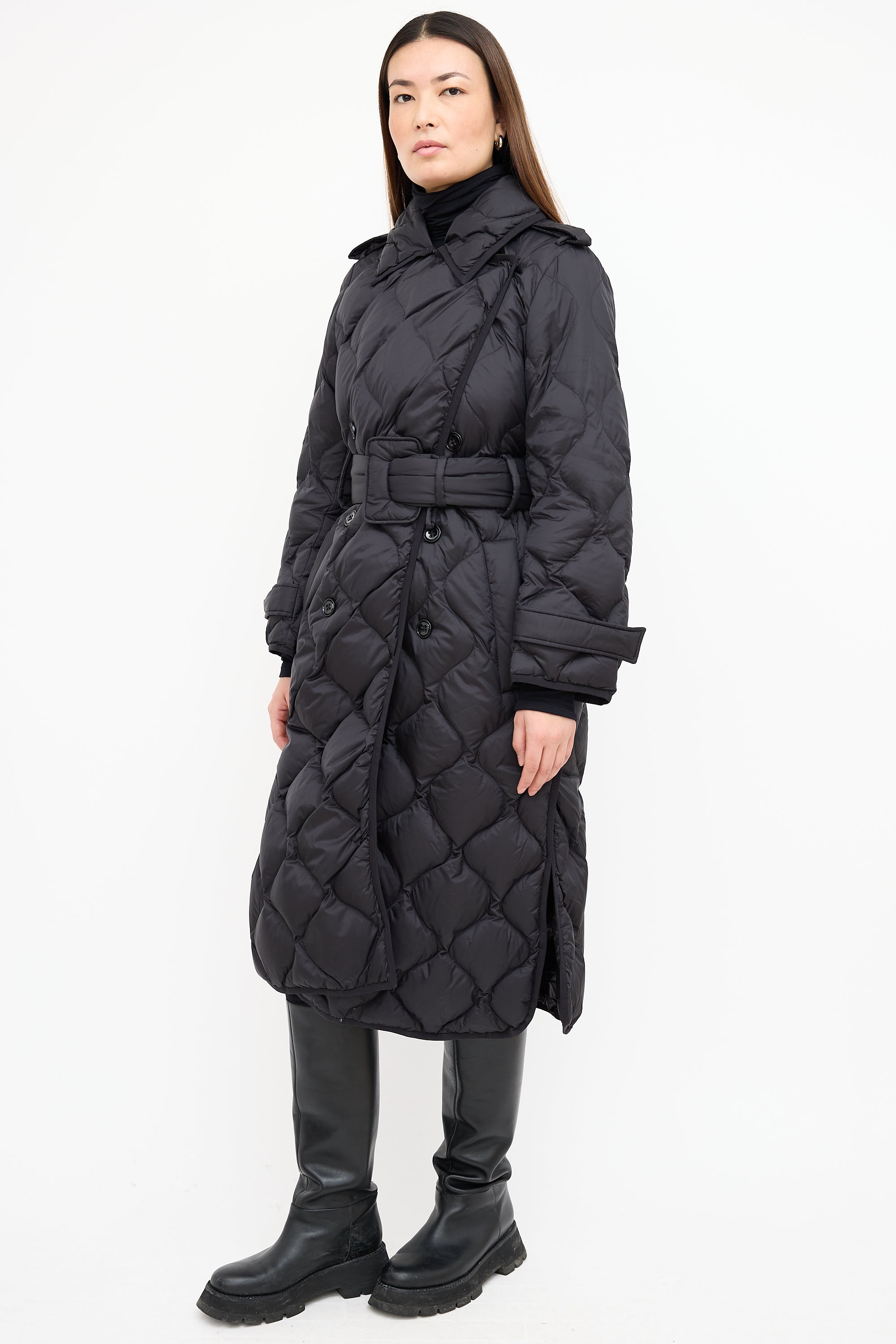 Pre-owned Dorothee Schumacher black quilted nylon trench coat featuring wide collar and lapel, decorative double breasted button front, two front pockets, side vents, waist belt, epaulettes, and cuff straps. Lined.
