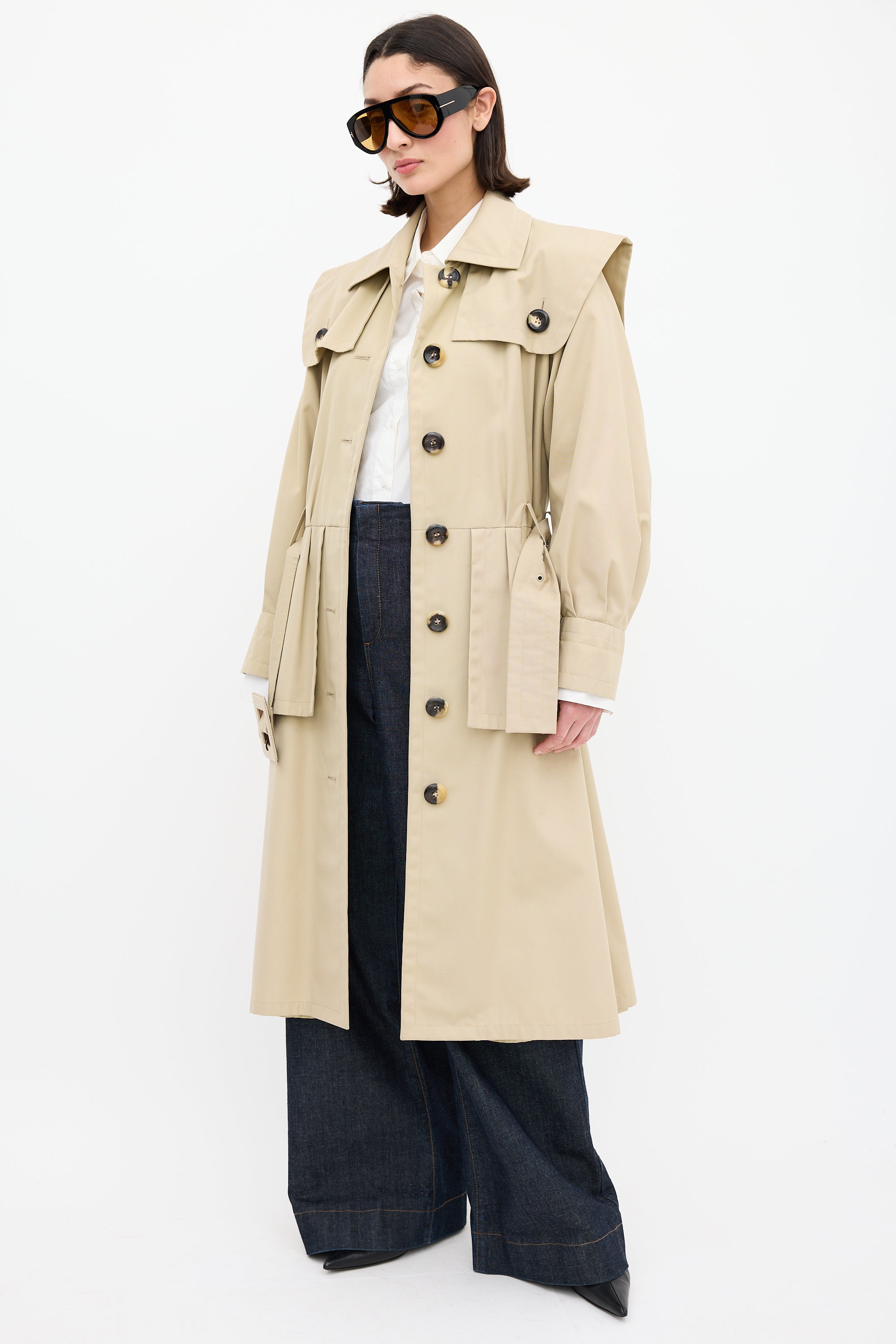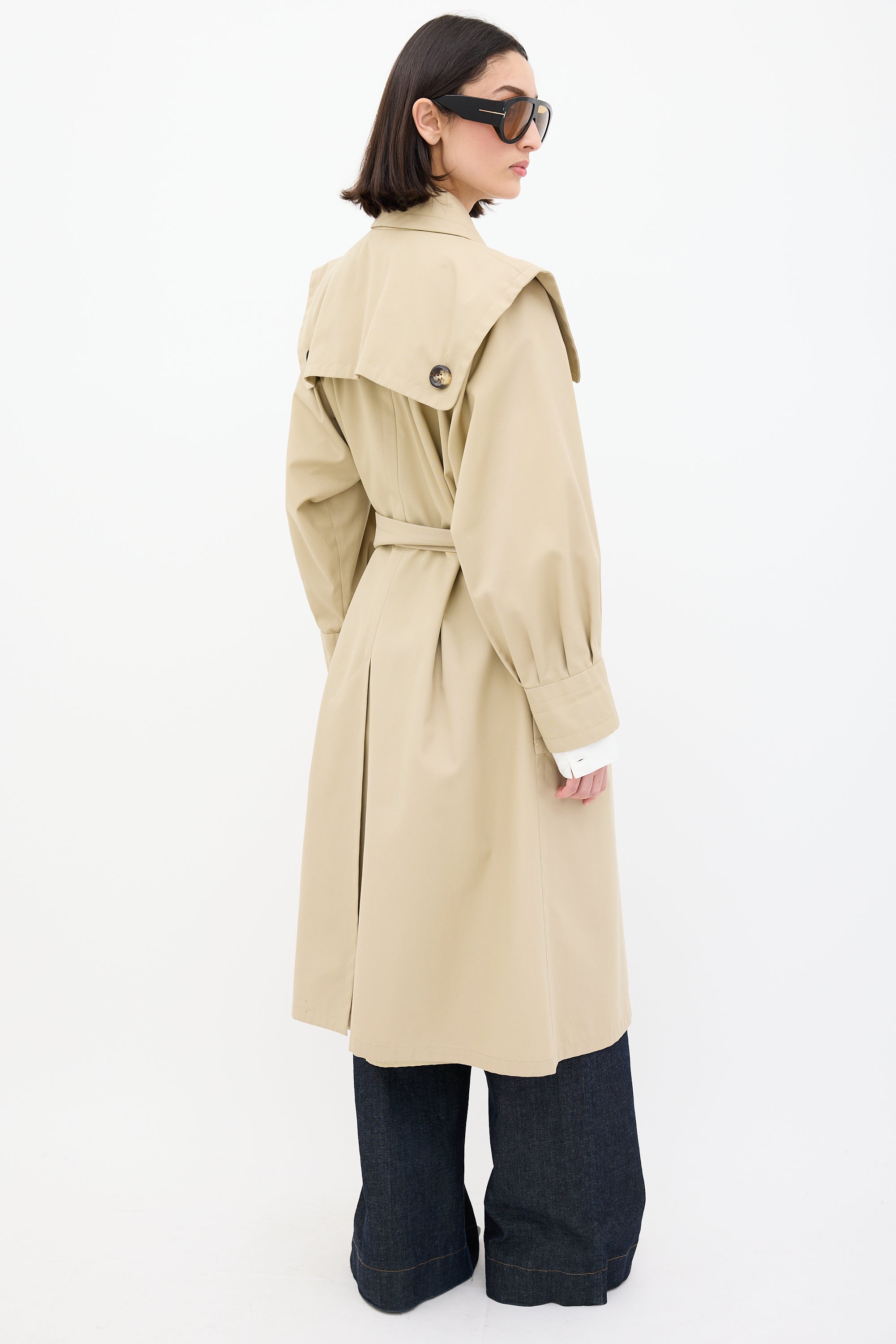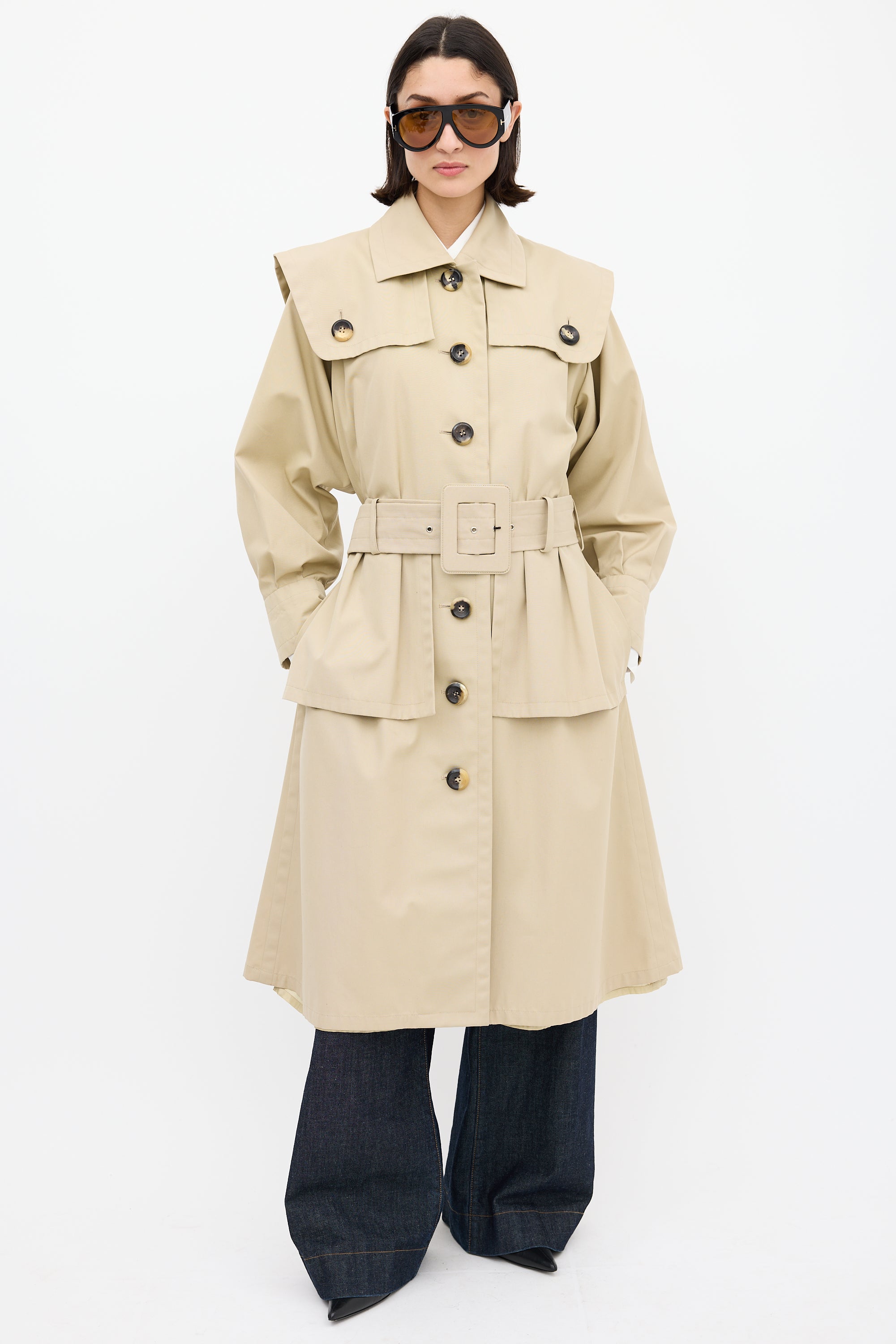 Pre-owned Saint Laurent vintage beige trench coat featuring a spread collar, button up front closure, buttoned storm flaps and shield, front peplum, in seam pockets, back vent, pleated cuffs, and belt with large square buckle at waist. Lined. c. 1970s.