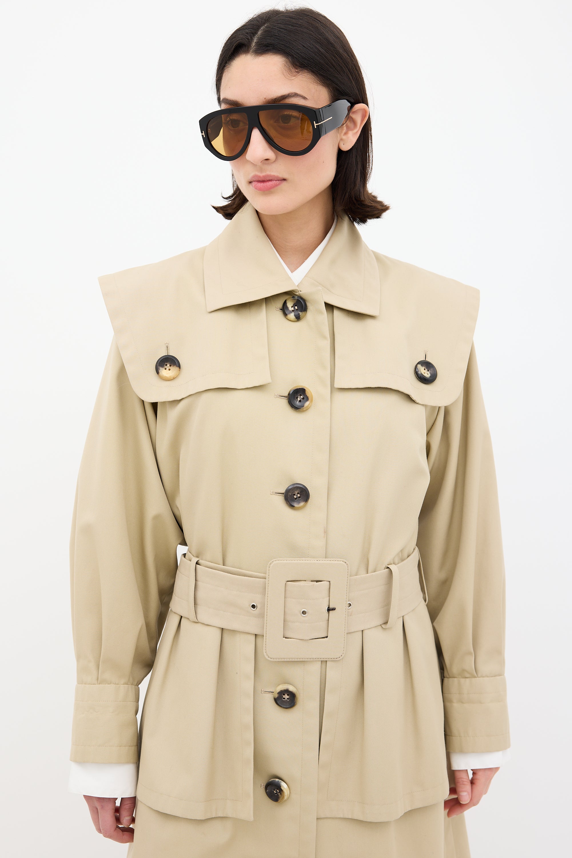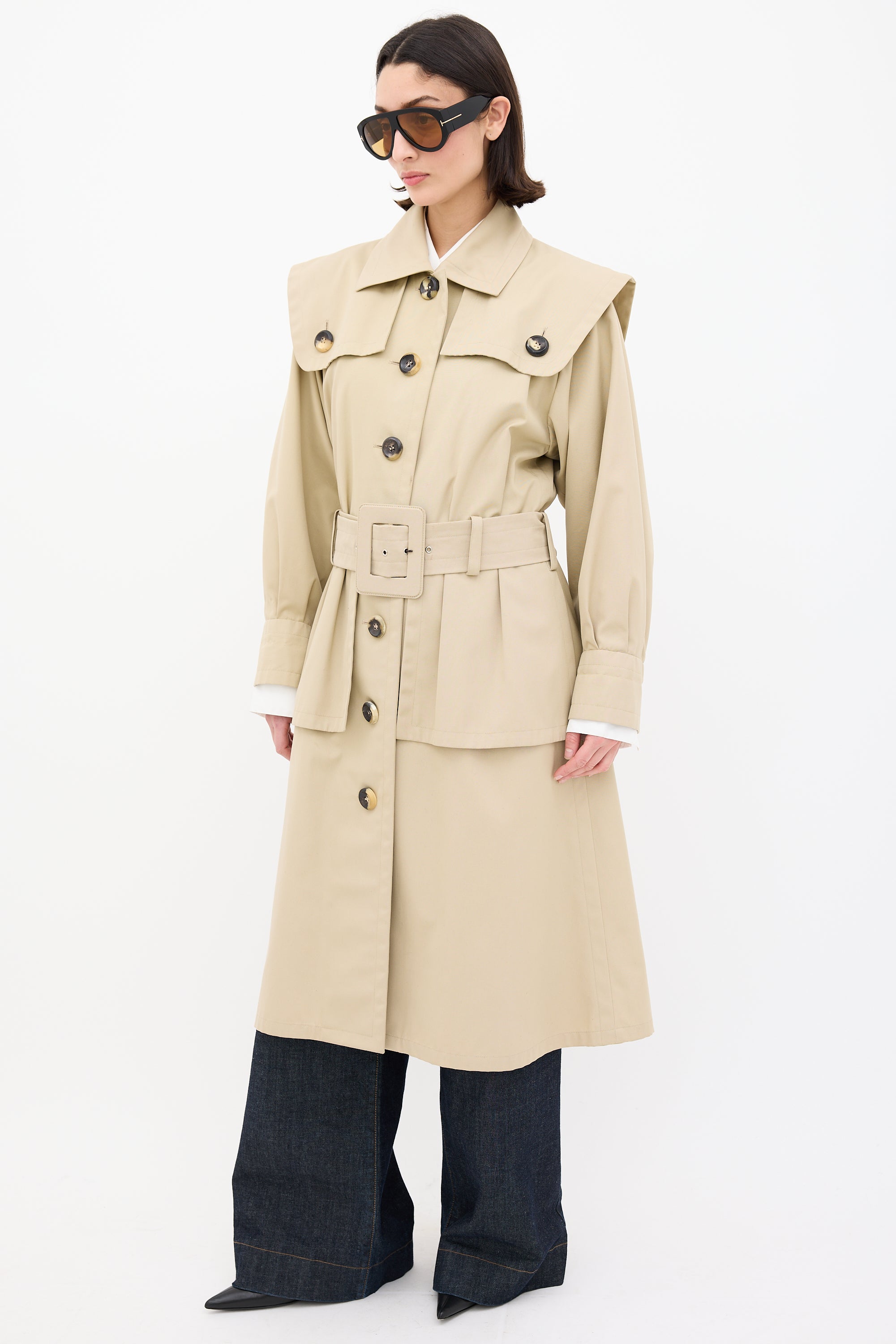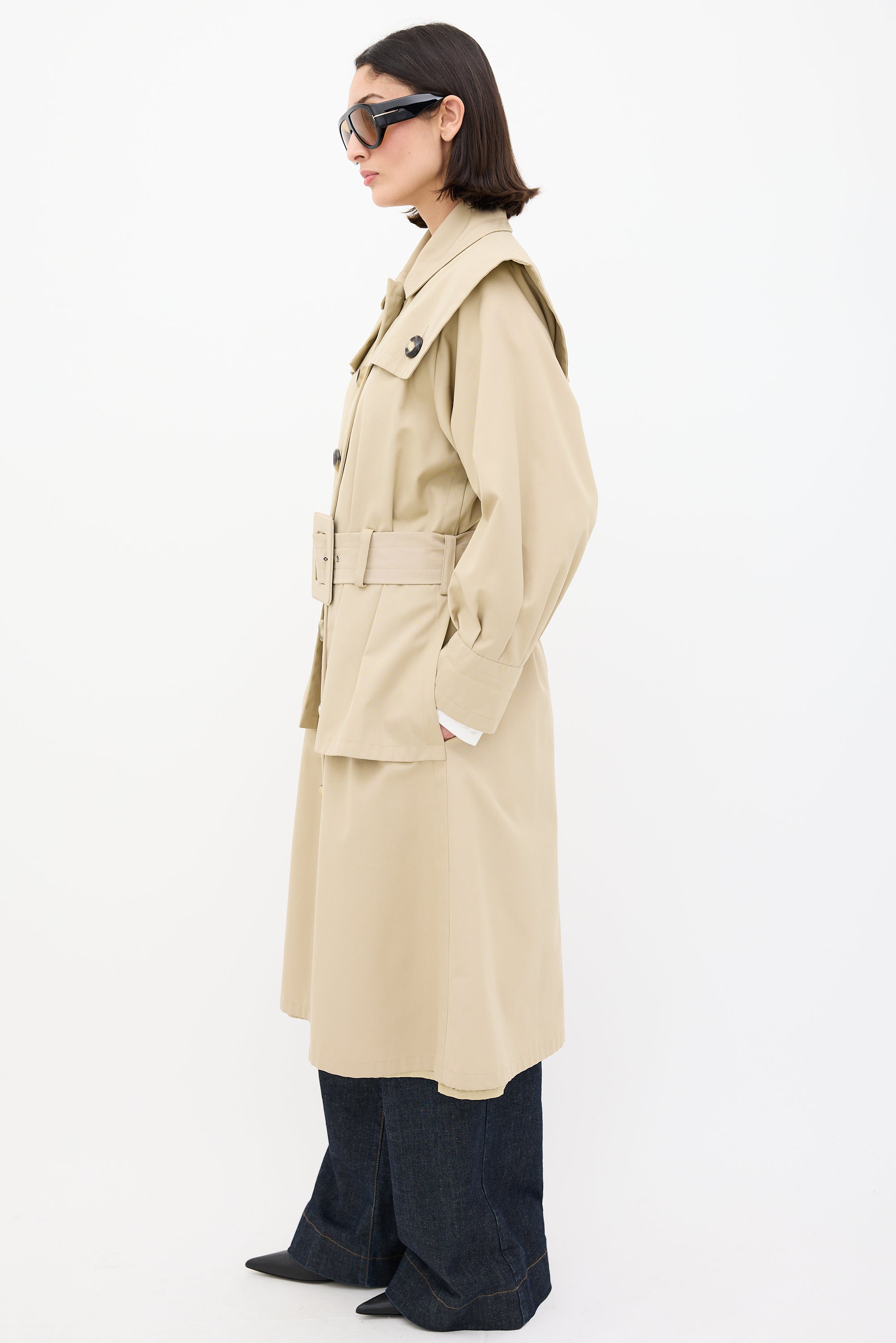 Pre-owned Saint Laurent vintage beige trench coat featuring a spread collar, button up front closure, buttoned storm flaps and shield, front peplum, in seam pockets, back vent, pleated cuffs, and belt with large square buckle at waist. Lined. c. 1970s.