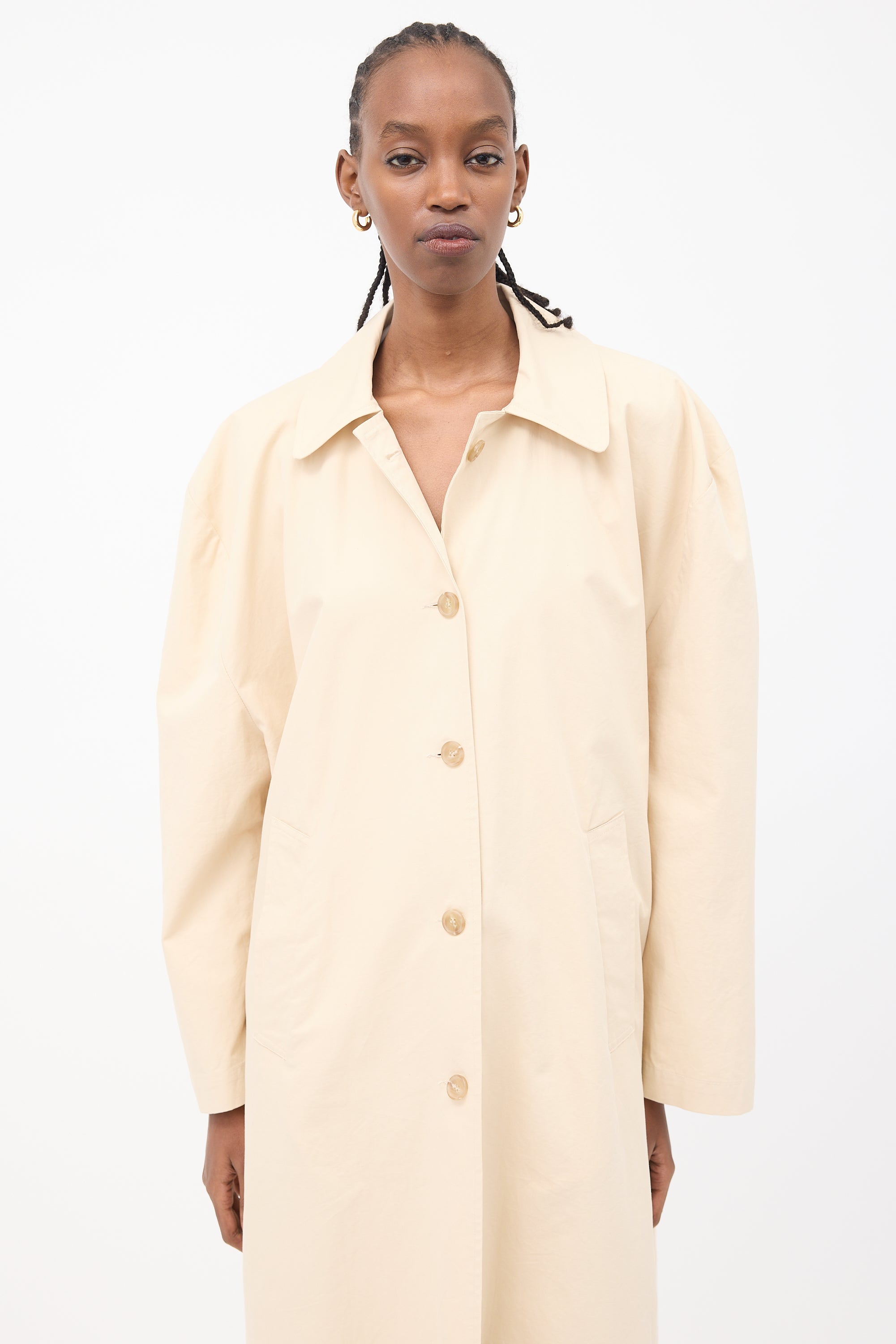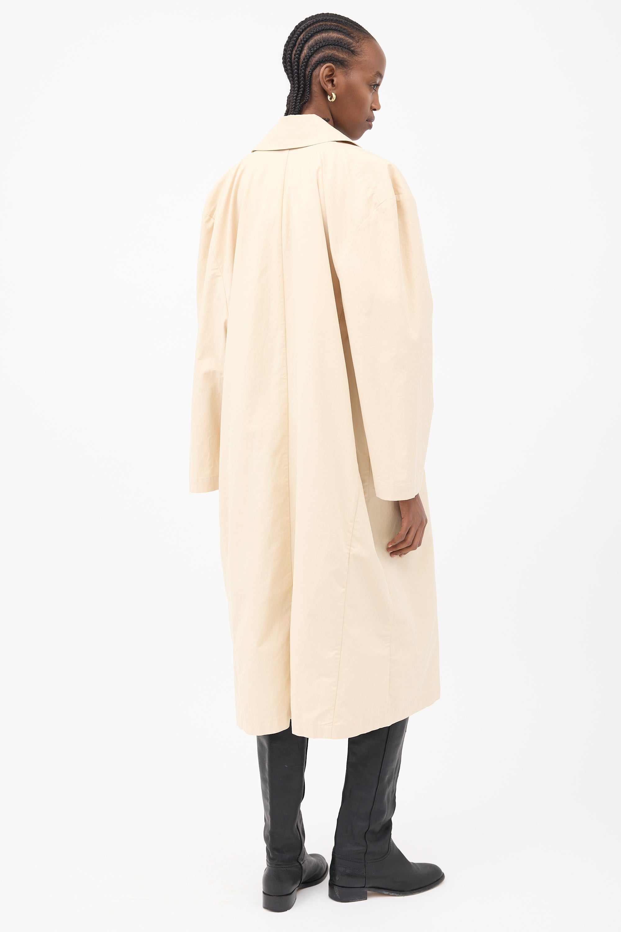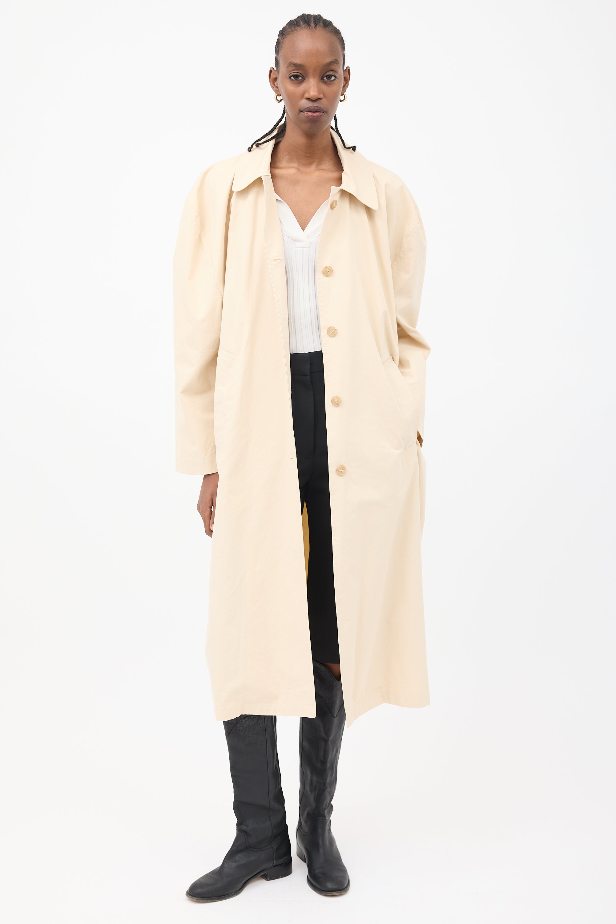 Pre-owned The Frankie Shop beige oversized trench coat featuring button up front, structured shoulders, oversized collar, and two welt pockets at hips. Unlined.