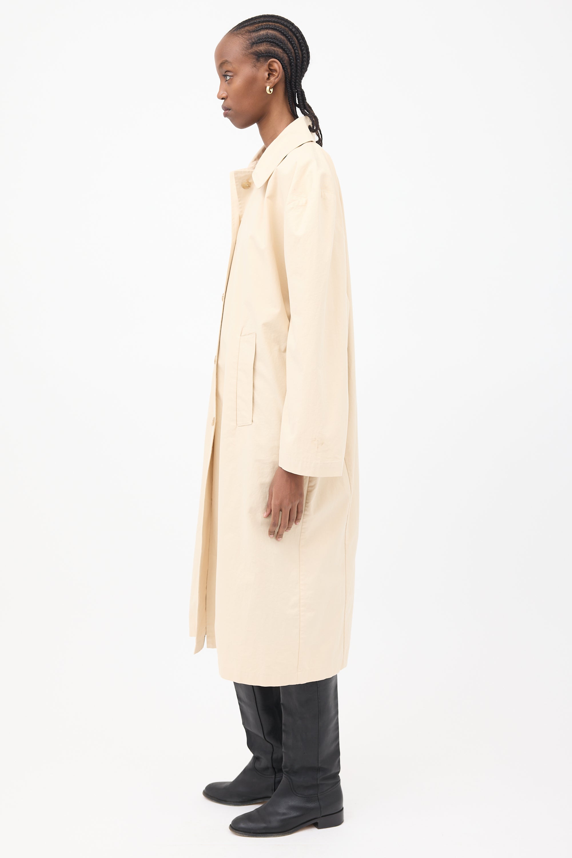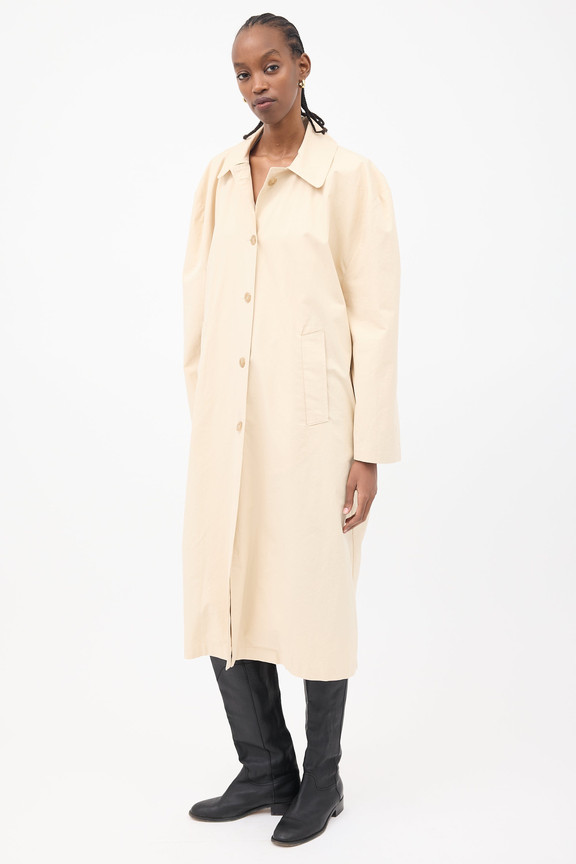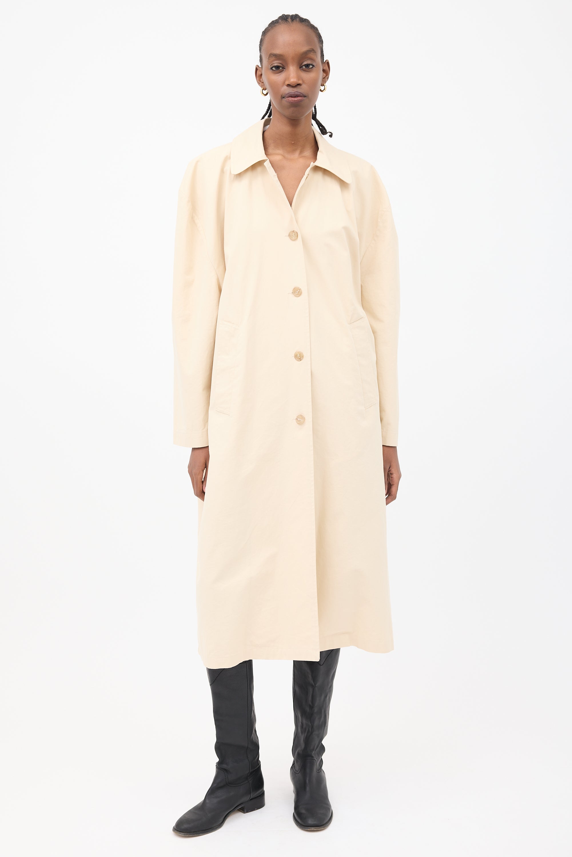 Pre-owned The Frankie Shop beige oversized trench coat featuring button up front, structured shoulders, oversized collar, and two welt pockets at hips. Unlined.