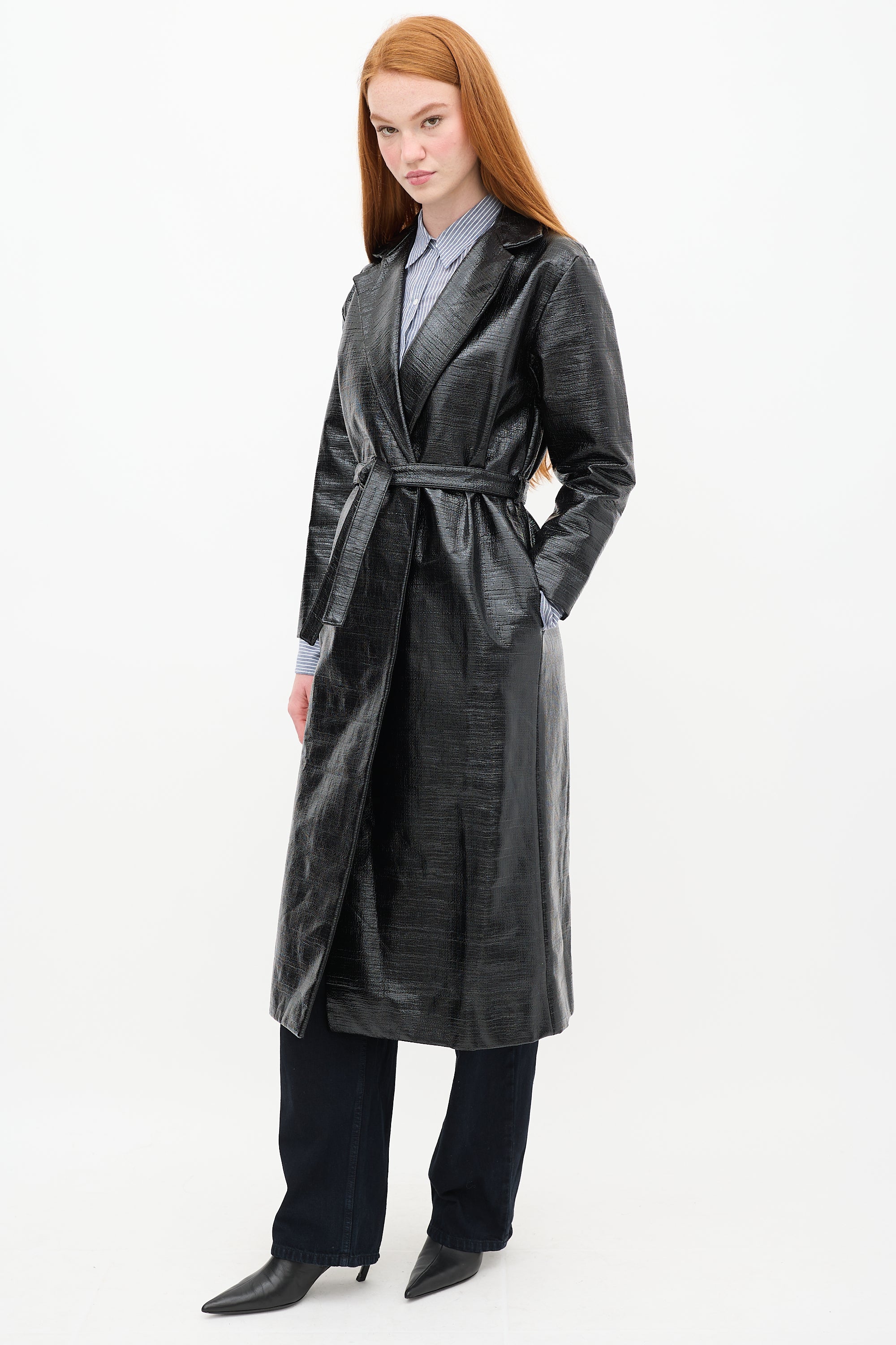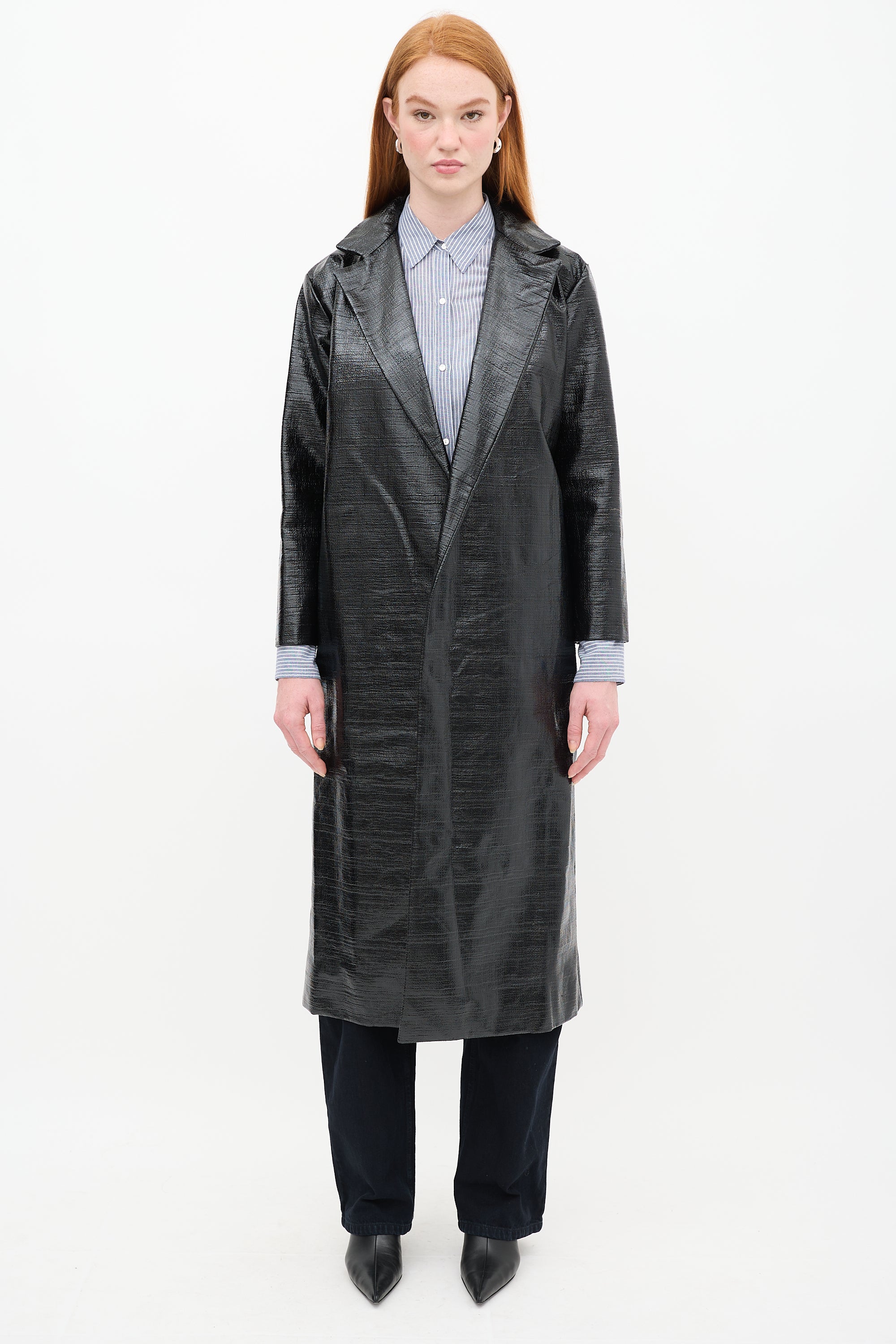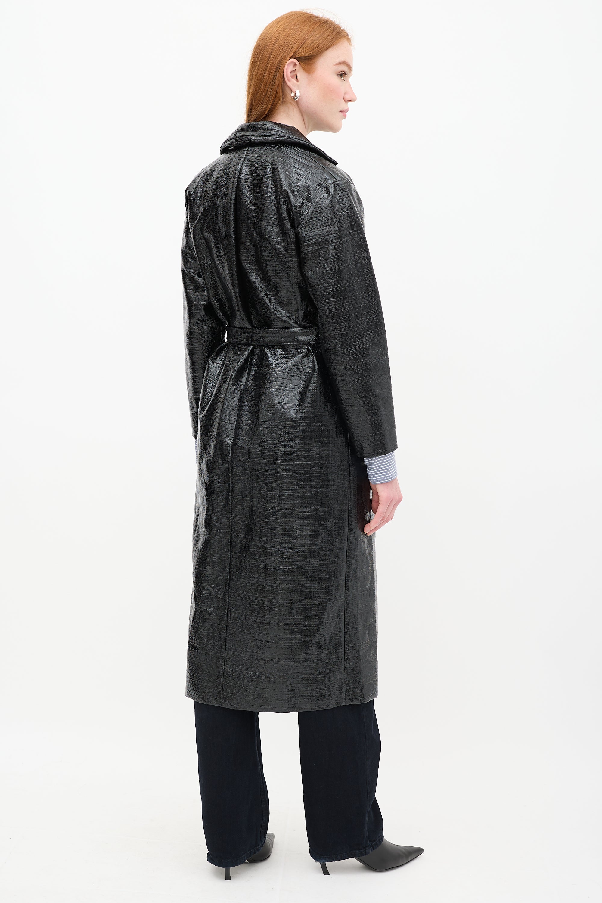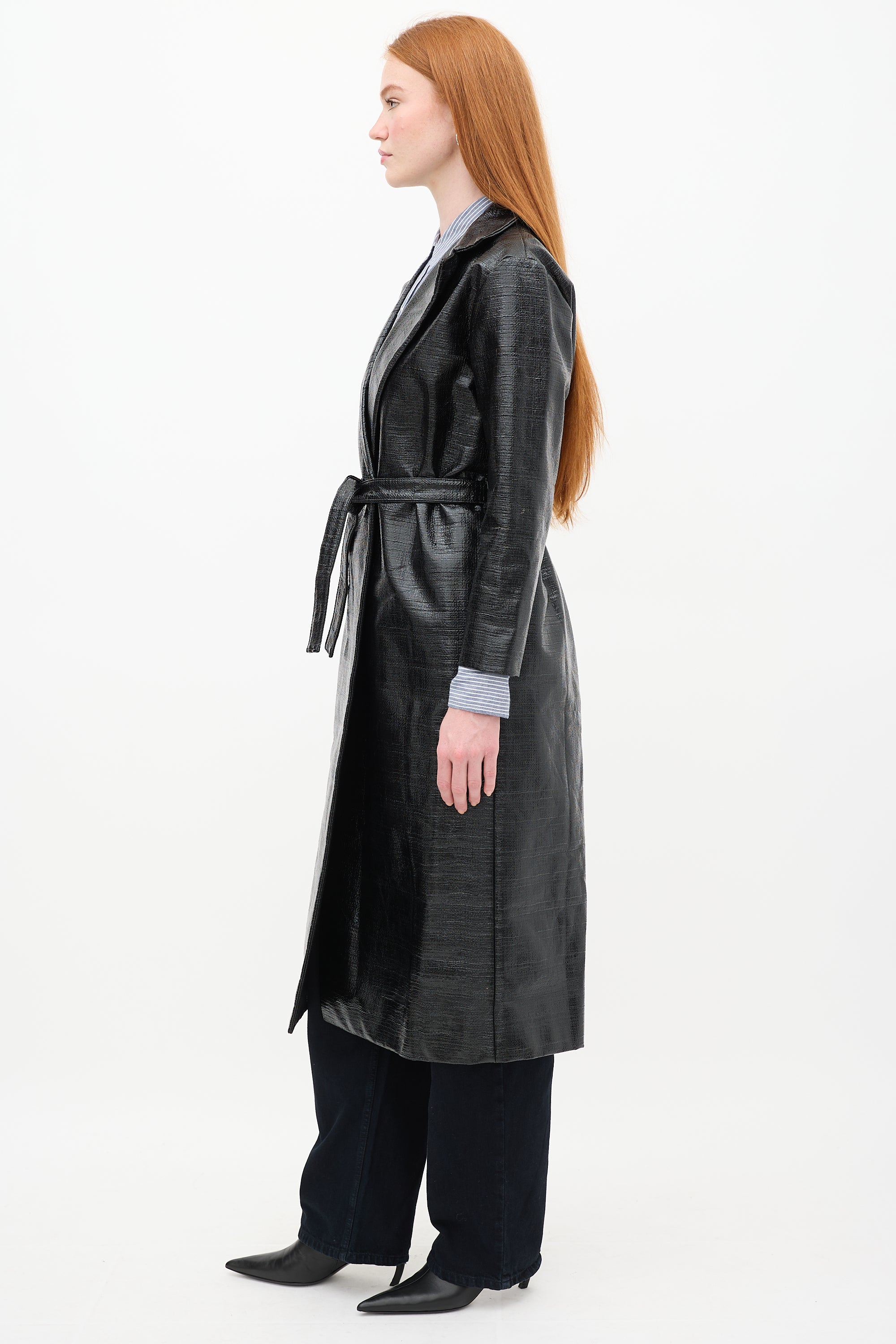 Pre-owned Toteme black Mira Lacquered trench coat featuring a notched lapel, long sleeves, two slip pockets at hip, open front, and adjustable belt at waist. Lined.