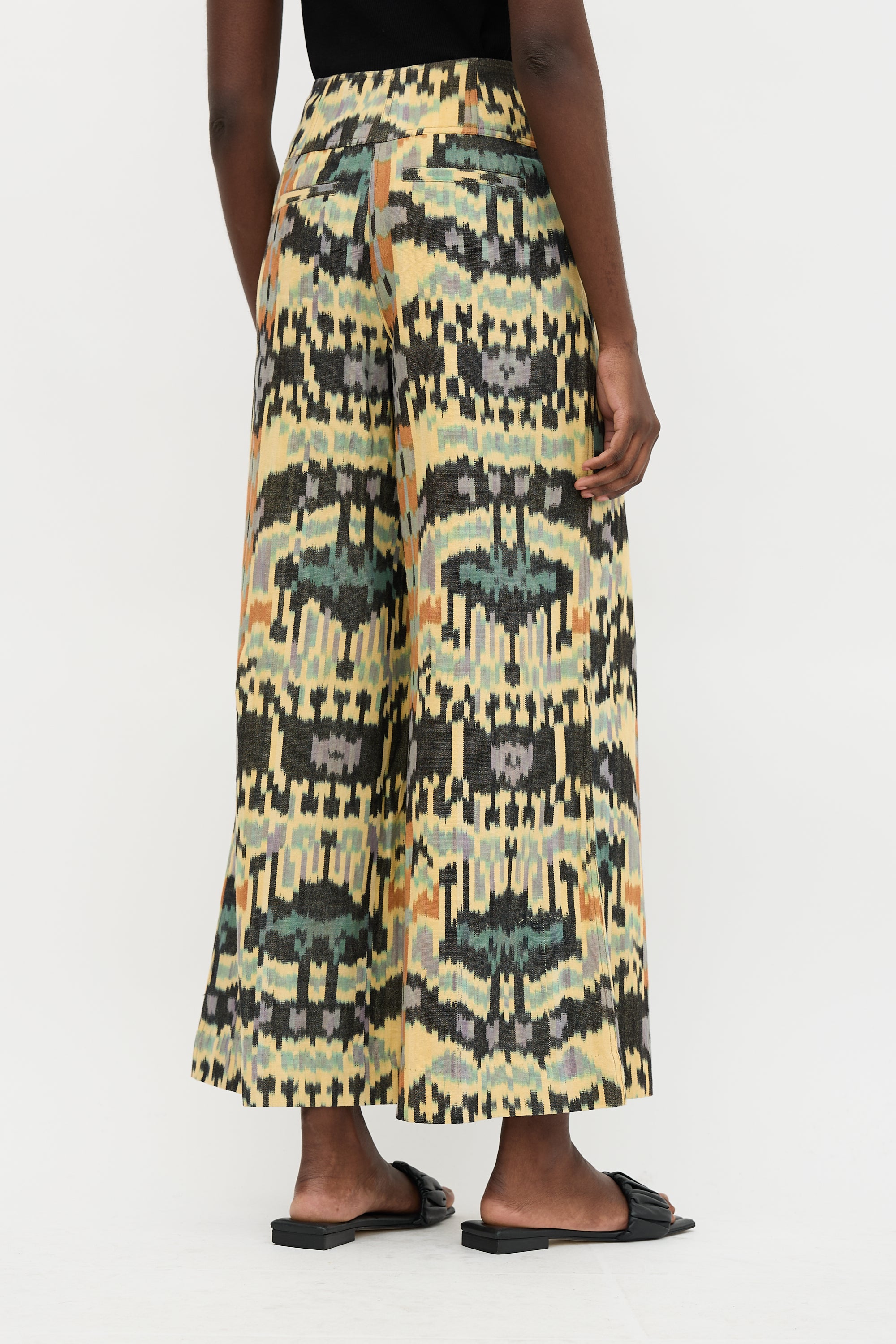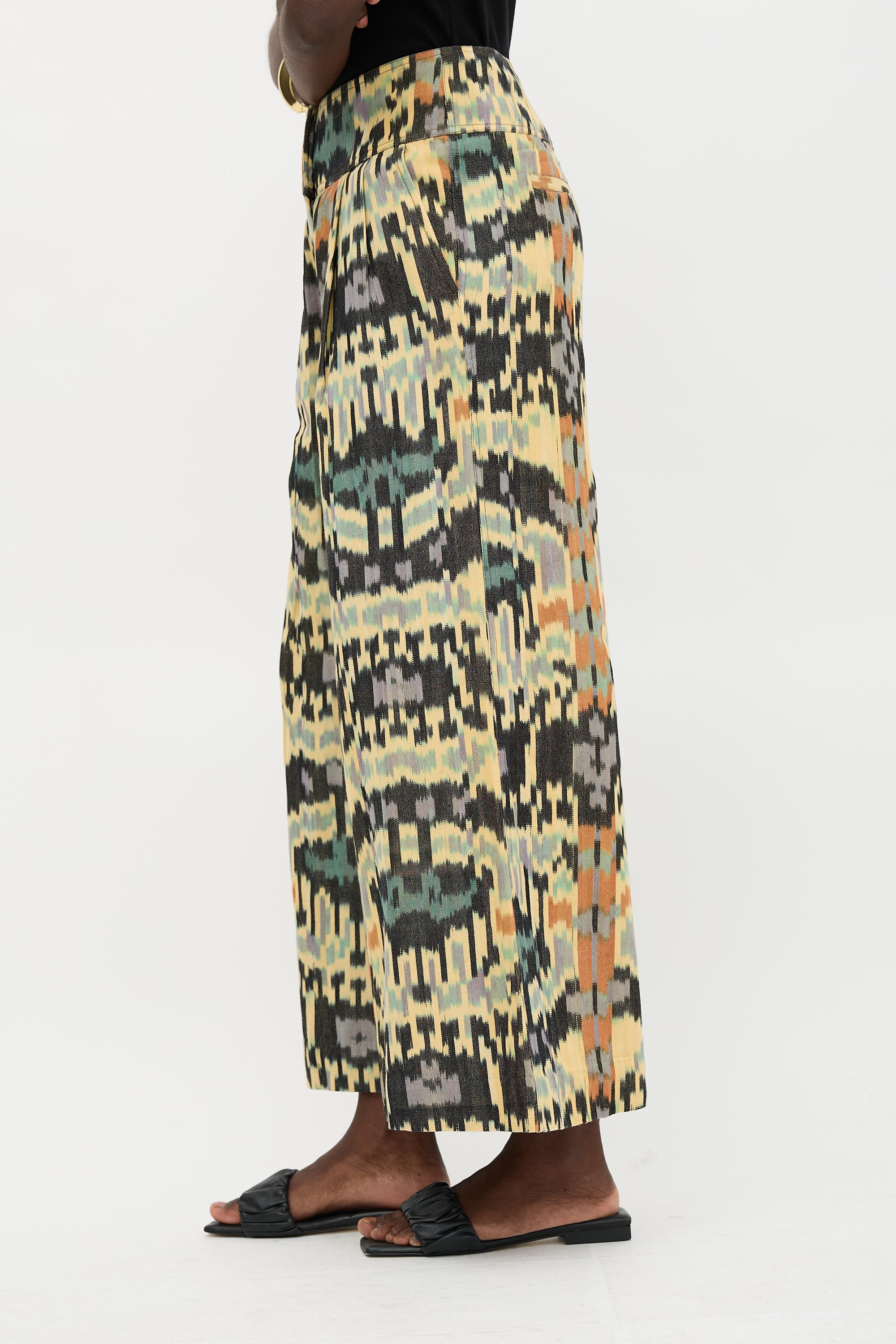 Ulla Johnson yellow and multicolour handmade Indira pant featuring an abstract print, zip fly with hook closure at waist, pleated front, four pocket styling, and a wide leg.
