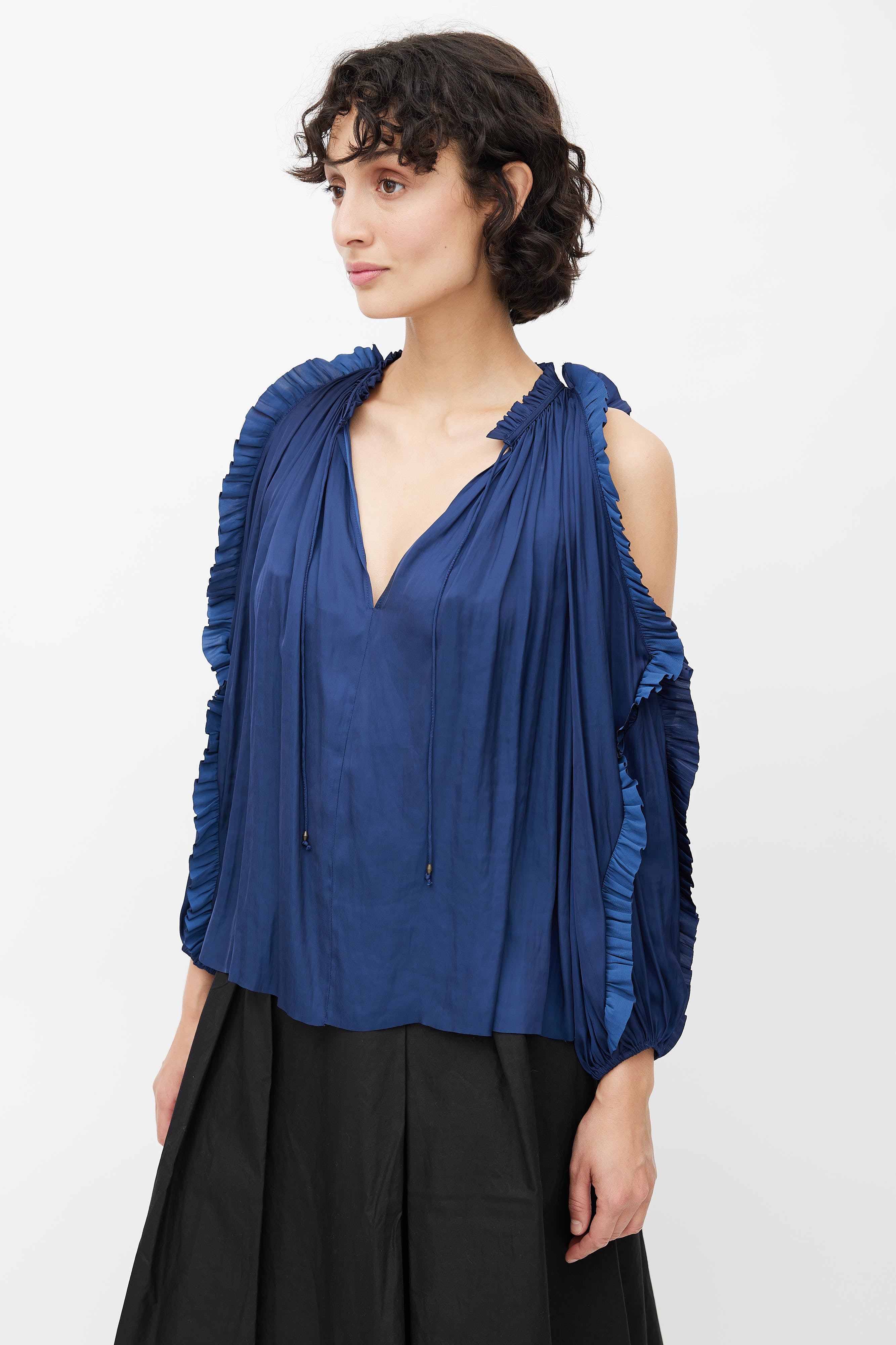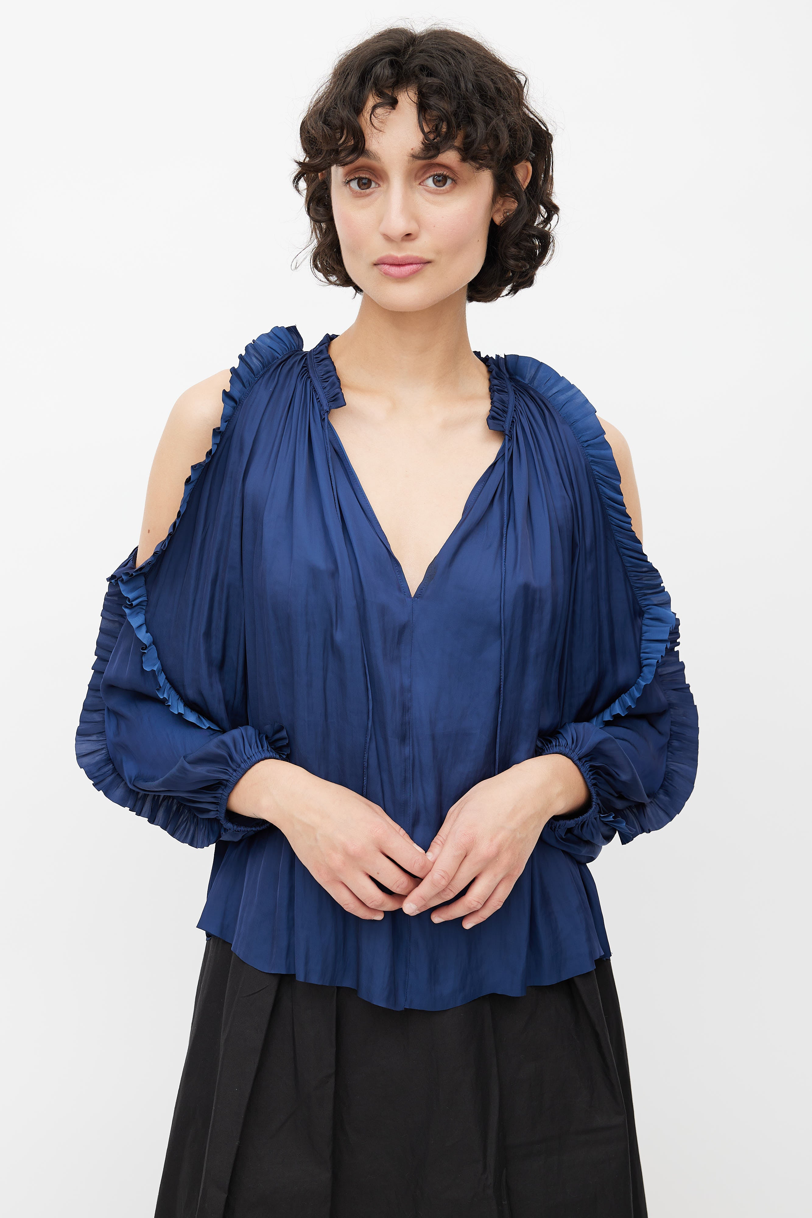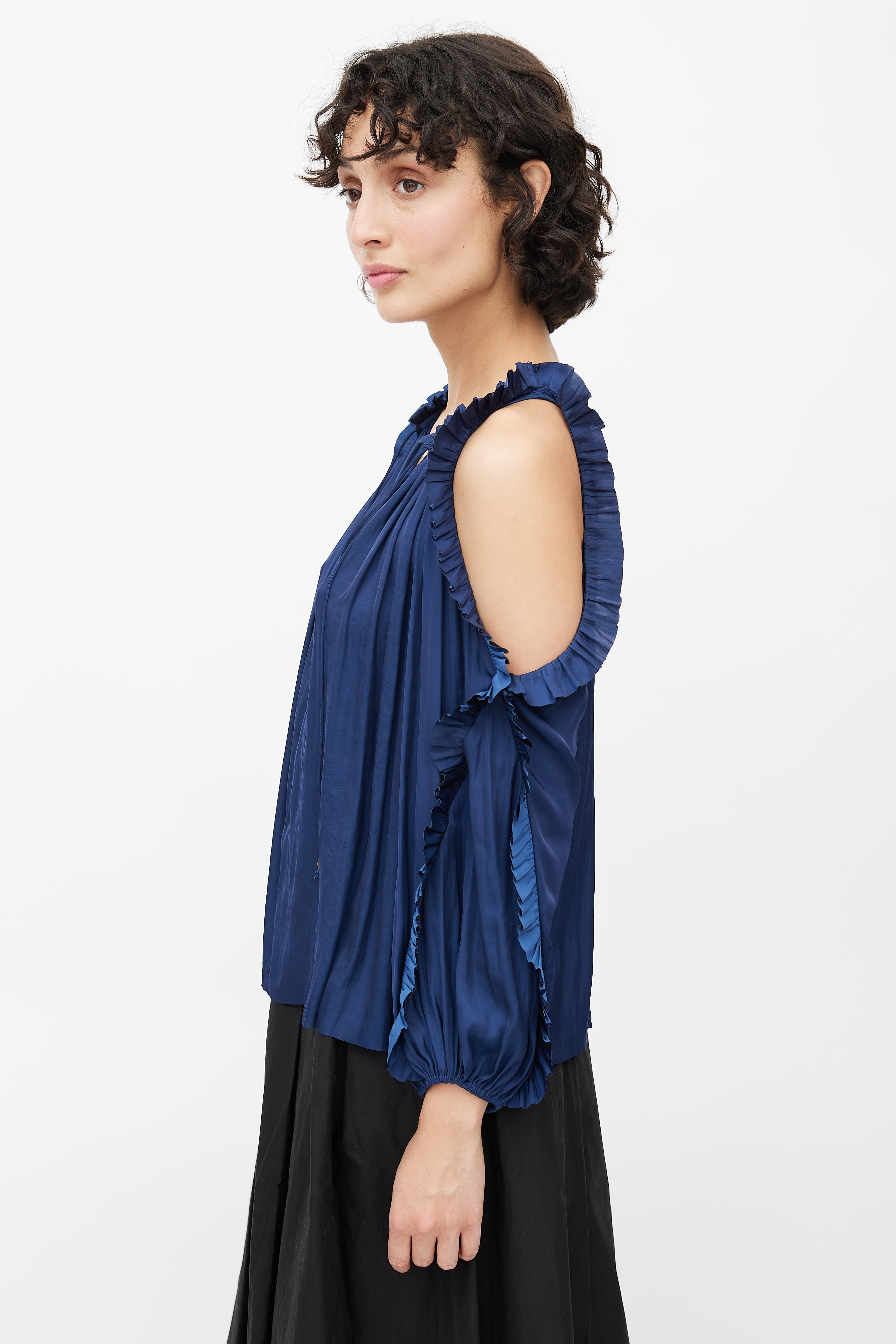 Pre-owned Ulla Johnson navy blue ruffled cold shoulder blouse featuring a keyhole neckline with self tie bow, ruffled neckline and sleeves, cold shoulder cut outs and a slight A-line bodice. Unlined.