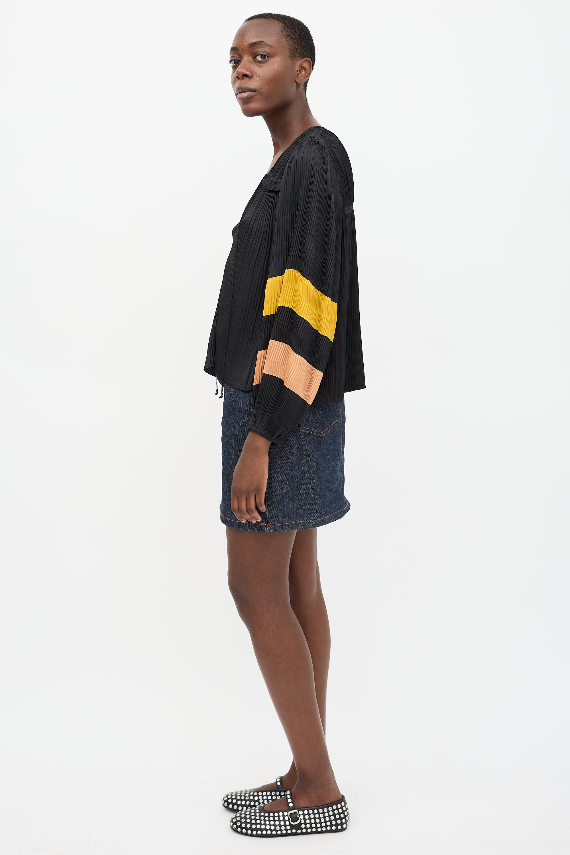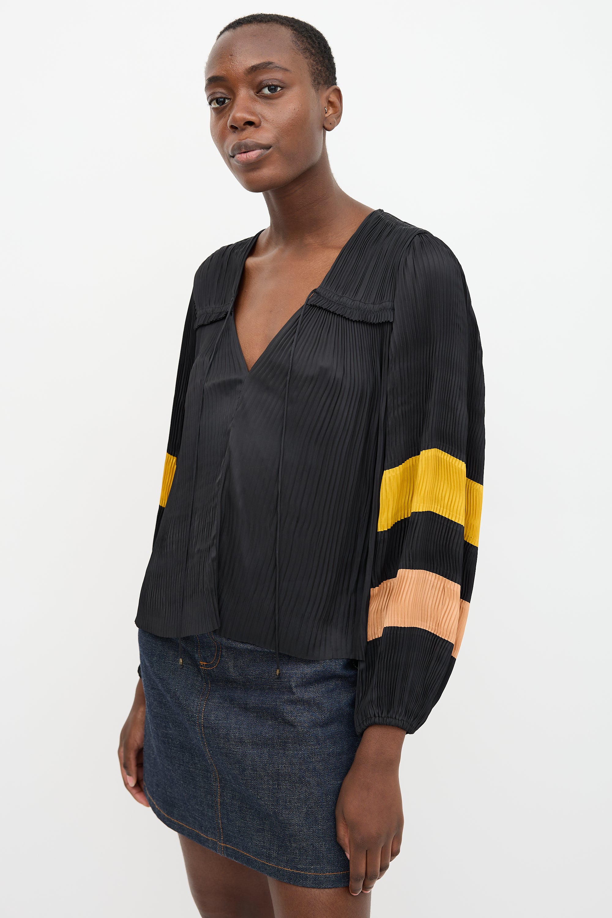 Pre-owned Ulla Johnson black and yellow Tania blouse featuring V-neck with tie, ruffle trim at front yoke, striped bishop sleeves with elastic cuffs, and pleats throughout.