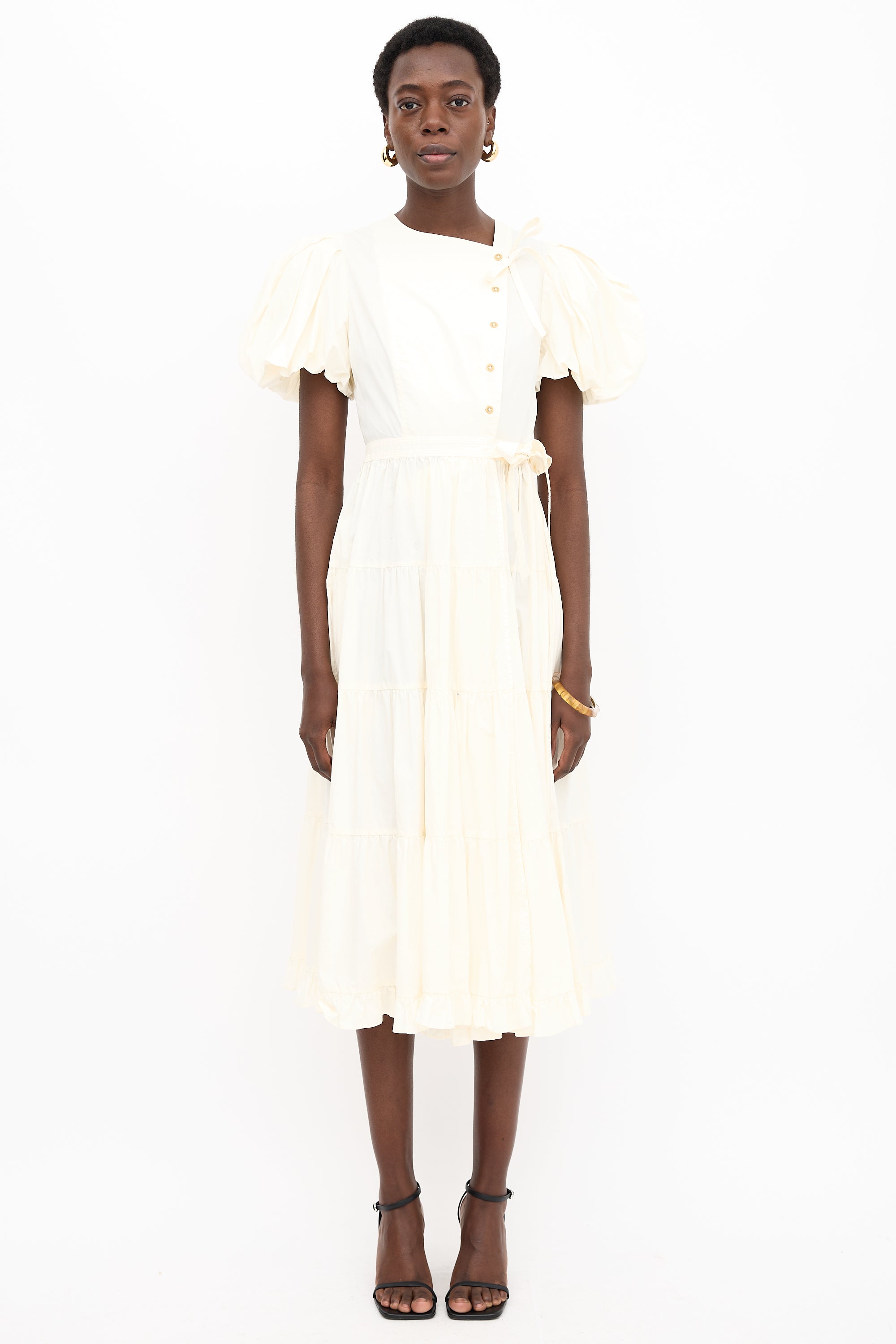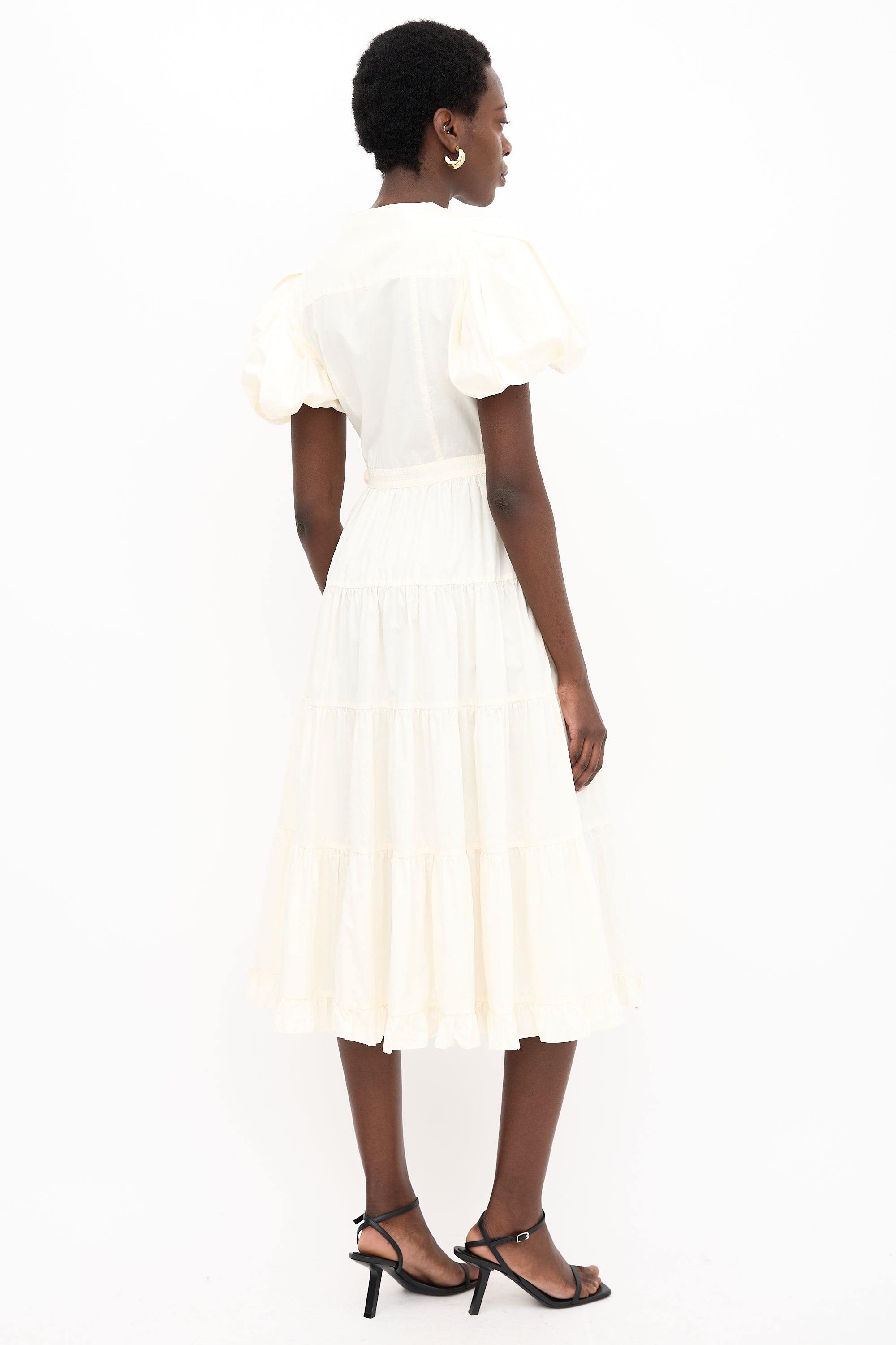 Pre-owned Ulla Johnson cream poplin Agathe midi dress featuring round neckline, off centre button up front top, tie closure, in seam pockets, tier skirt, frill hem, and puff sleeves.
