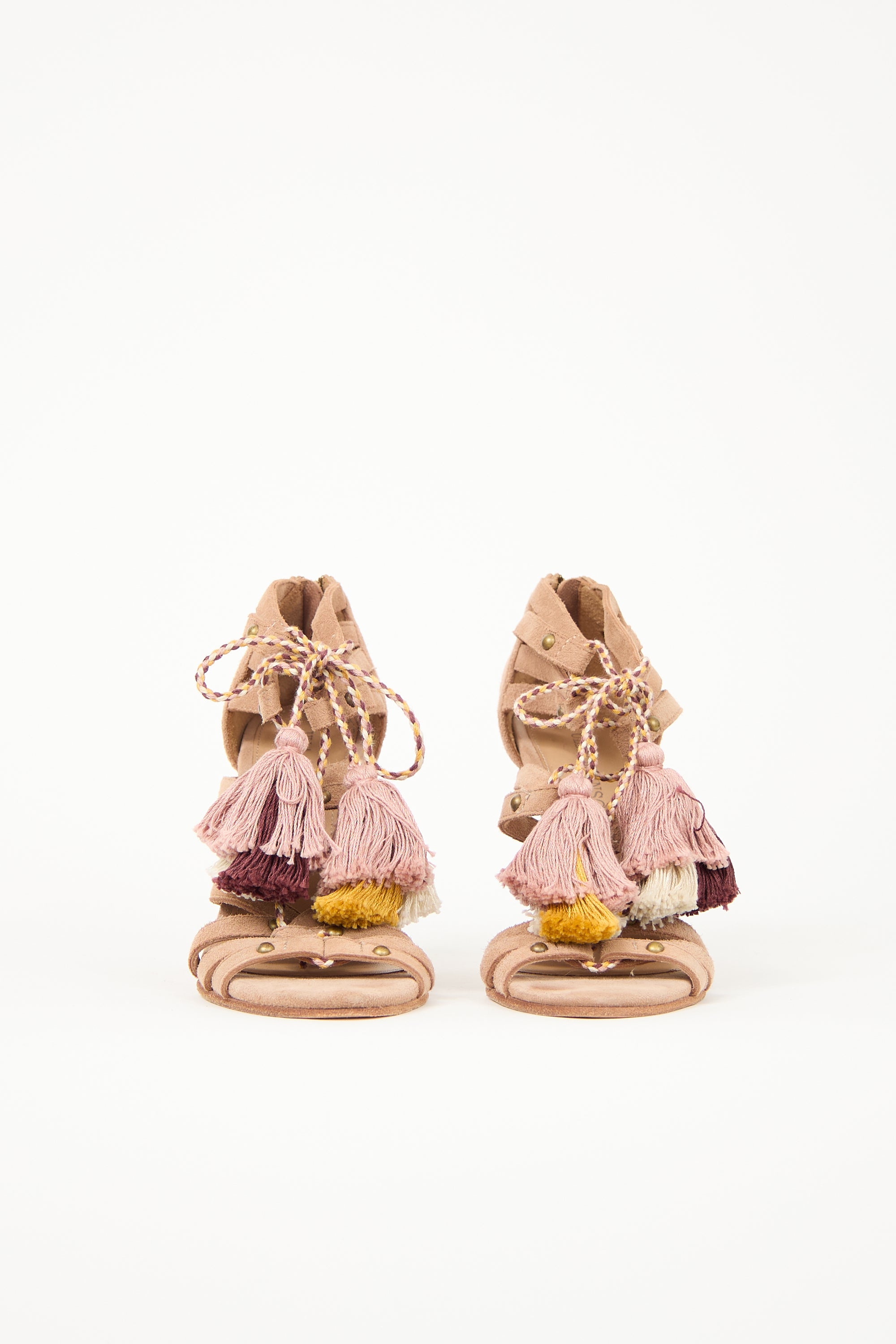 Pre-owned Ulla Johnson brown suede tassel heels featuring open almond toe, strappy upper, lace up front with tassels, concealed back zip, and stiletto heel.