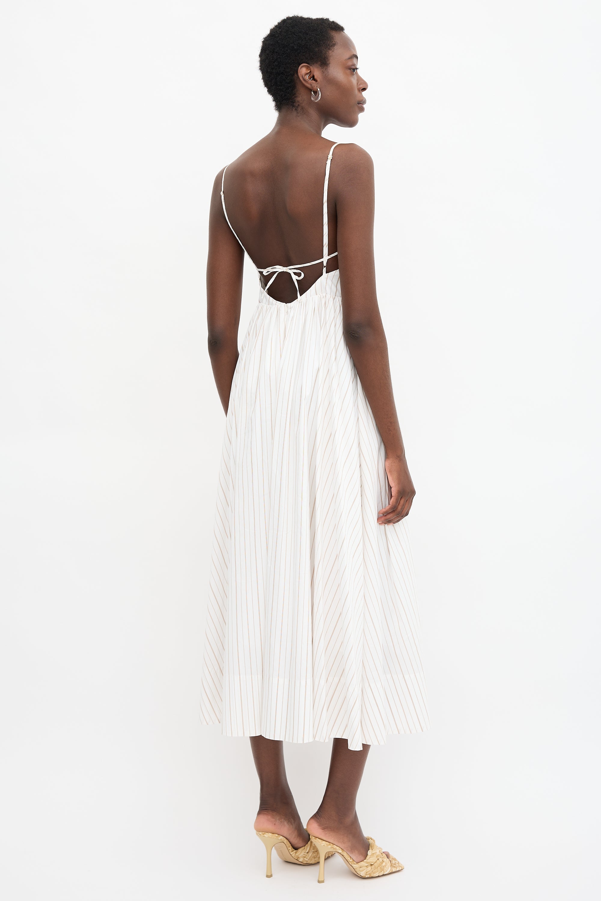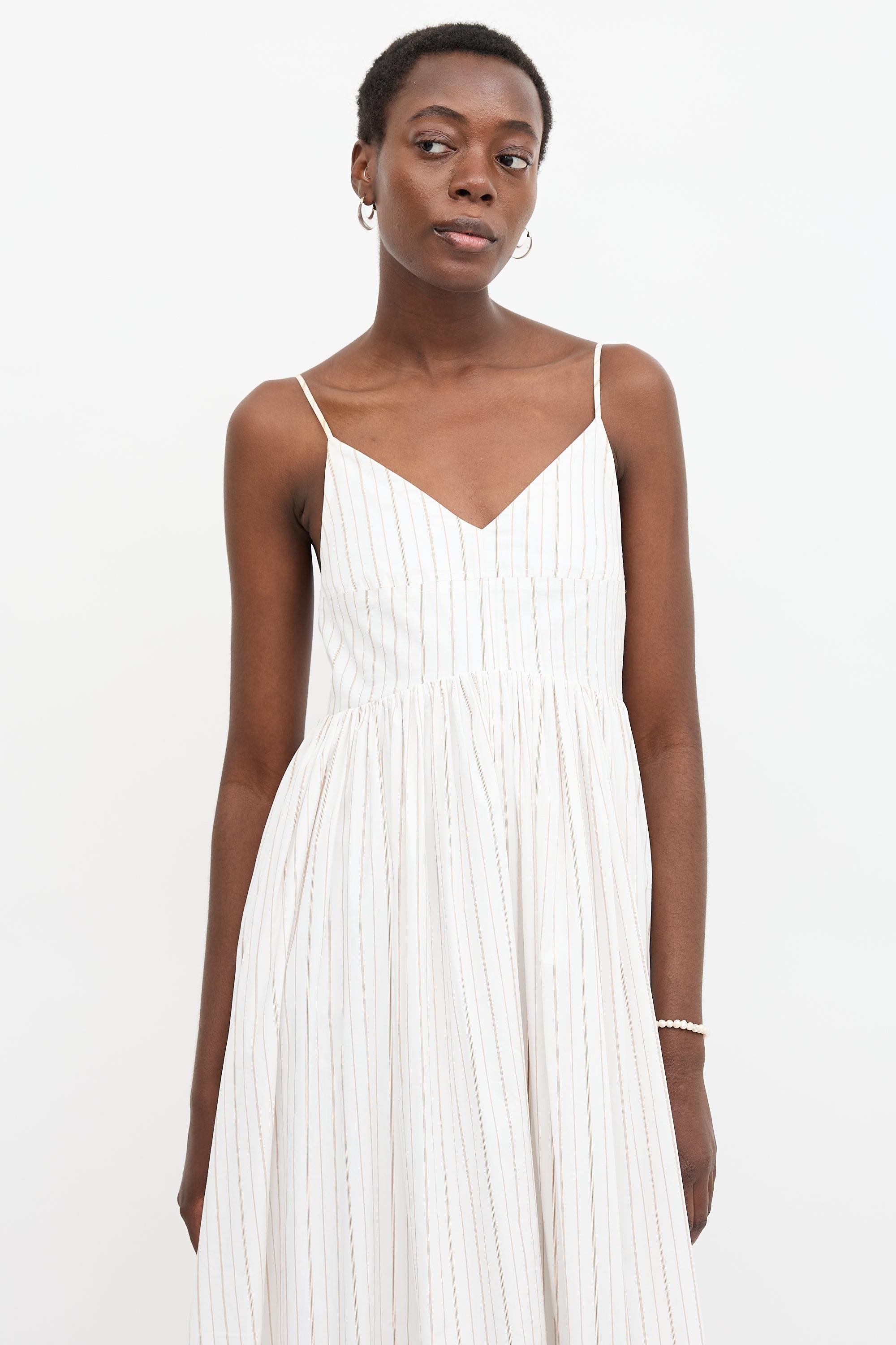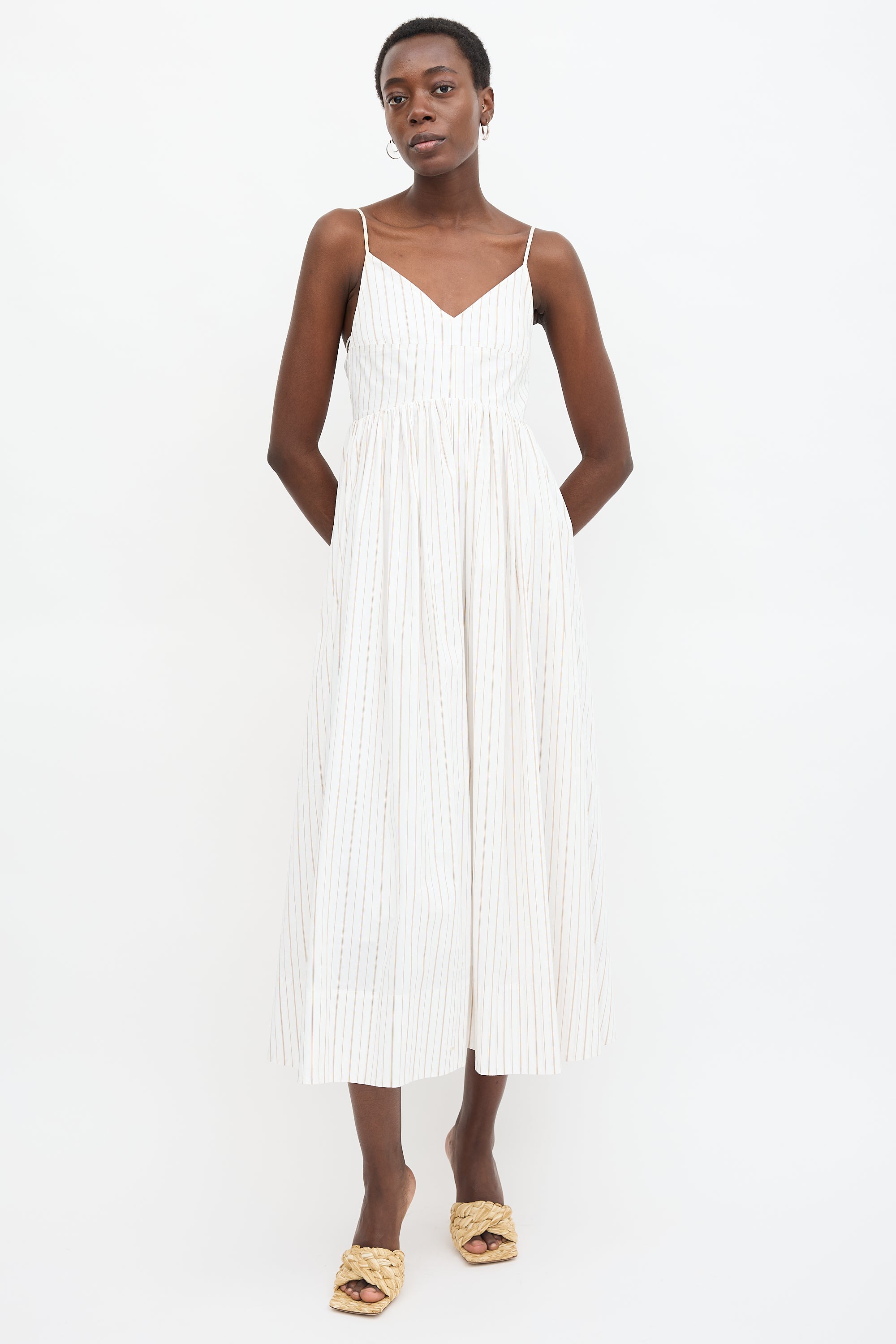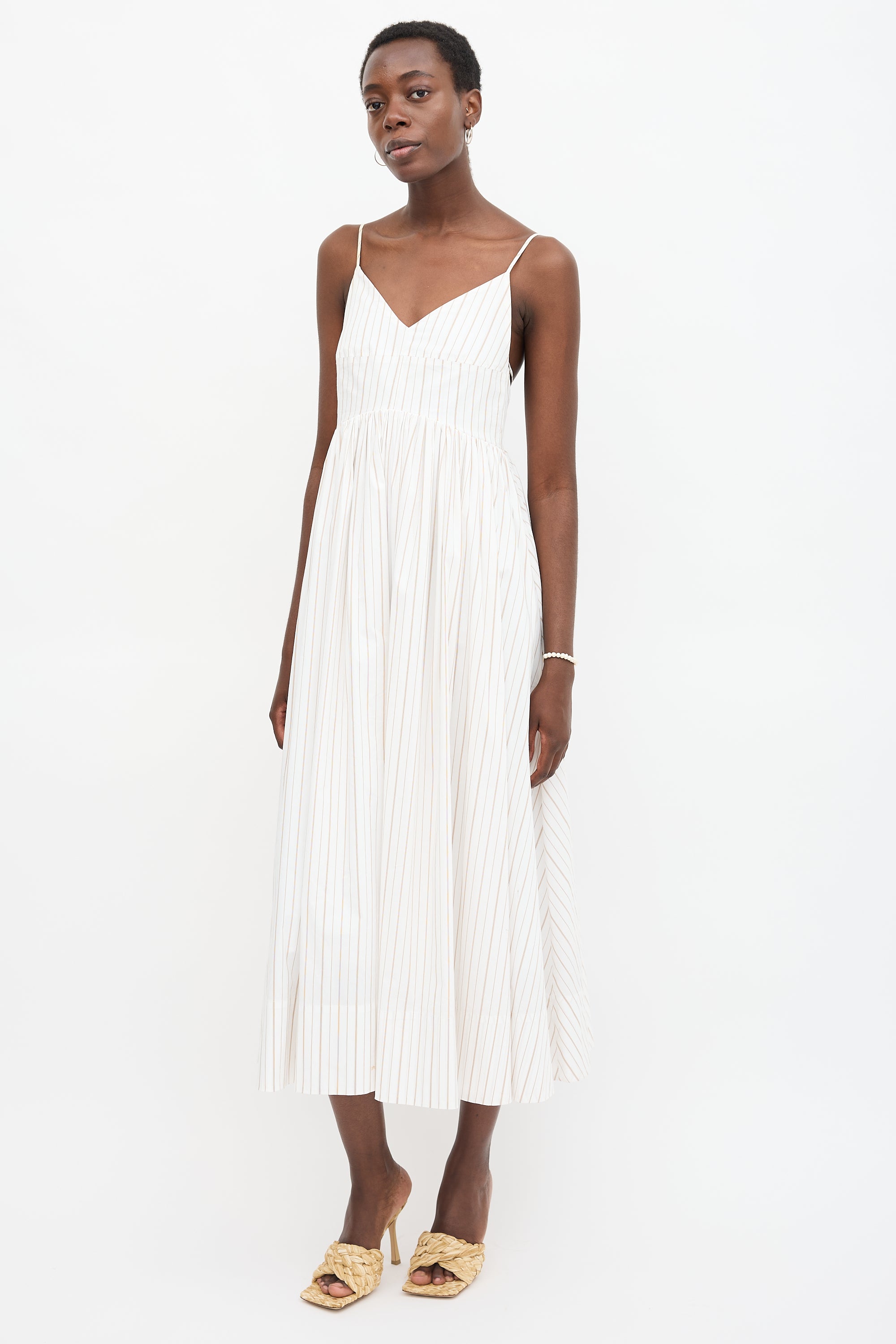 Pre-owned Birgitte Herskind white Justy dress featuring brown pinstripes, V-neckline, adjustable shoulder straps, gathered skirt, and concealed back zip. Lined. Clipped to fit model.
