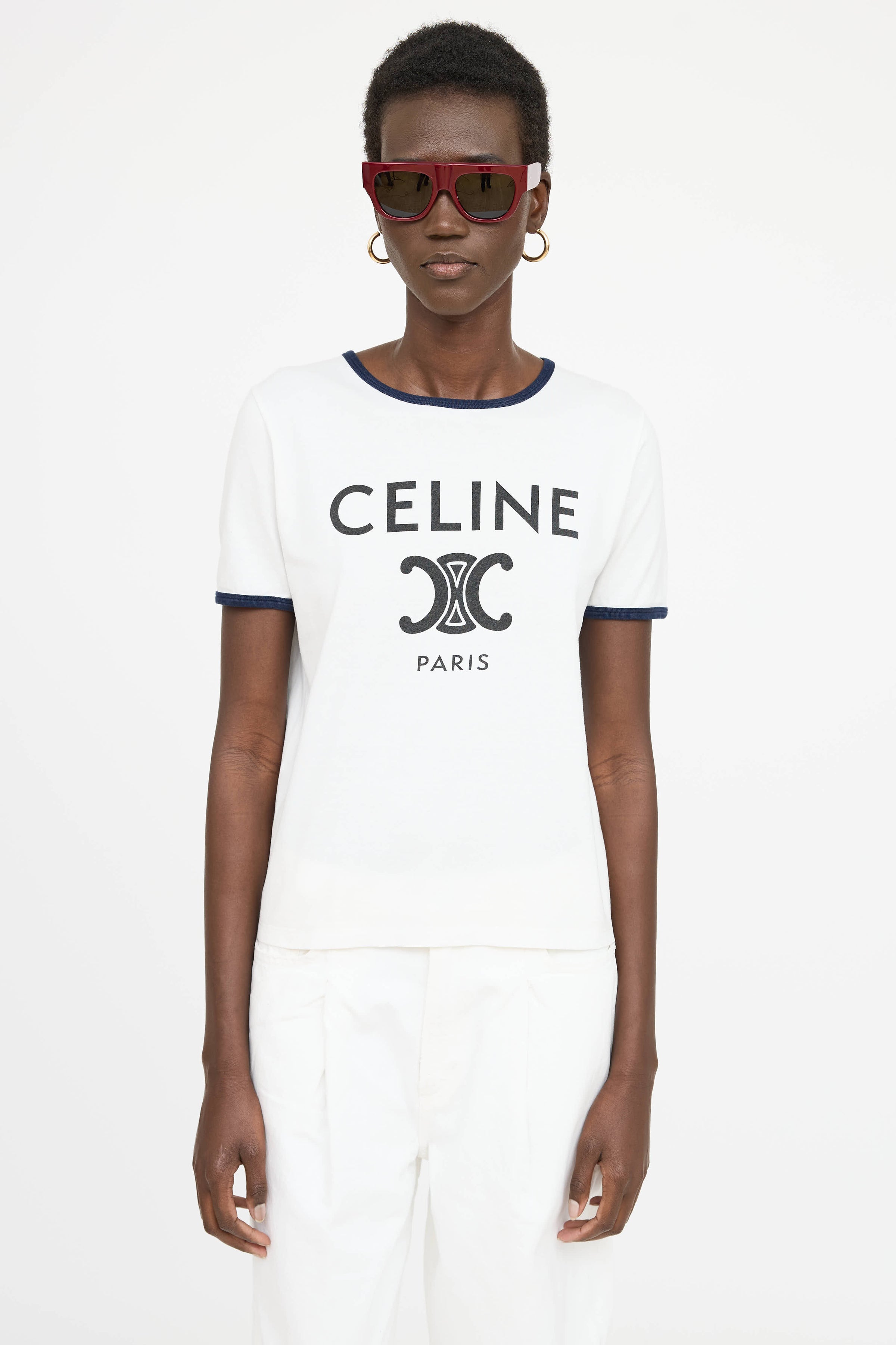 Pre-owned Celine white and navy short sleeve t-shirt featuring round neckline and printed logo at front.