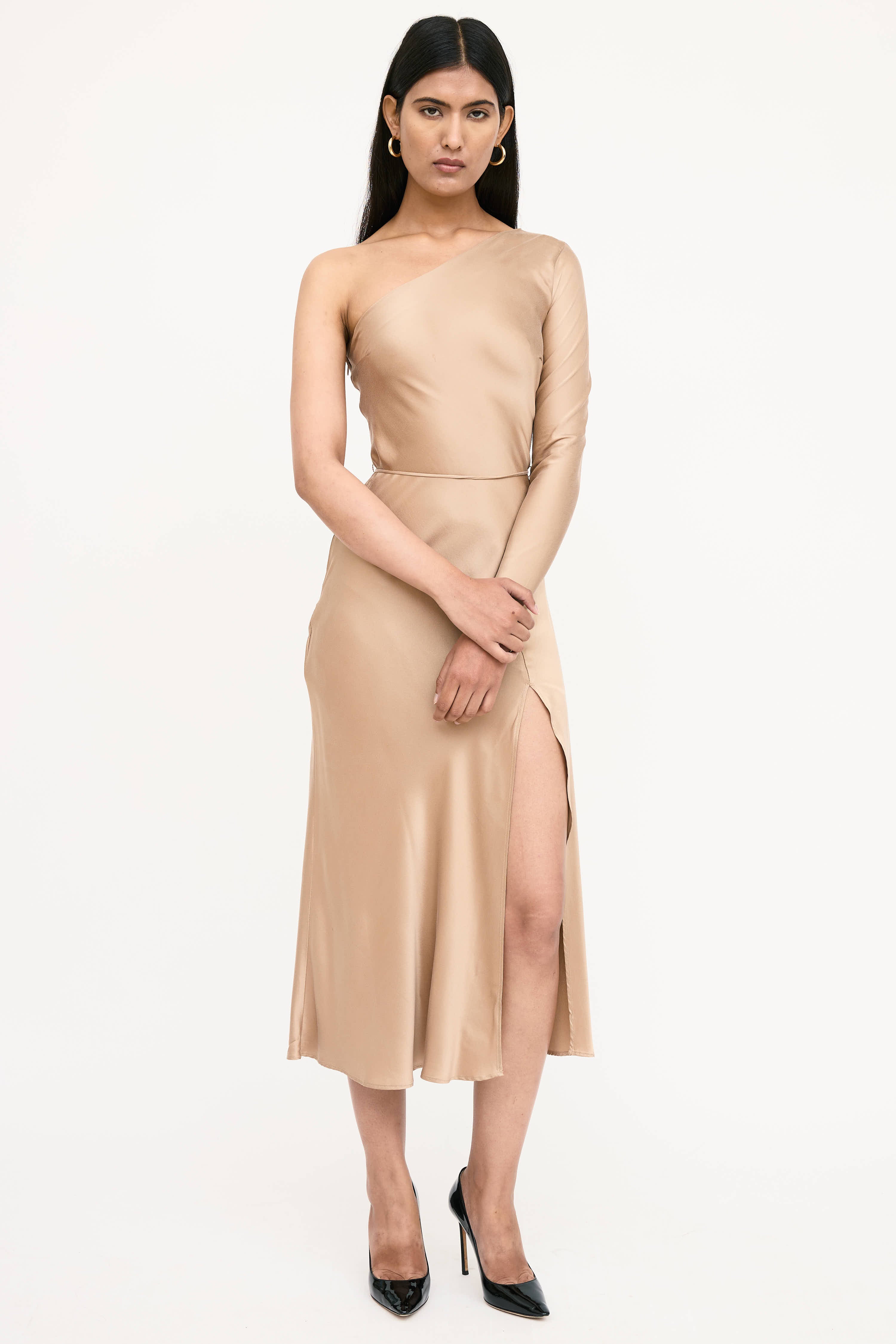 Pre-owned Bec + Bridge beige silk dress featuring an asymmetrical neckline, one sleeve styling, tie waist, and slit at hem.