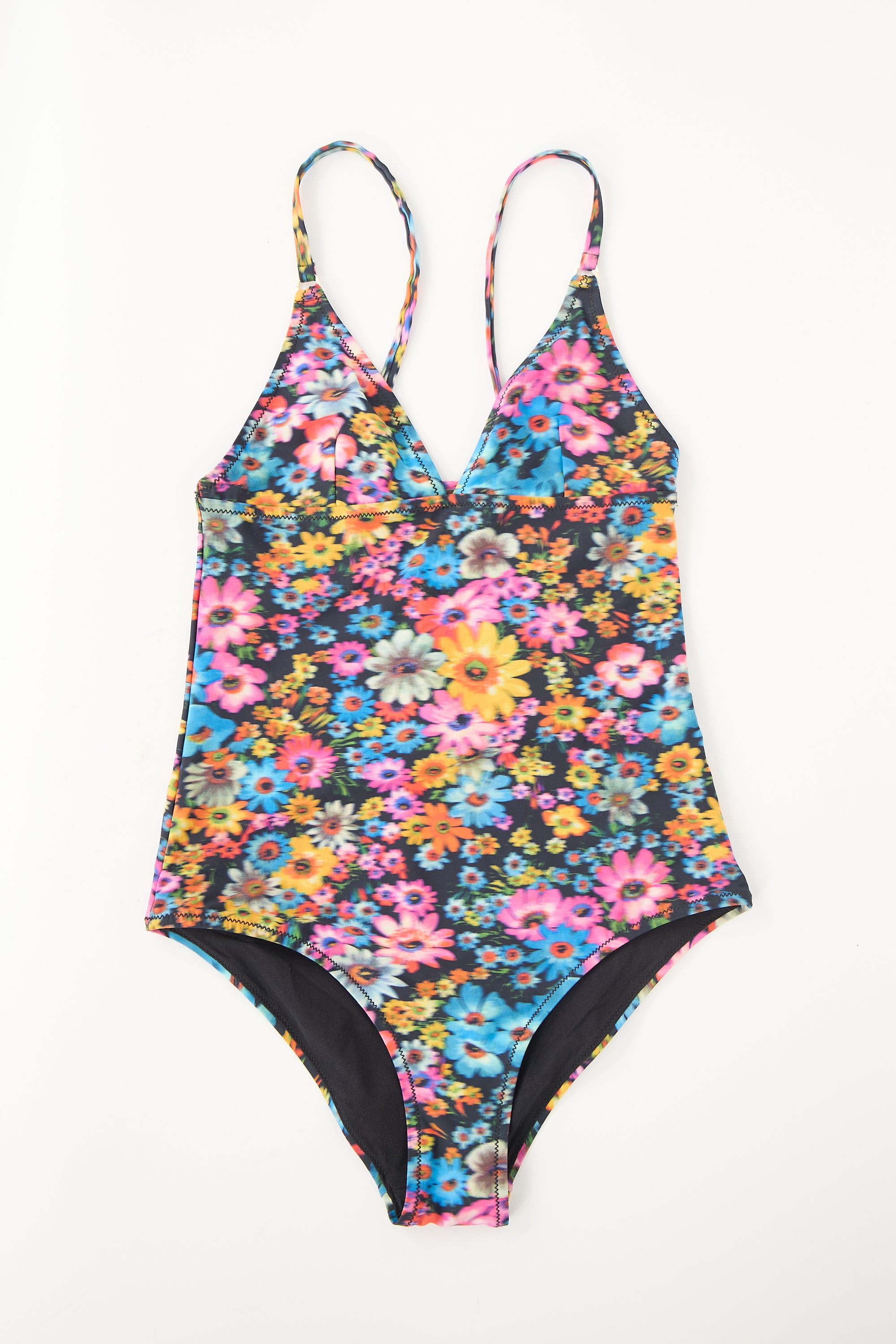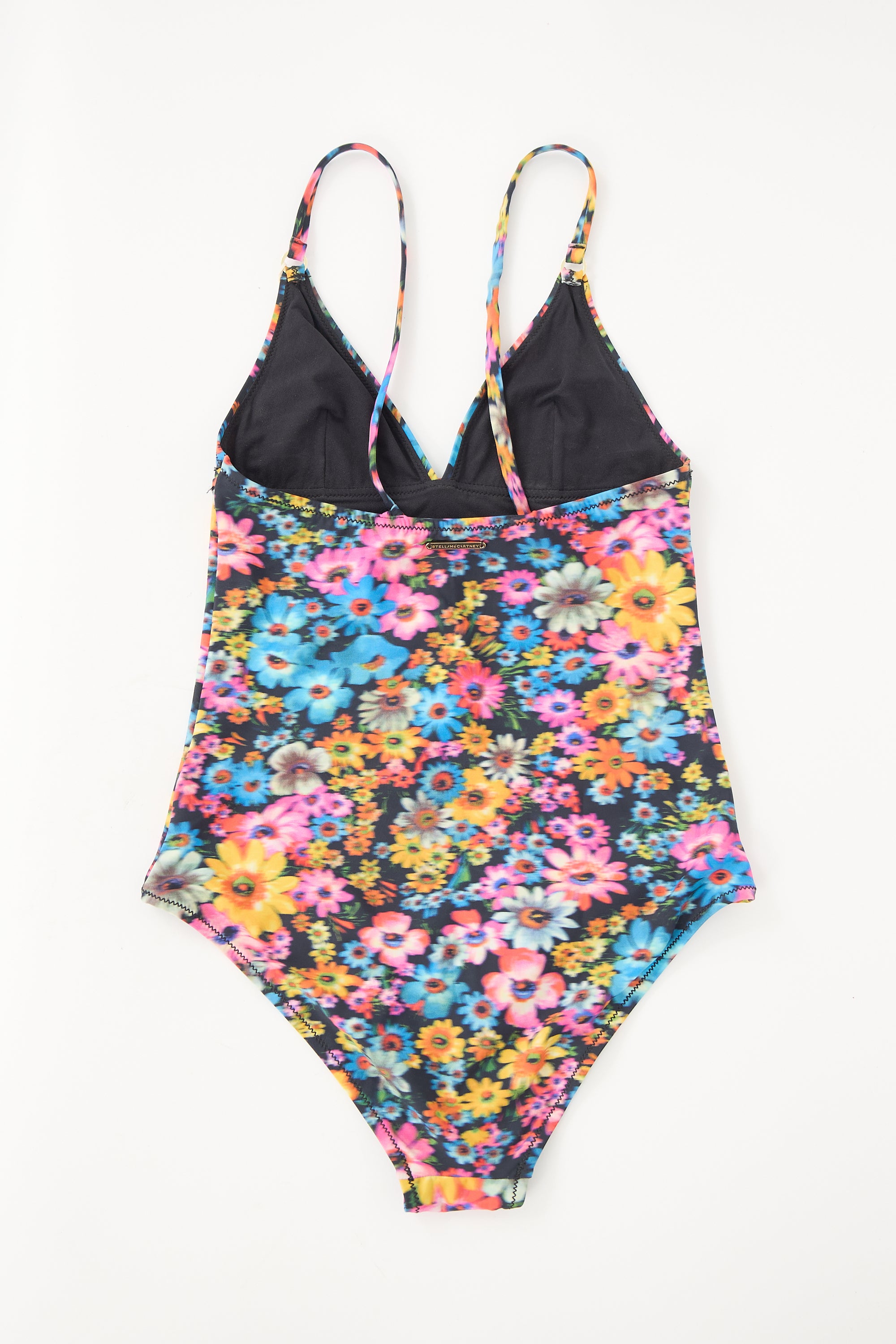 Pre-owned Stella McCartney one piece swimsuit featuring multicolour floral print, V-neckline, adjustable shoulder straps, gold tone logo embellishment at back collar, and brief cut.