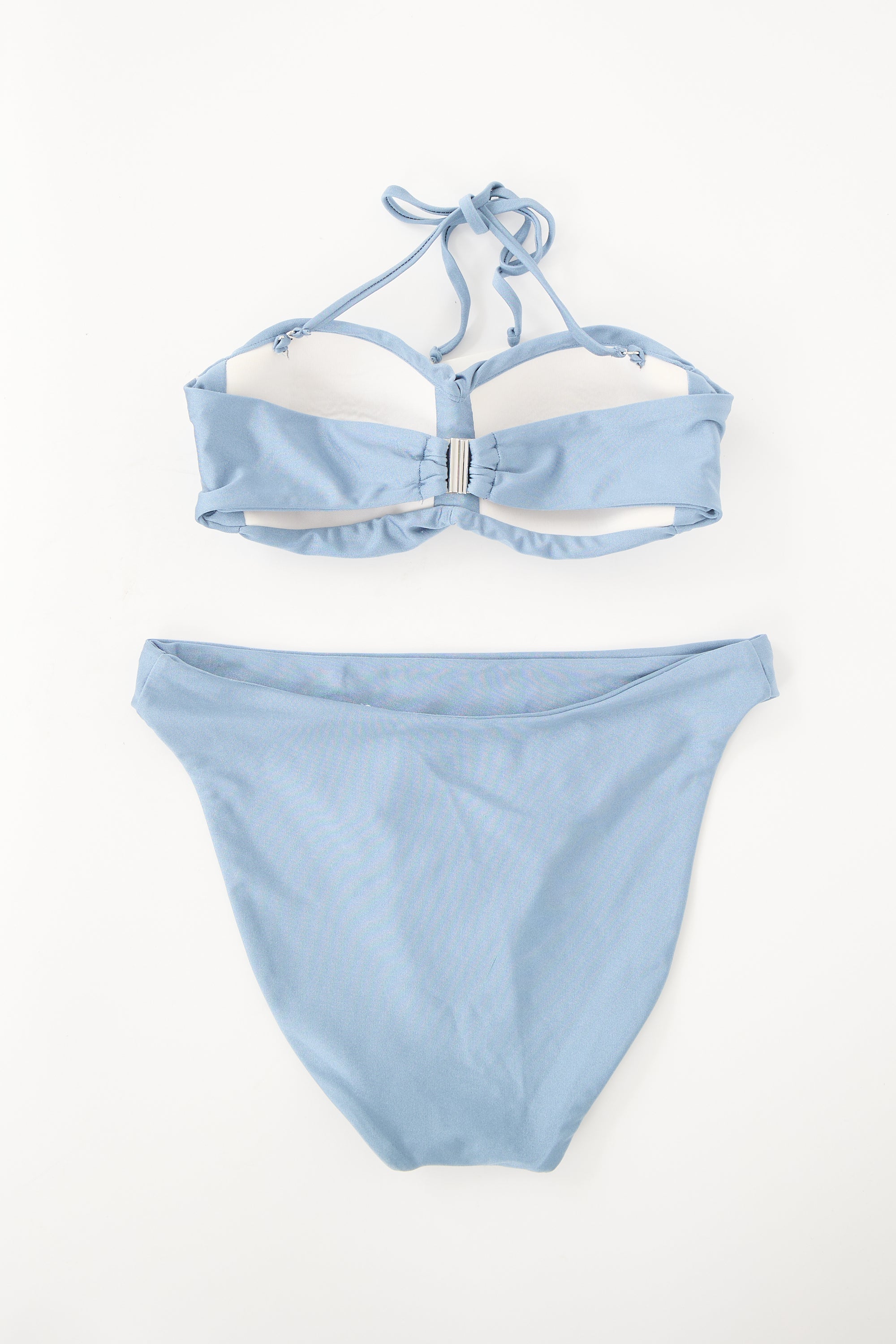 Pre-owned Veronica Beard blue Lina & Marau two piece swimsuit featuring a top with halter neck ties, twisted and ruched front, padded bust, and back clasp closure. Matching bottoms with high rise and french cut.