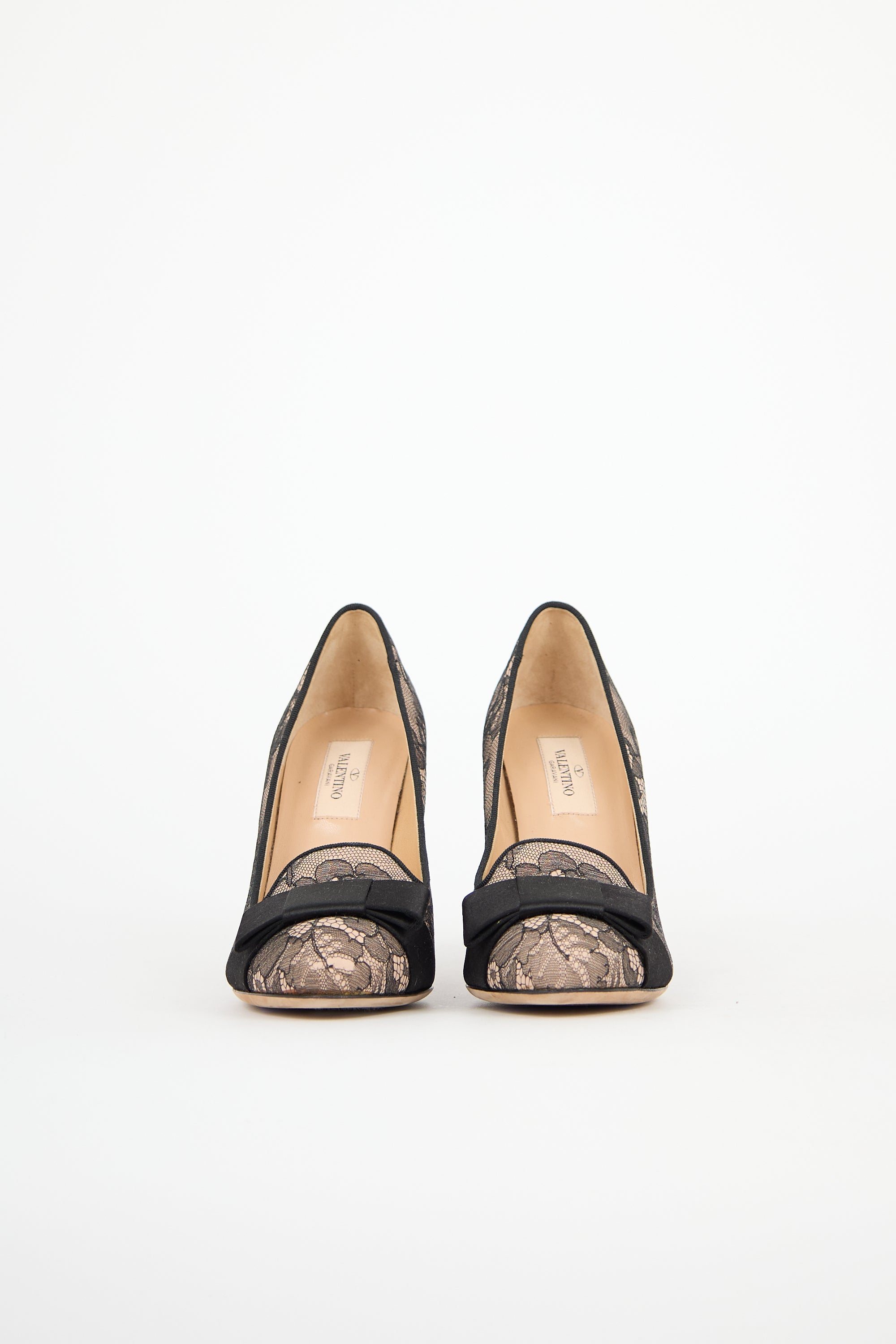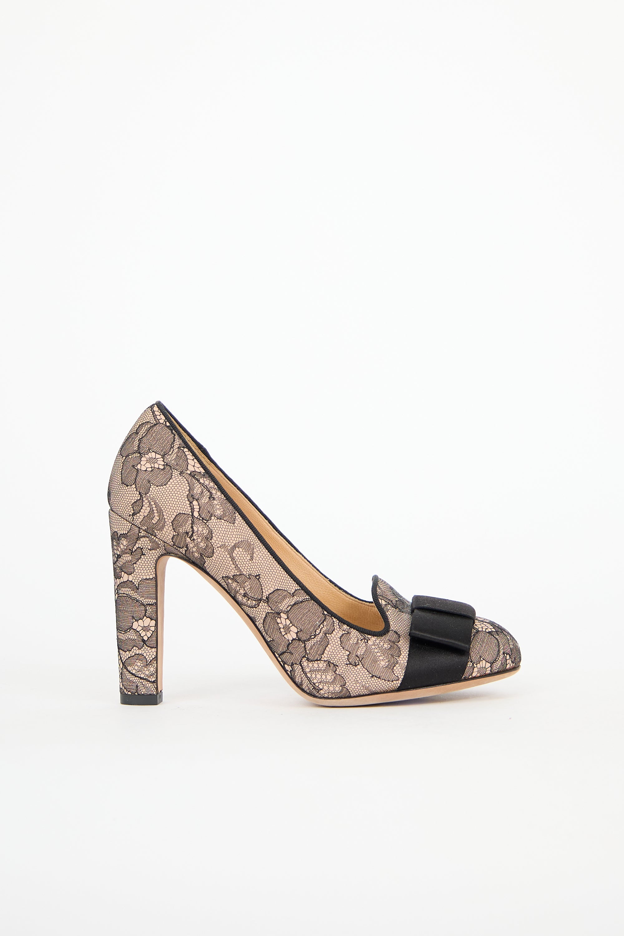 Pre-owned Valentino beige leather pump featuring a black lace overlay throughout, rounded toe, black satin bow at vamp, notched topline, and a covered block heel.