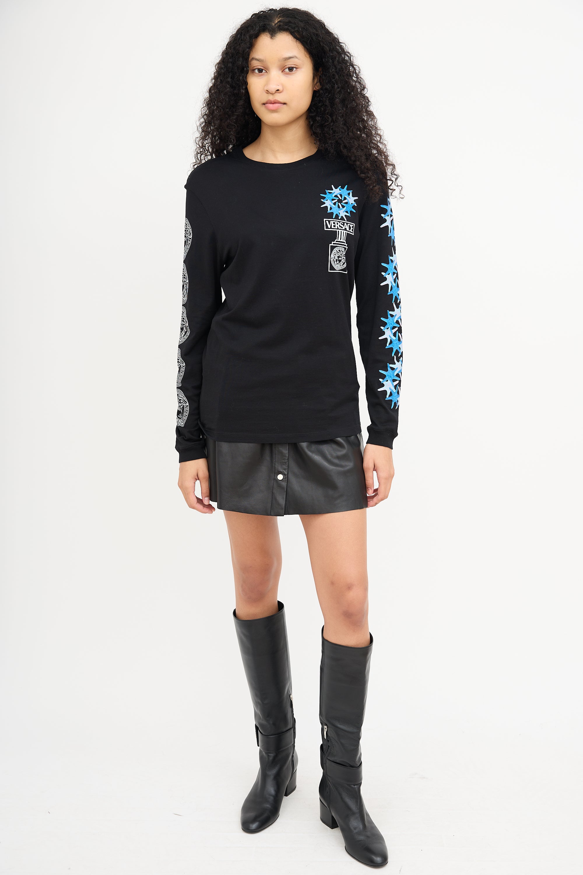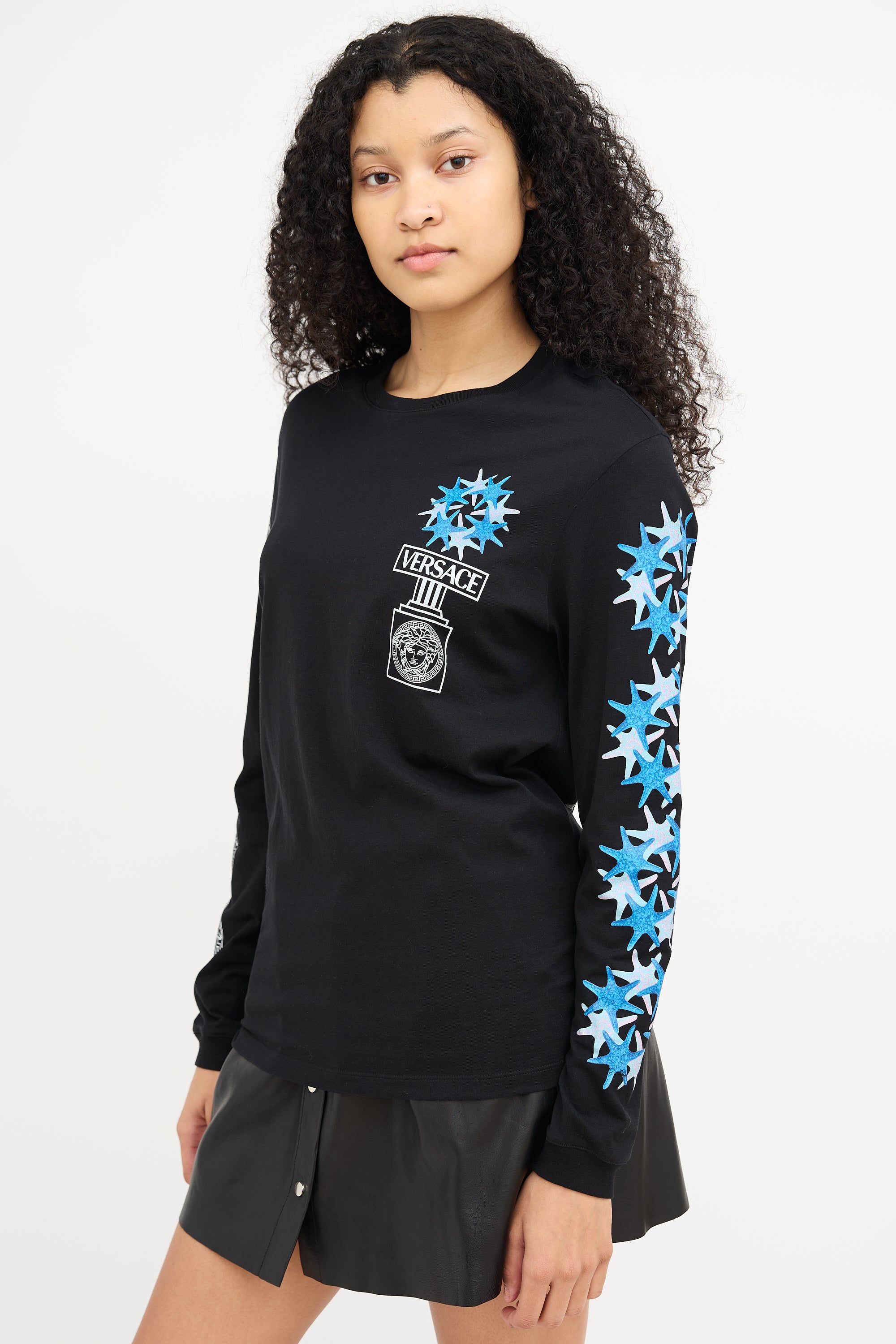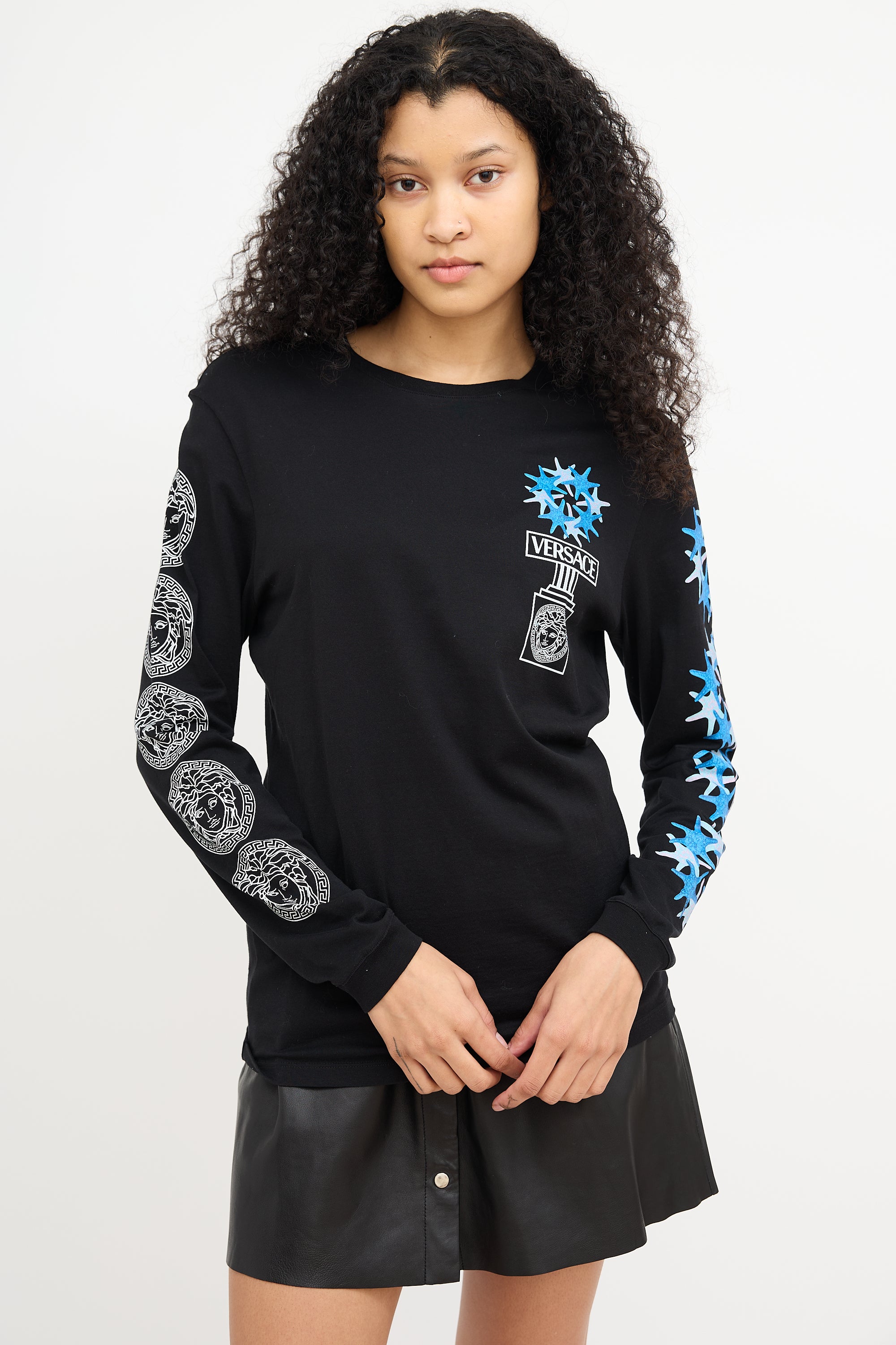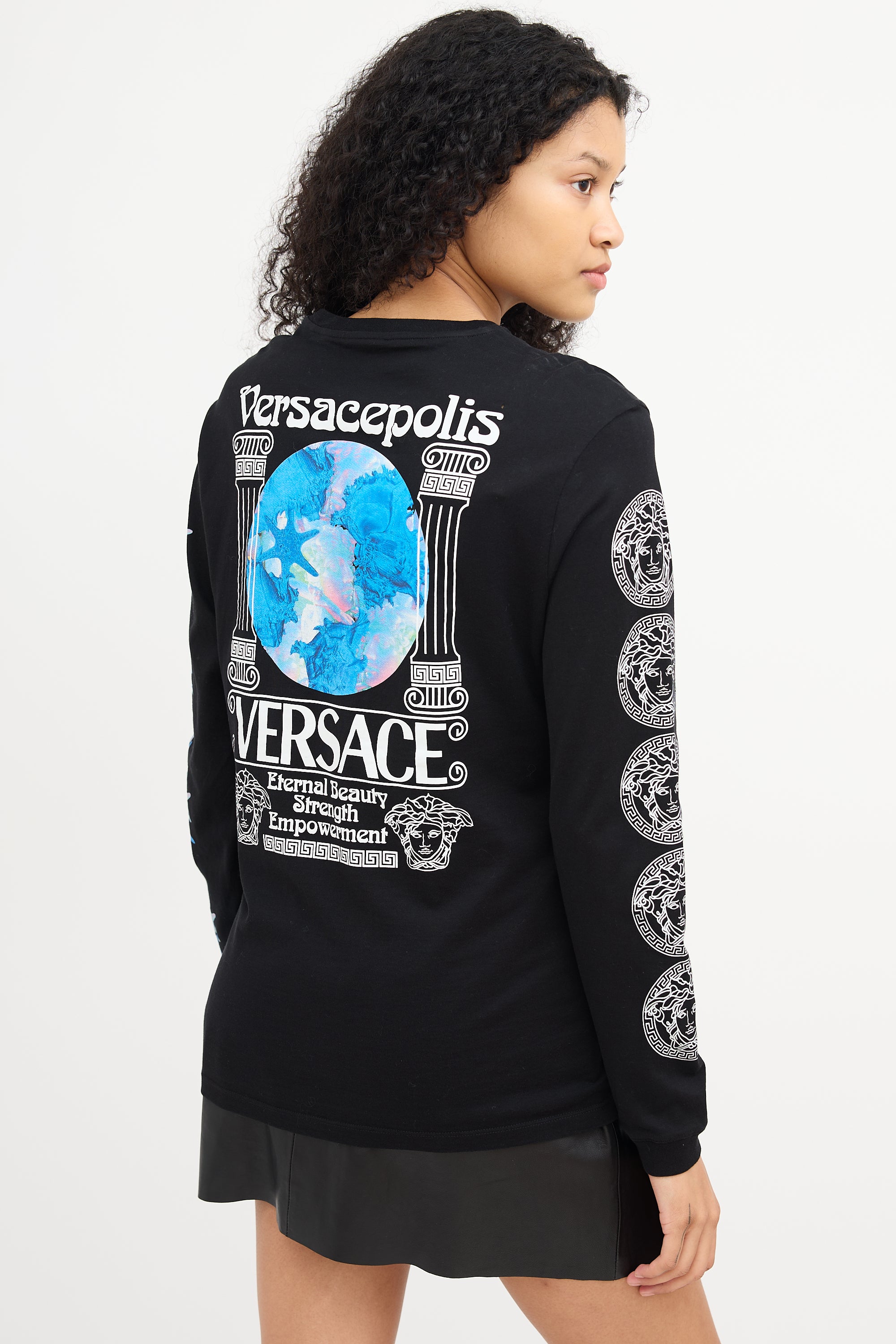 Pre-owned Versace black Versacepolis long sleeve top featuring round neckline, blue and white graphic at chest and back, and white printed Medusa print throughout sleeves.