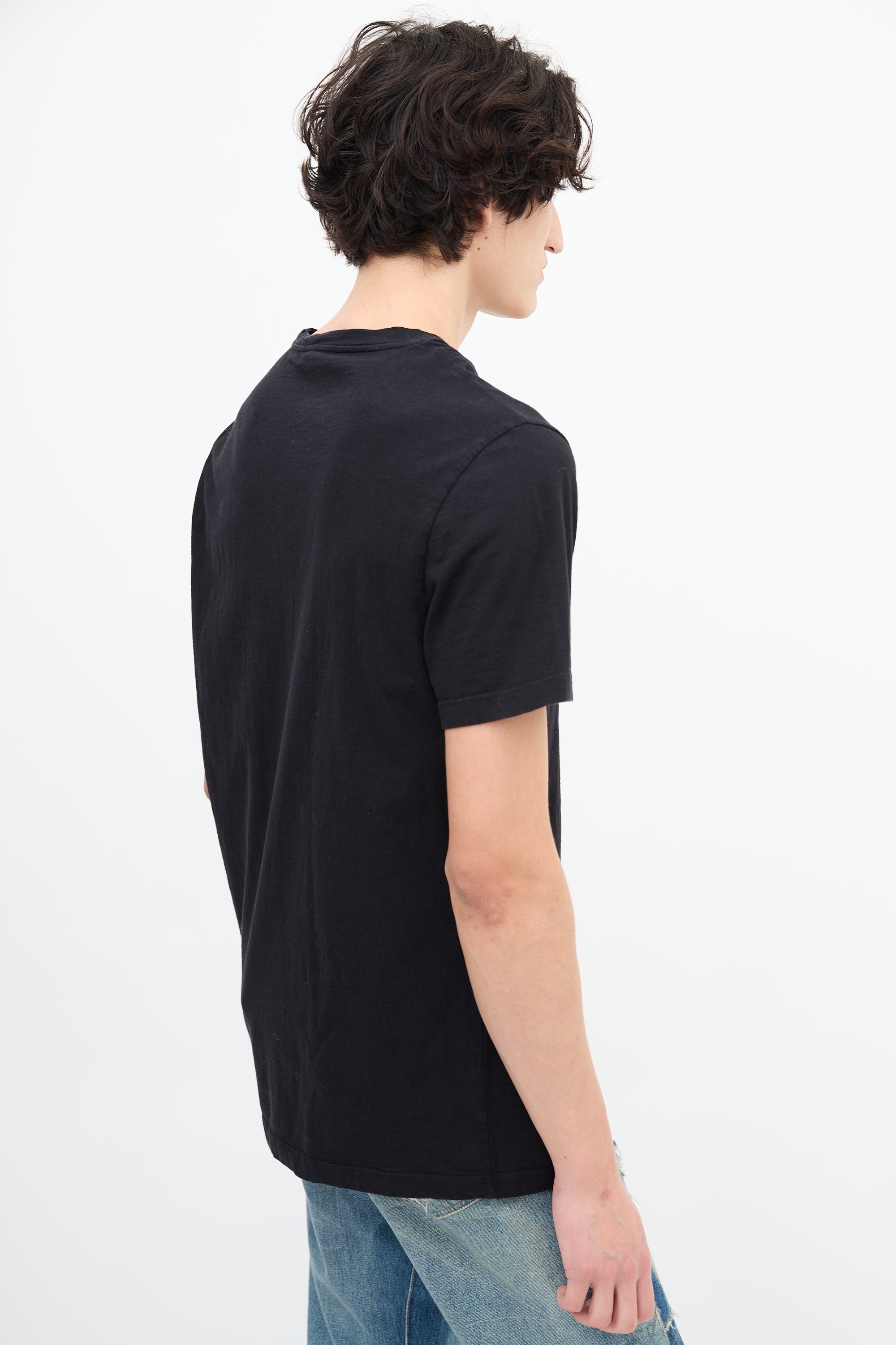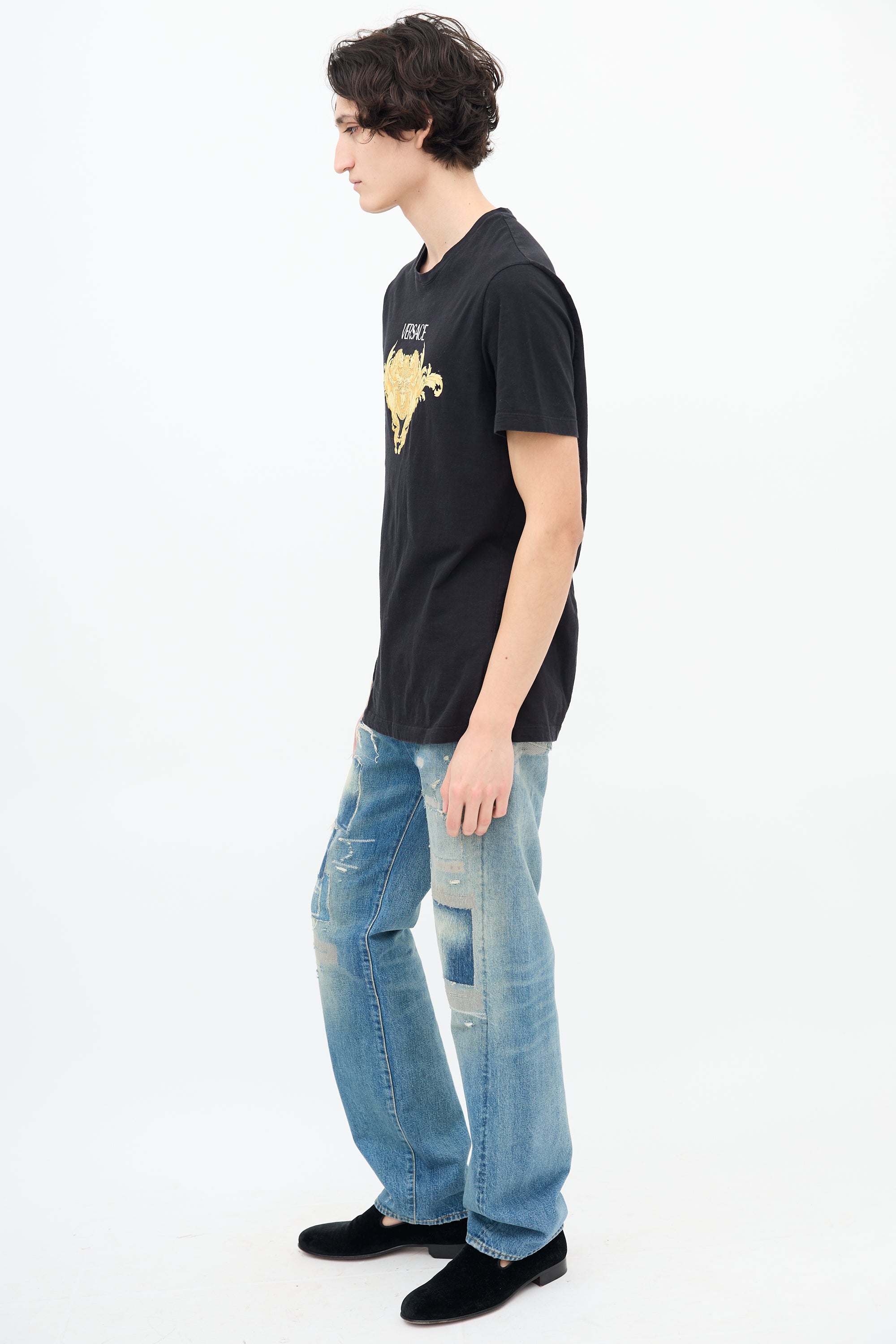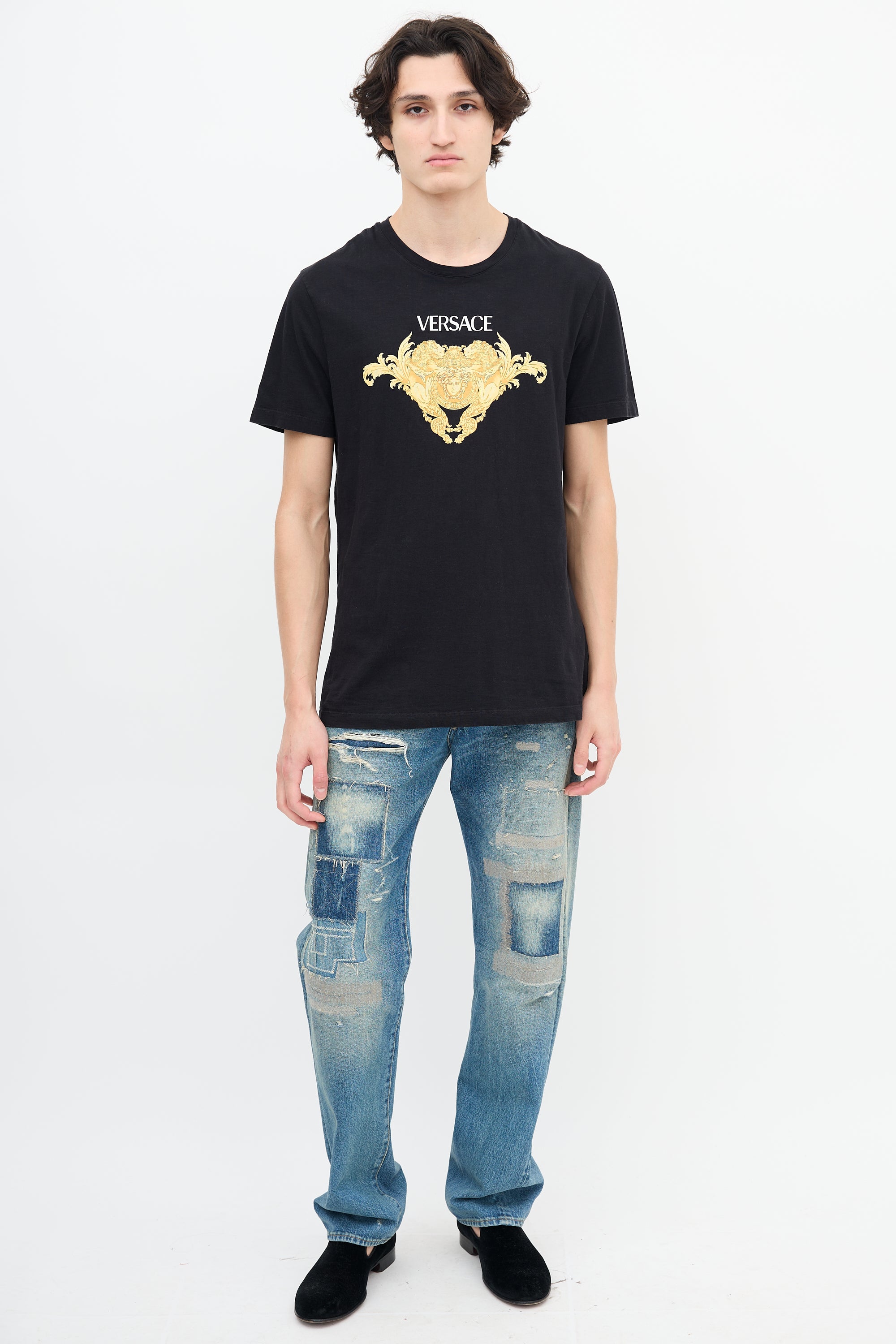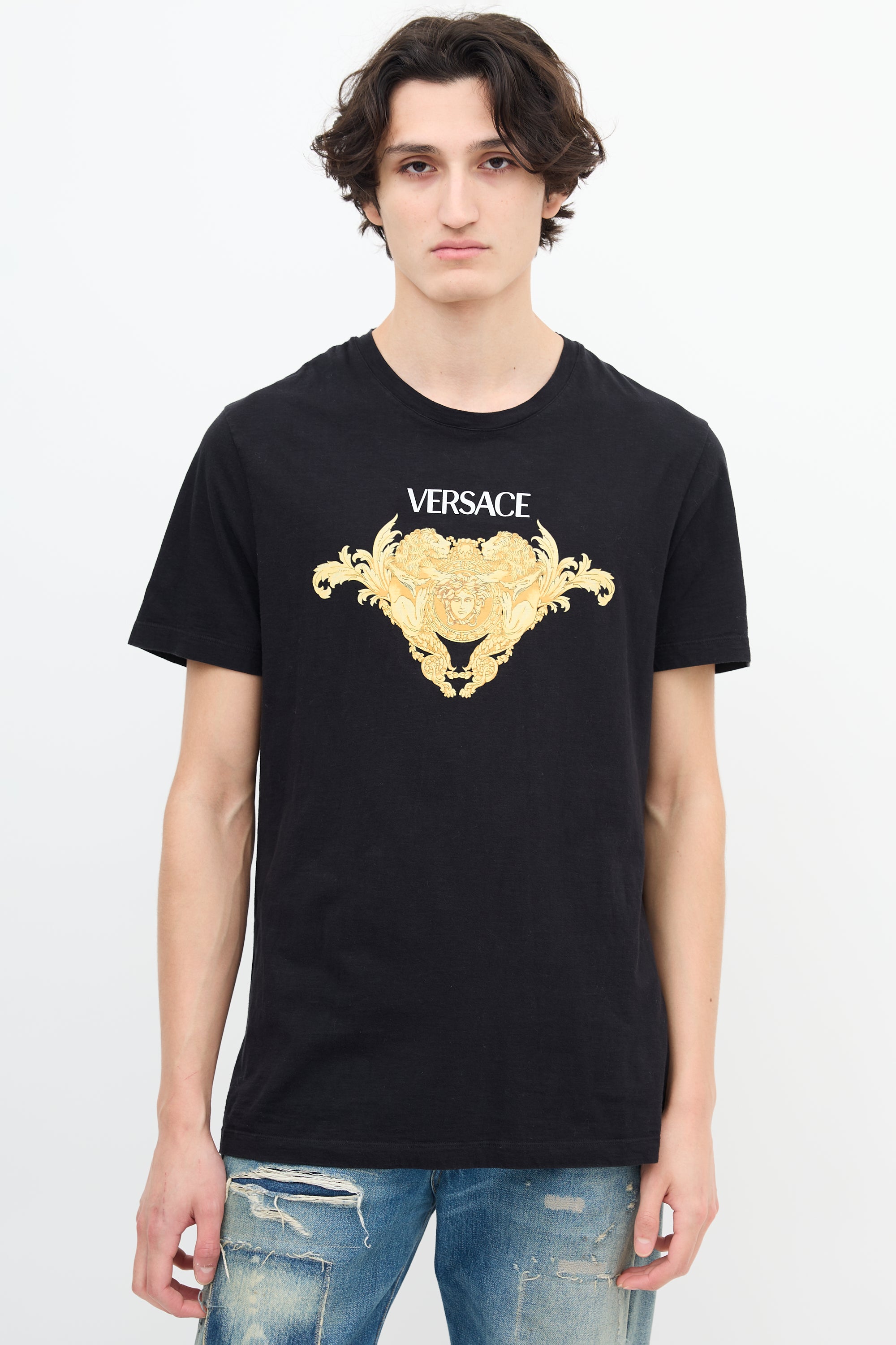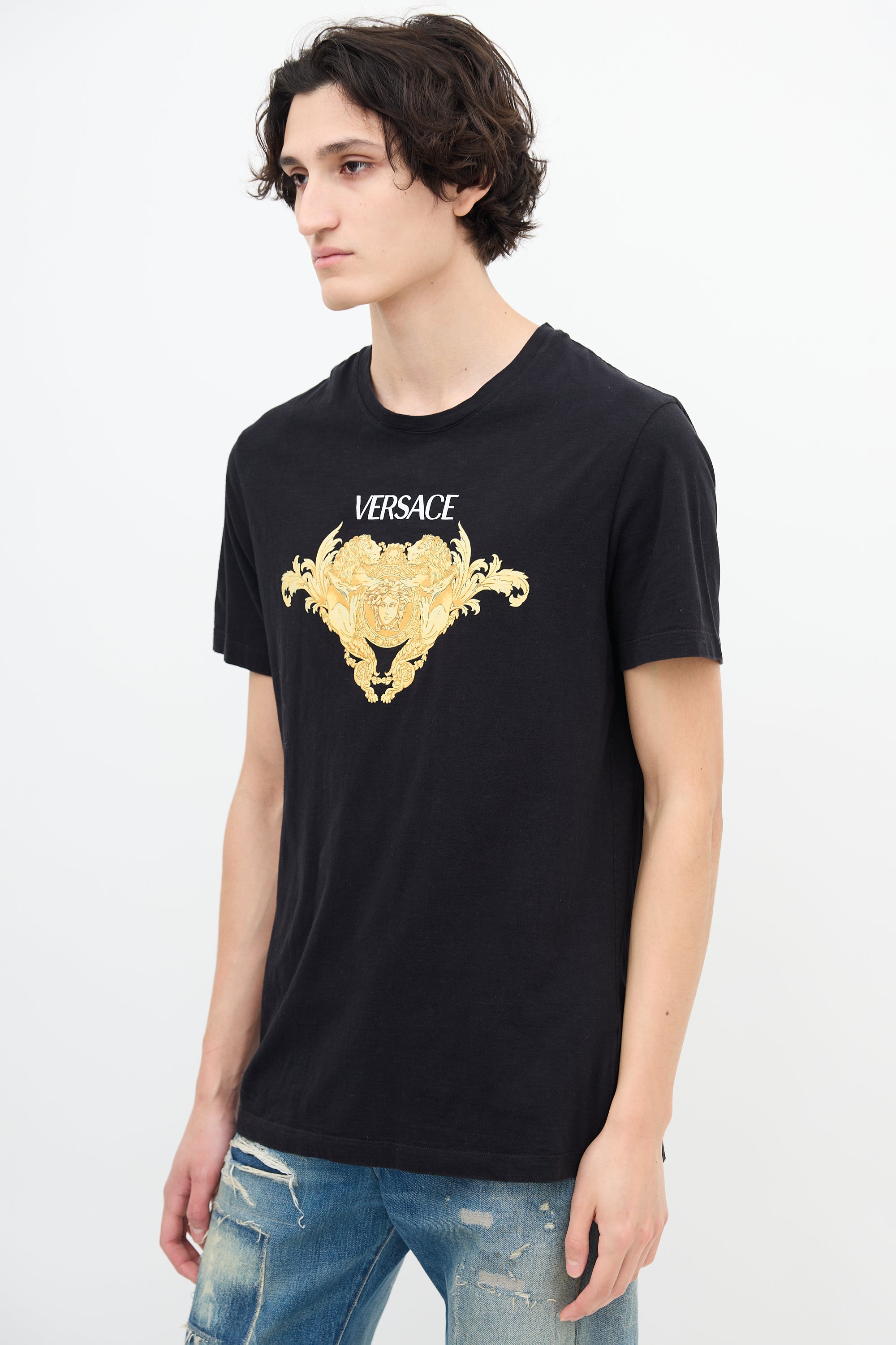 Pre-owned Versace black T-shirt featuring round neckline and printed gold tone medusa print logo.