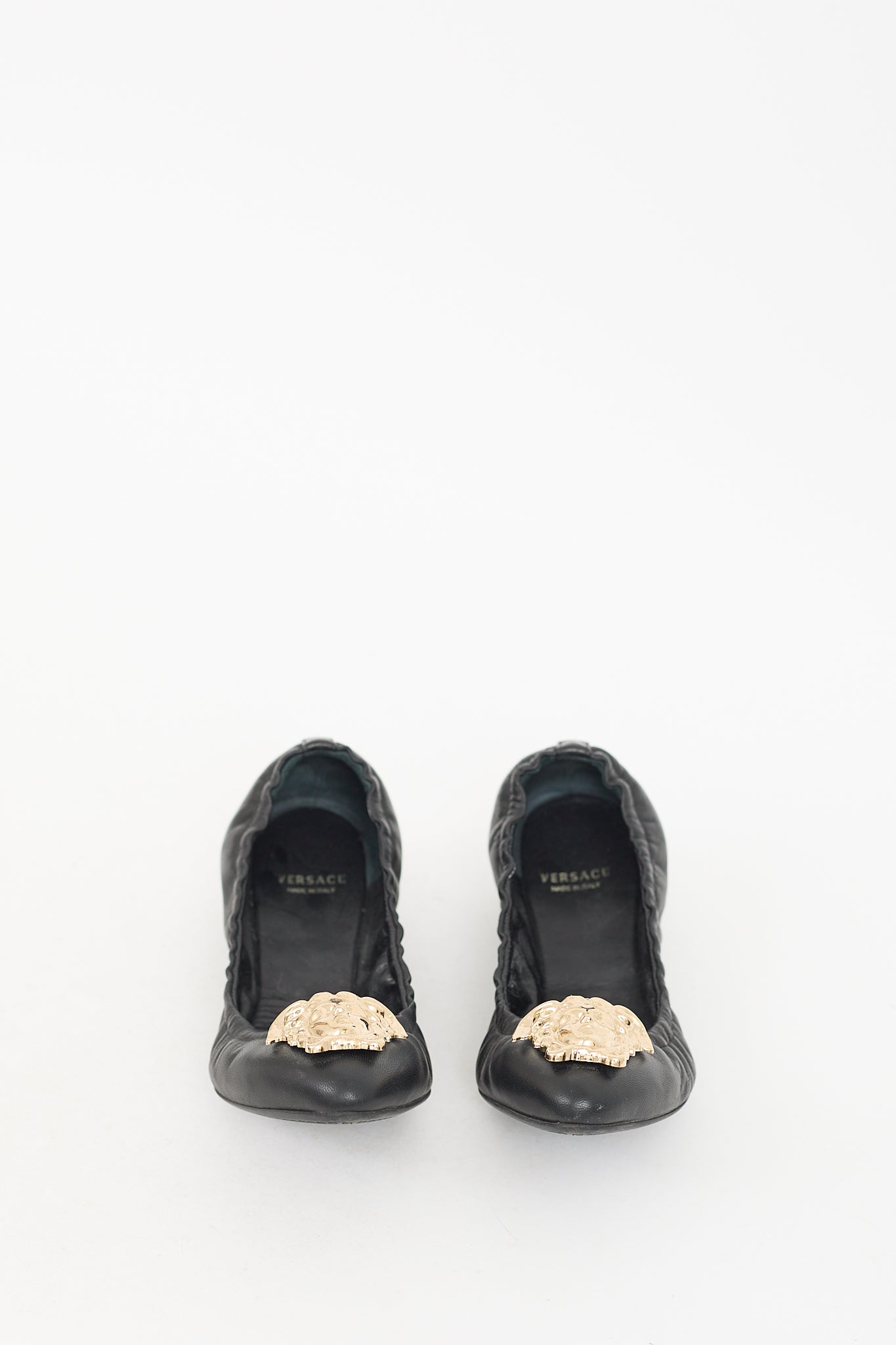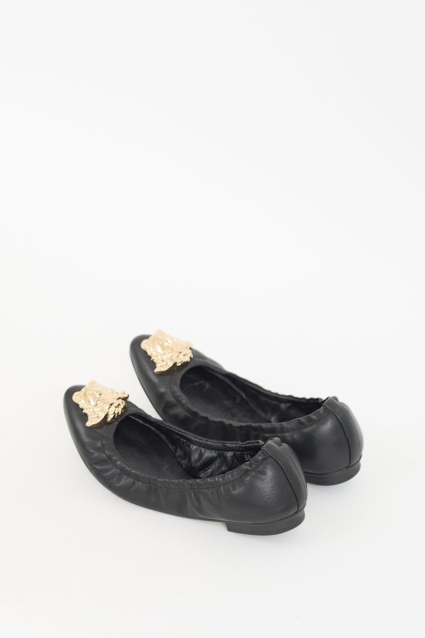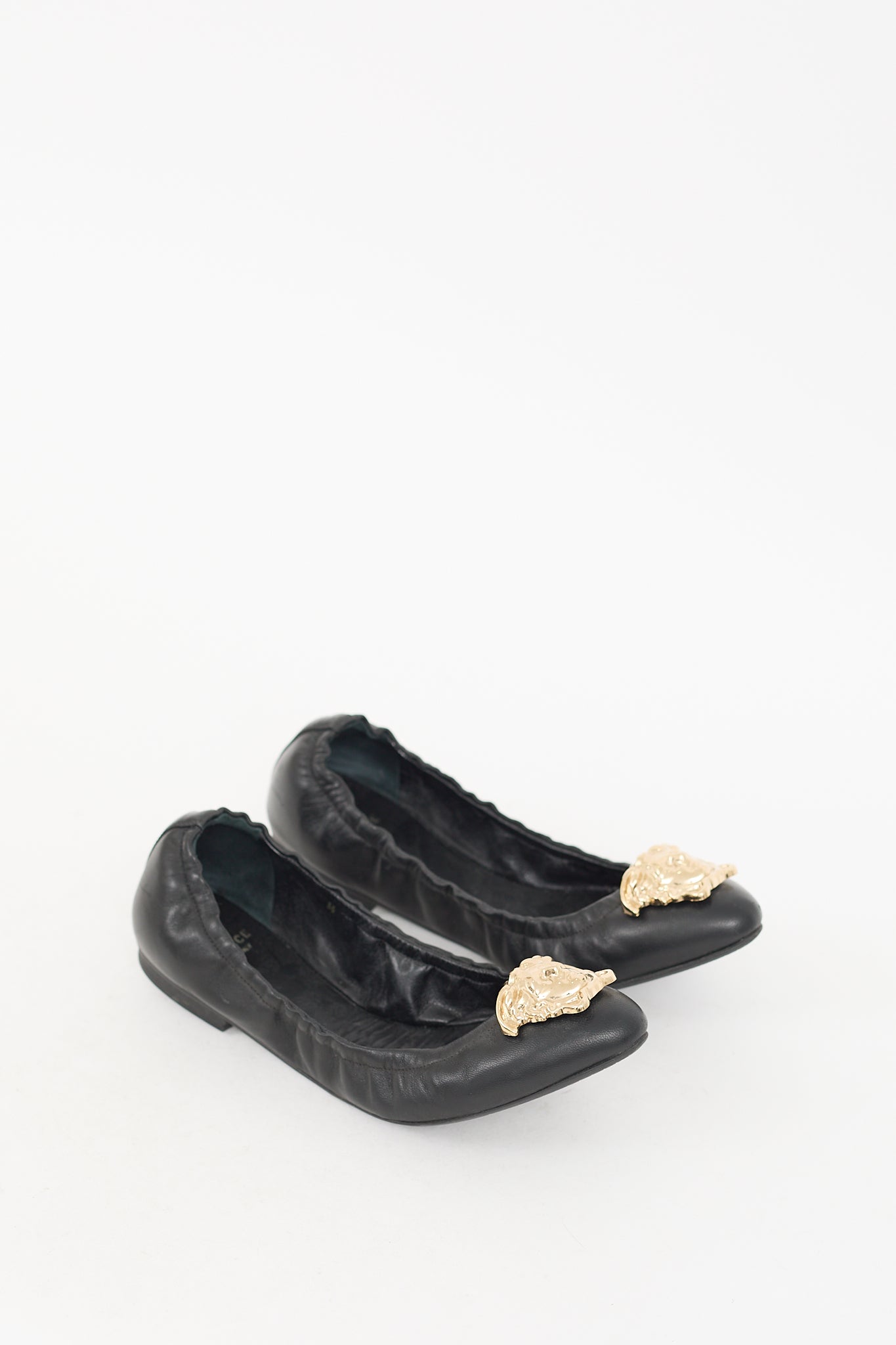 Pre-owned Versace black leather ballet flats featuring pointed toe, gold tone Medusa hardware at toe, elasticized collar, and rubber outsole.