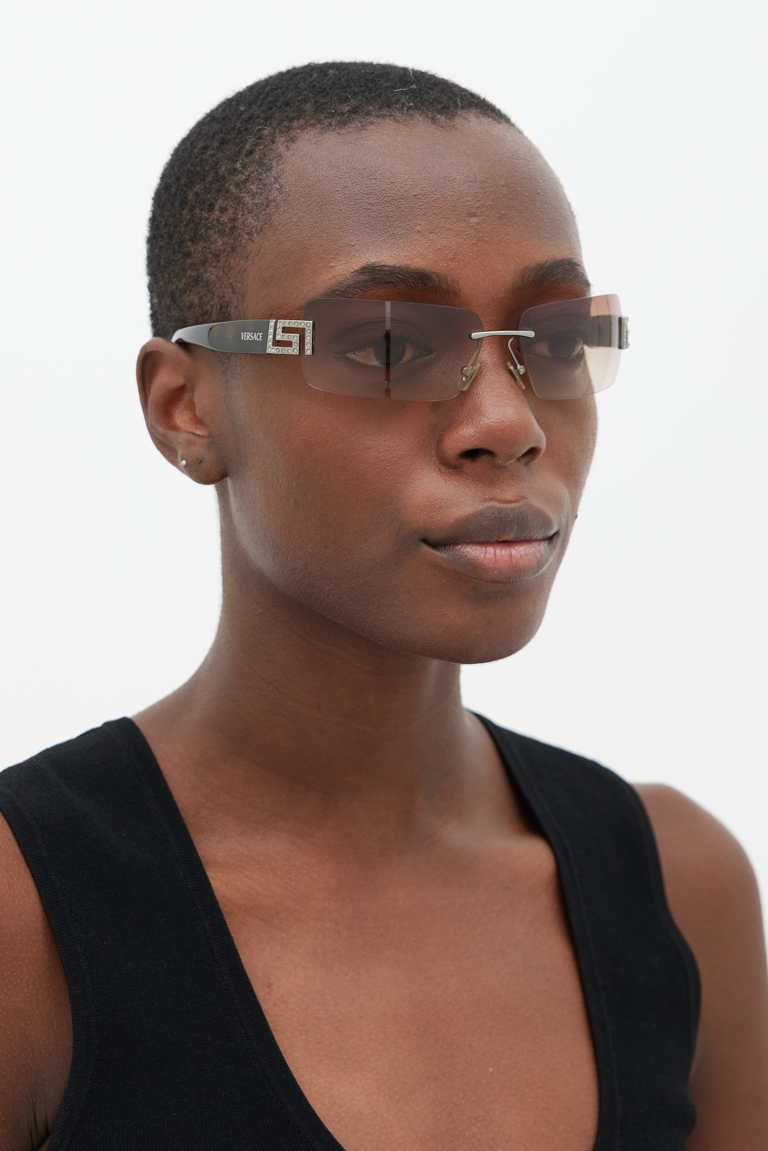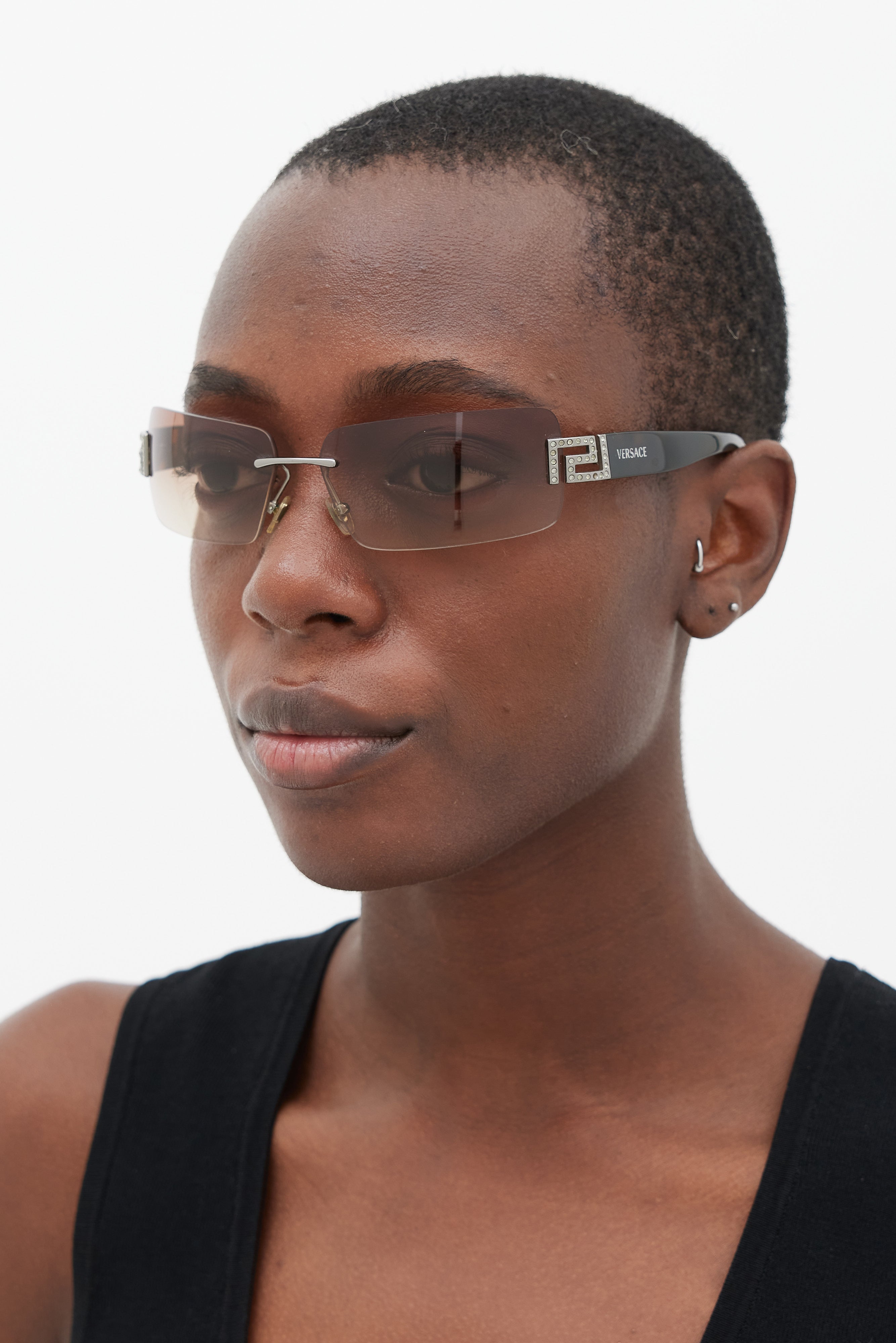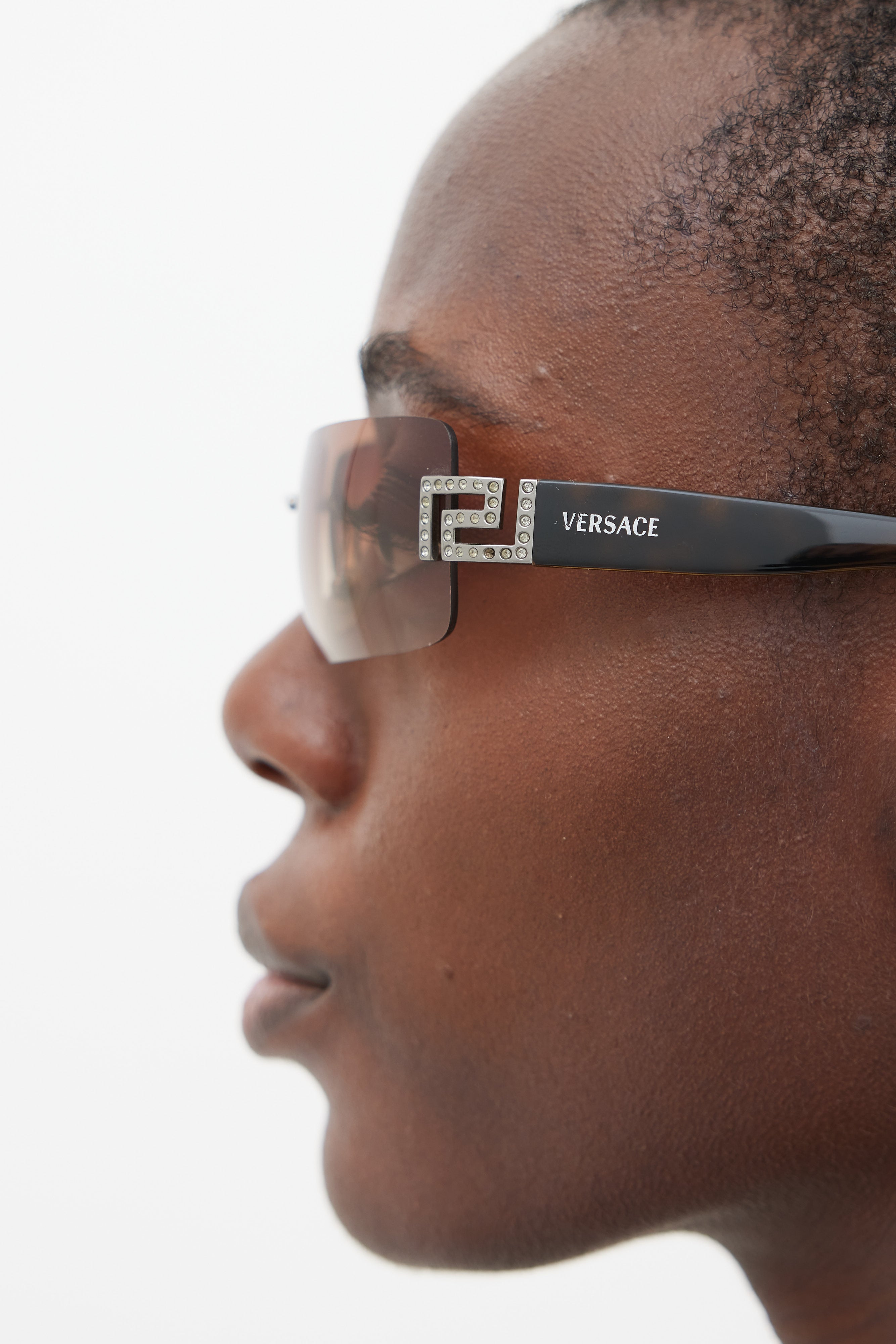 Pre-owned Versace brown 2017B sunglasses featuring rectangular tinted lenses, tortoise shell frame, nose pads, and silver tone logo at temple.