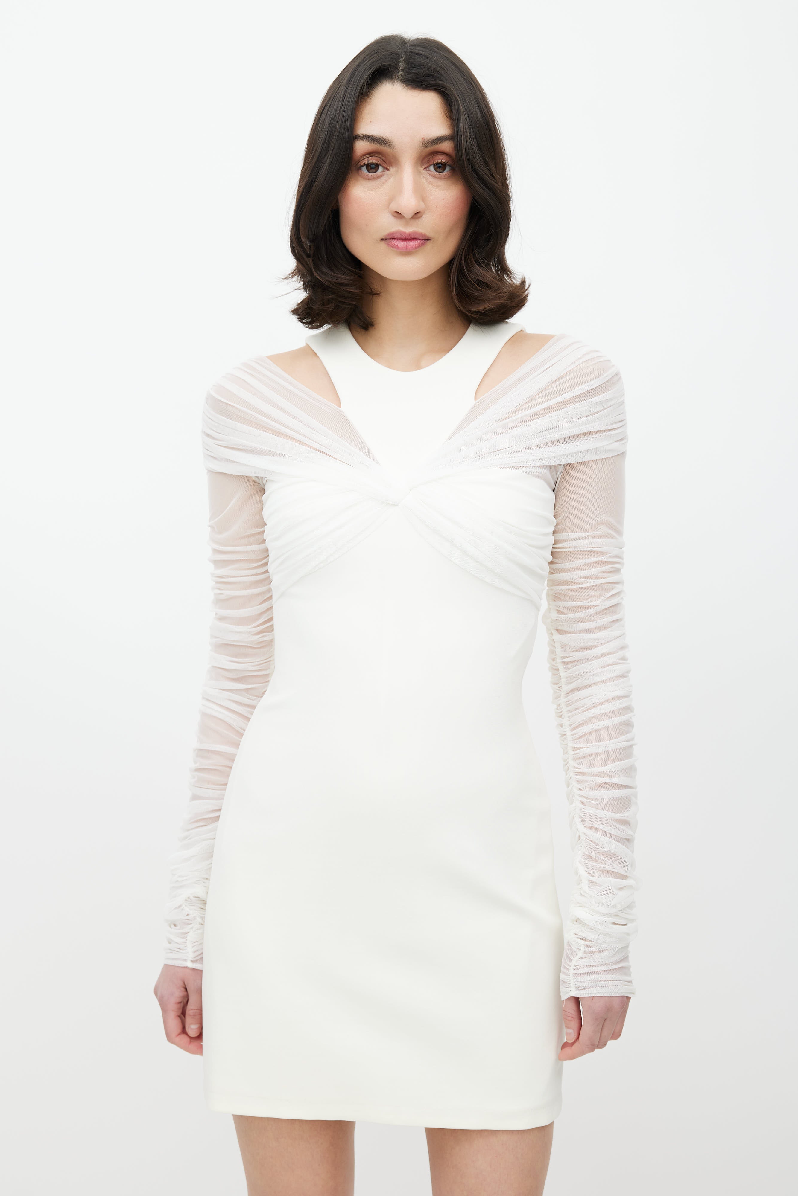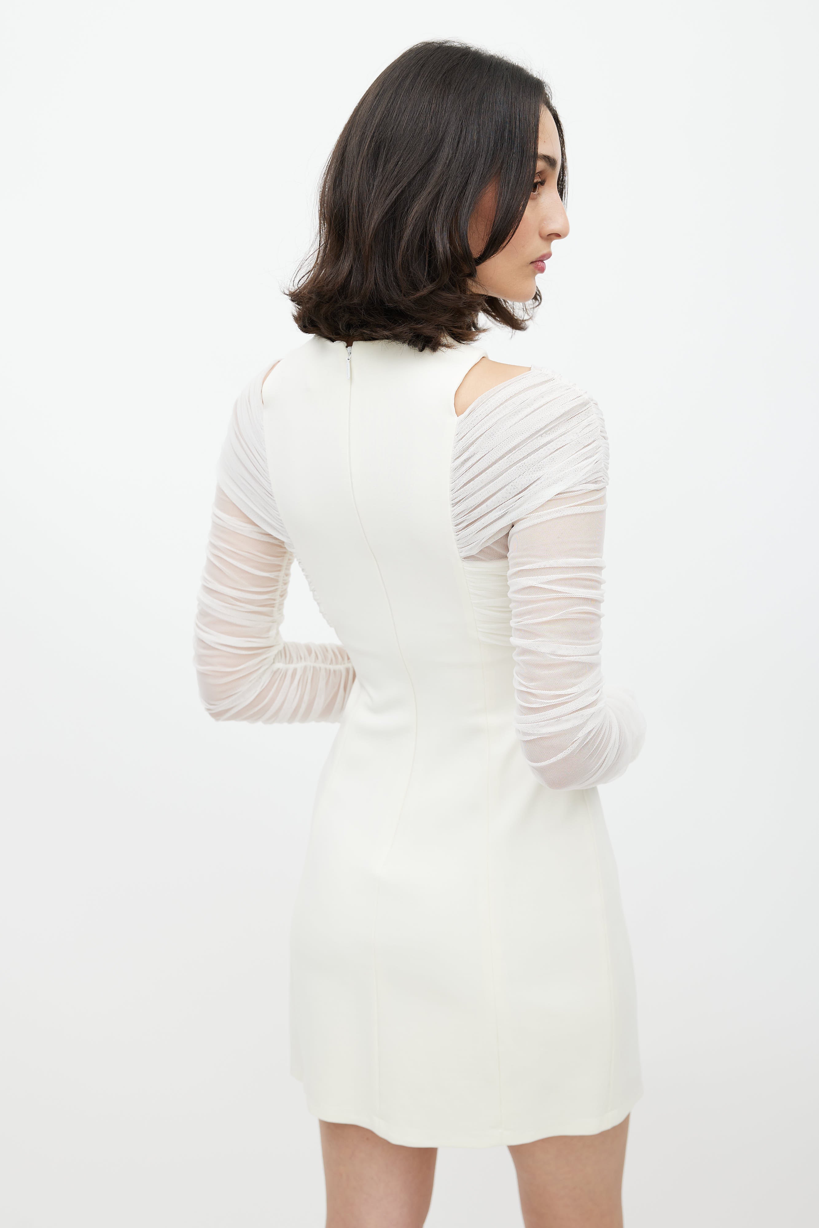 Pre-owned Versace cream dress featuring a round neckline, long gathered sleeves, mesh wrap detail at front, cut outs at shoulder, and zip at back with hook and eye closure. Lined.
